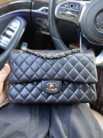 This is a replica CHANEL Classic 11.12 Flap Bag Lambskin & Gold-Tone Metal in Black. This classic double flap bag comes in smooth black lambskin featuring gold-tone hardware. Open pocket on the back. Closes with classic CC-turn-lock on the front. Zipper pocket inside the flap. Outside pocket on the front under the flap. A lipstick pocket against the back. CC stitching on the inside flap. ,Size,