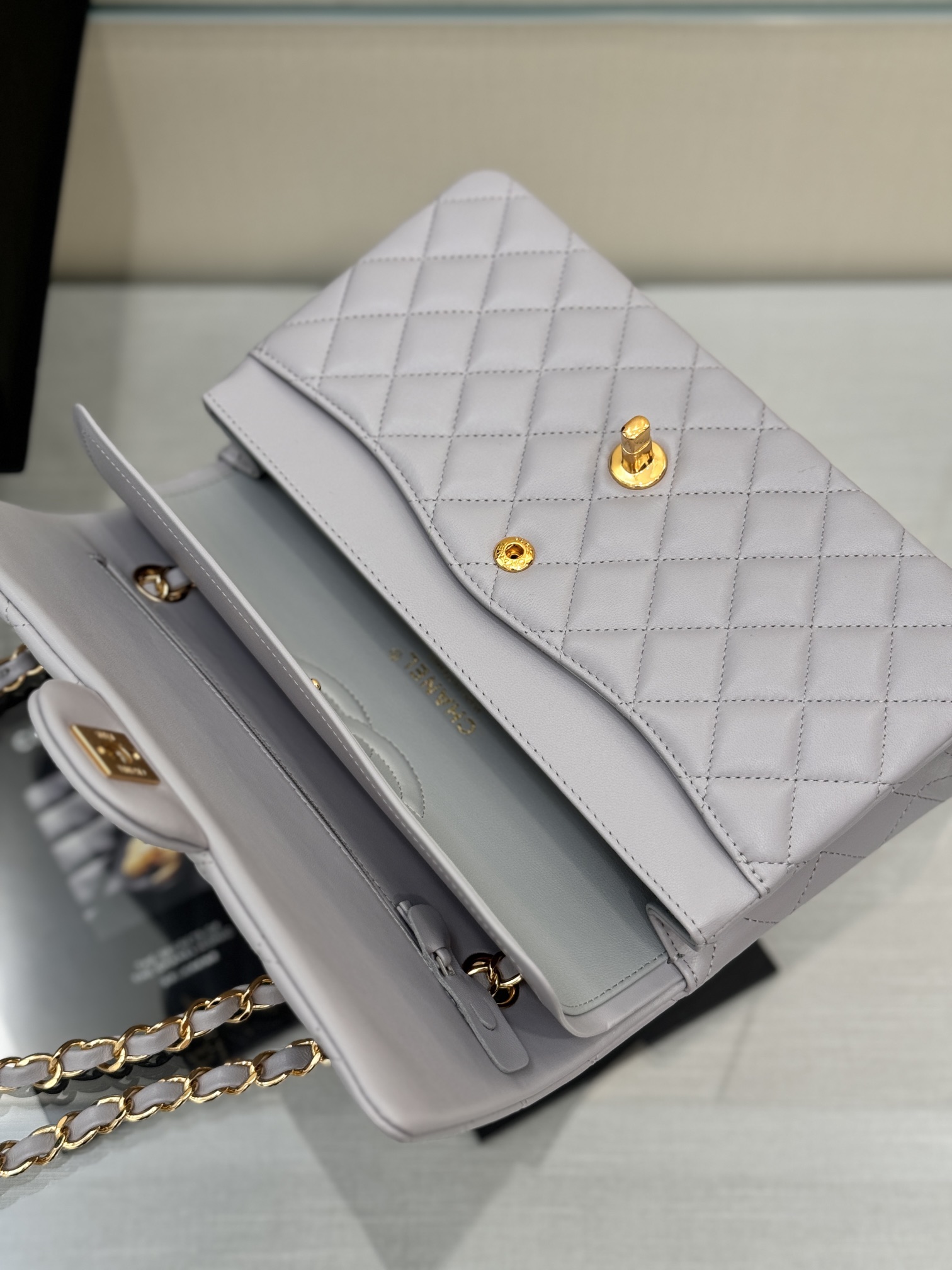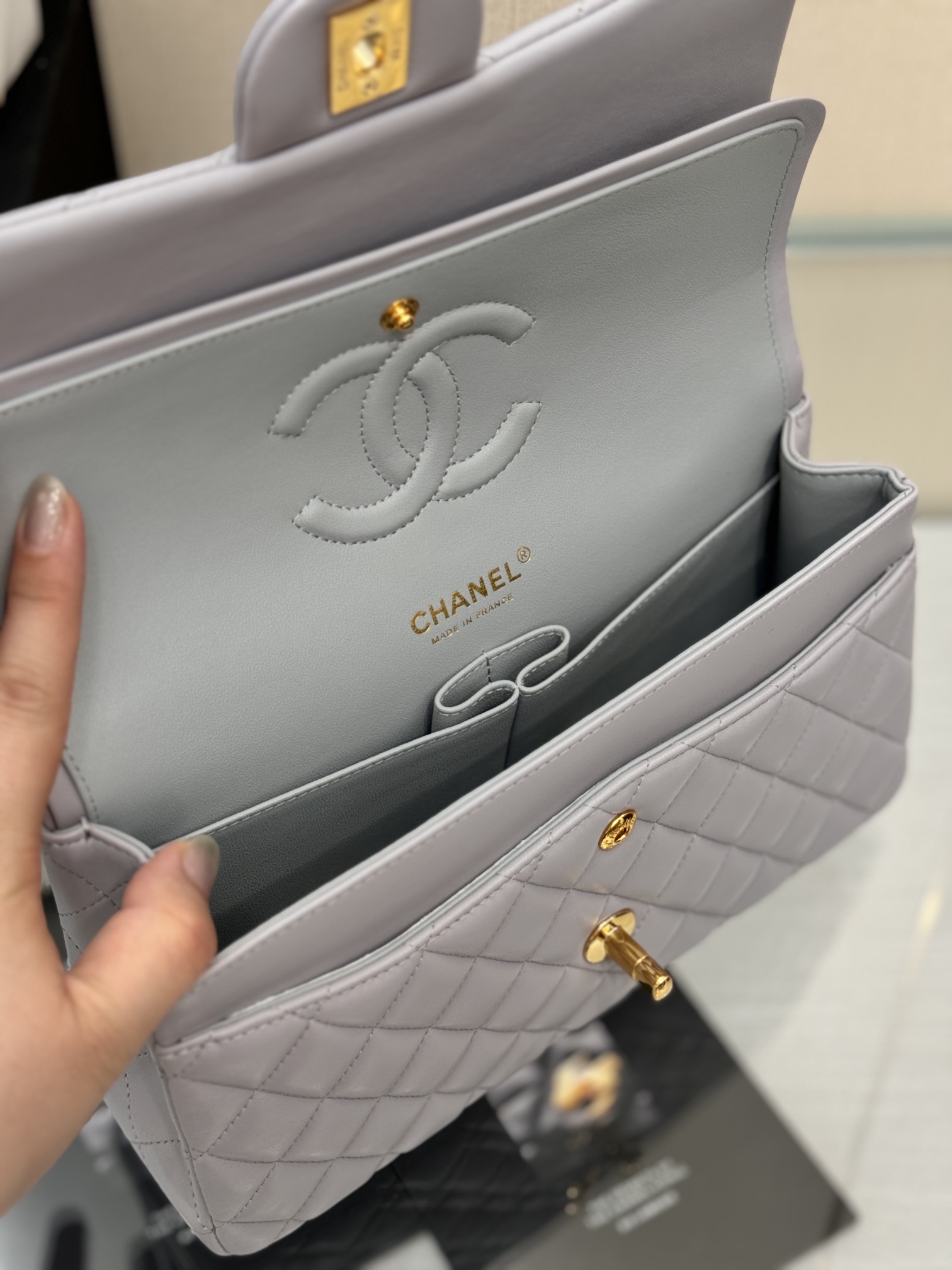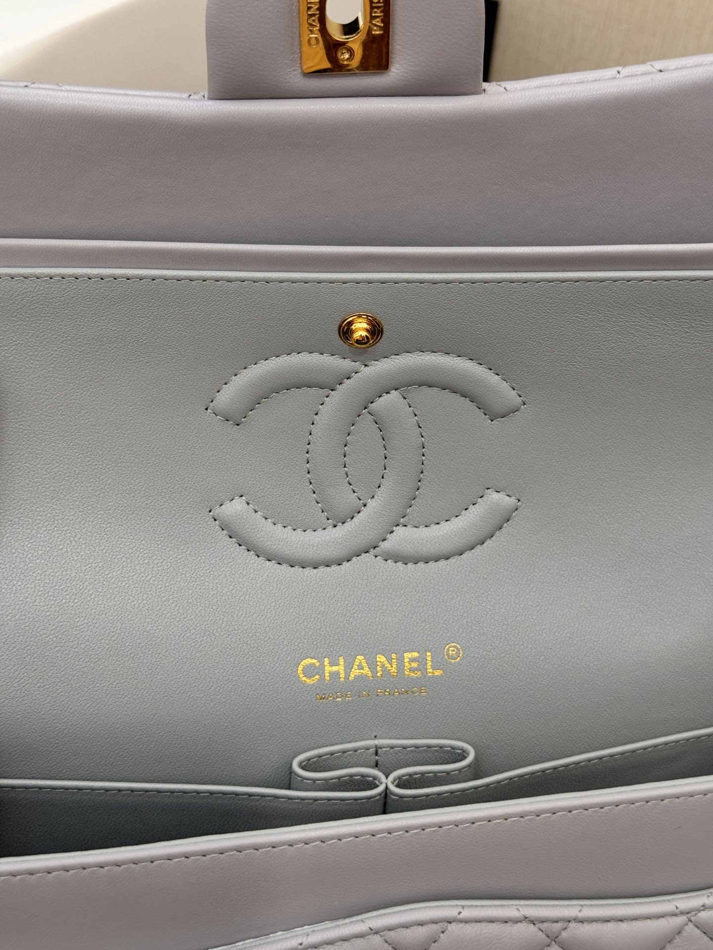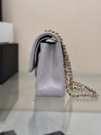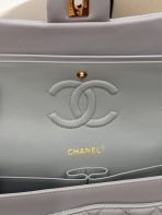 This is a replica CHANEL Classic 11.12 Flap Bag Lambskin & Gold-Tone Metal in Grey. This classic double flap bag comes in smooth grey lambskin featuring gold-tone hardware. Open pocket on the back. Closes with classic CC-turn-lock on the front. Zipper pocket inside the flap. Outside pocket on the front under the flap. A lipstick pocket against the back. CC stitching on the inside flap. ,Size,