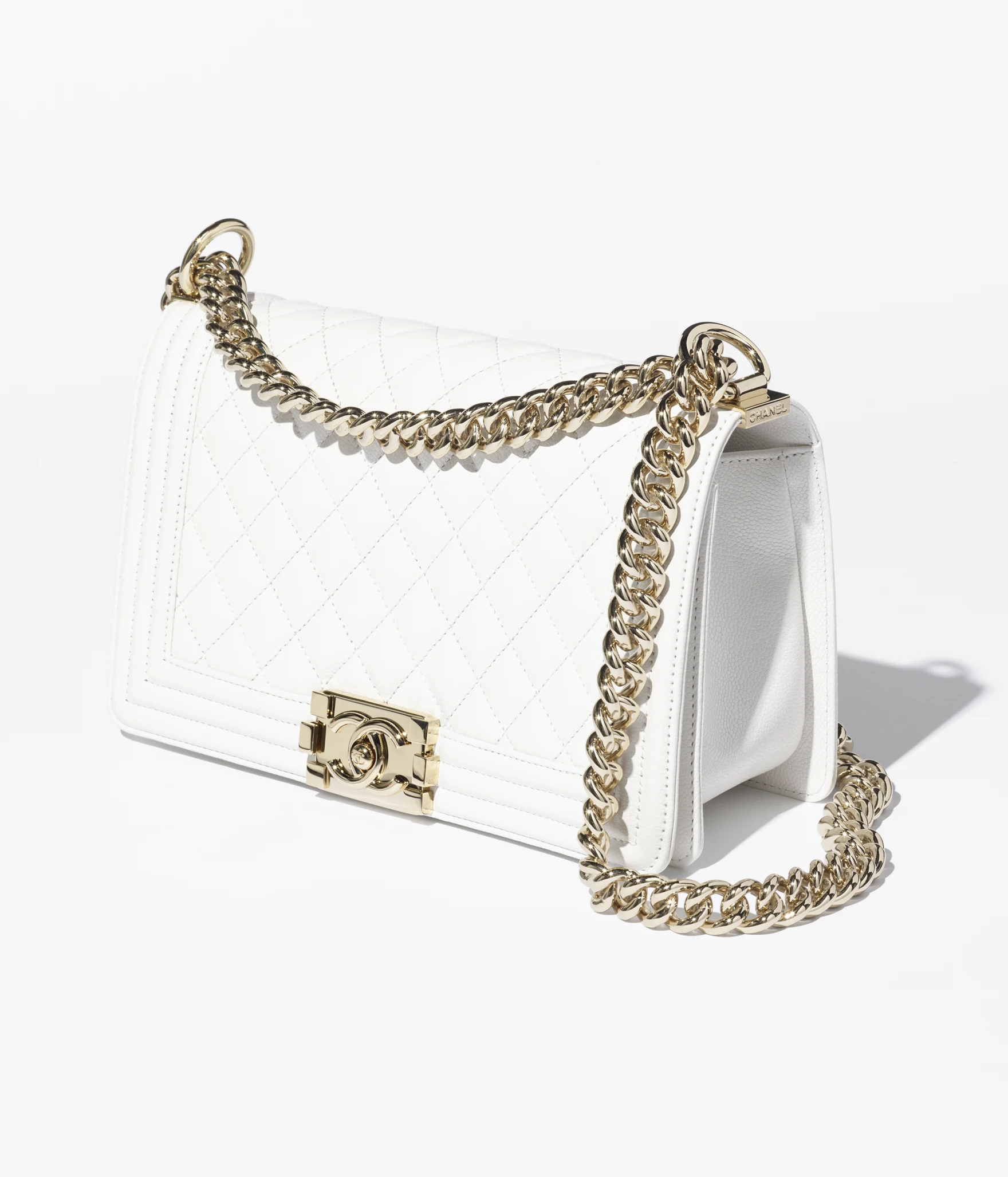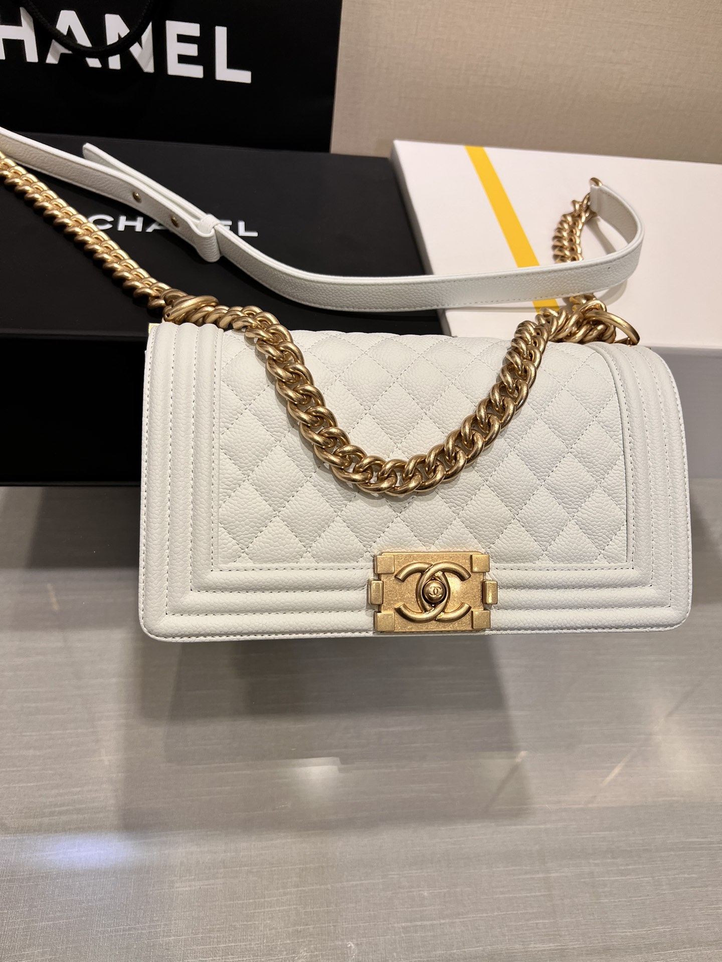 This is a replica CHANEL Classic Boy Flap Calfskin & oG Metal in White. This small boy flap bag comes in caviar black caviar calfskin featuring gold-tone hardware. Grosgrain Lining & Single Interior Pocket. ,Size: Classic,