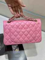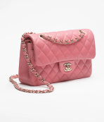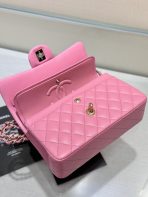 This is a replica CHANEL Small Classic Handbag Lambskin & Gold-Tone Metal in Pink. This small double flap bag comes in smooth pink lambskin featuring gold-tone hardware. Open pocket on the back. Closes with classic CC-turn-lock on the front. Zipper pocket inside the flap. Outside pocket on the front under the flap. CC stitching on the inside flap. ,