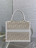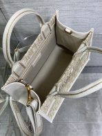 This is a replica CHRISTIAN DIOR Small Dior Book Tote in white. This tote combines Dior Oblique Embroidery and Calfskin. Embroidered adjustable and removable shoulder strap. ,
