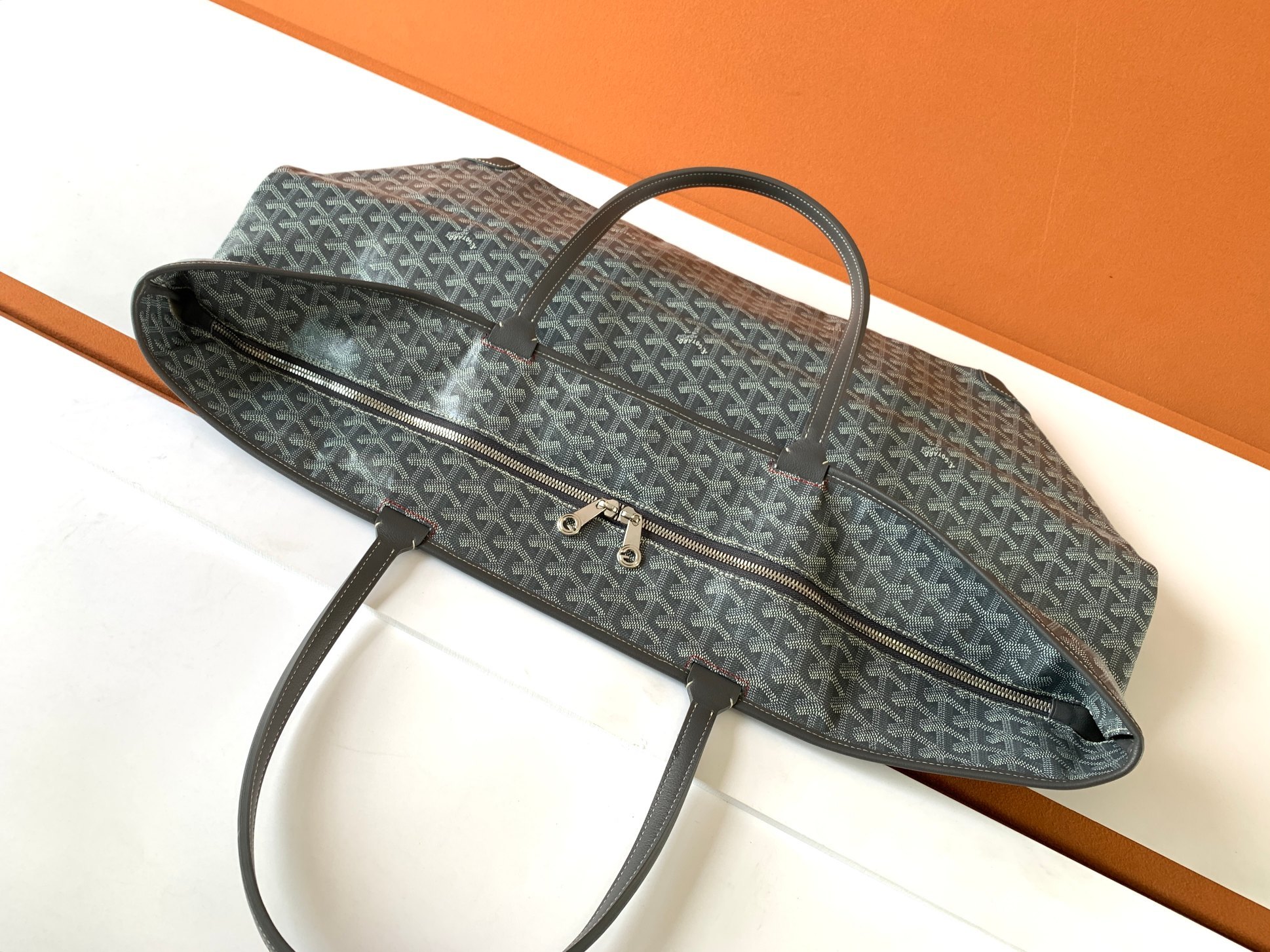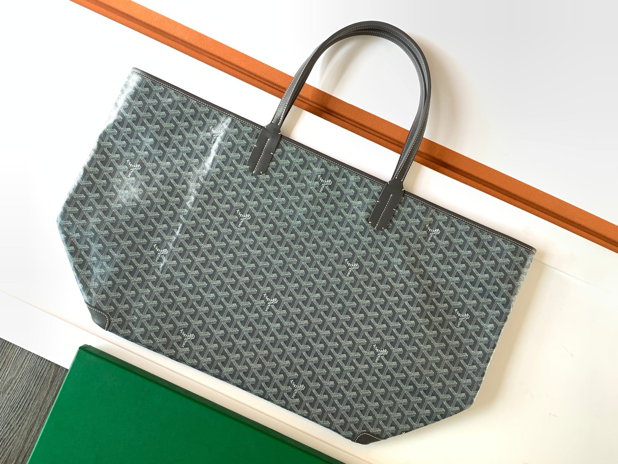 This is a replica GOYARD Artois GM Bag in grey. The Artois GM bag uses the aesthetic lines and codes of our Artois PM and MM bags in a travel format, ideal for a weekend or as carry-on luggage. The handles ensure comfort when worn over the shoulder. The zip closure has two lockable zips to secure the contents.,
