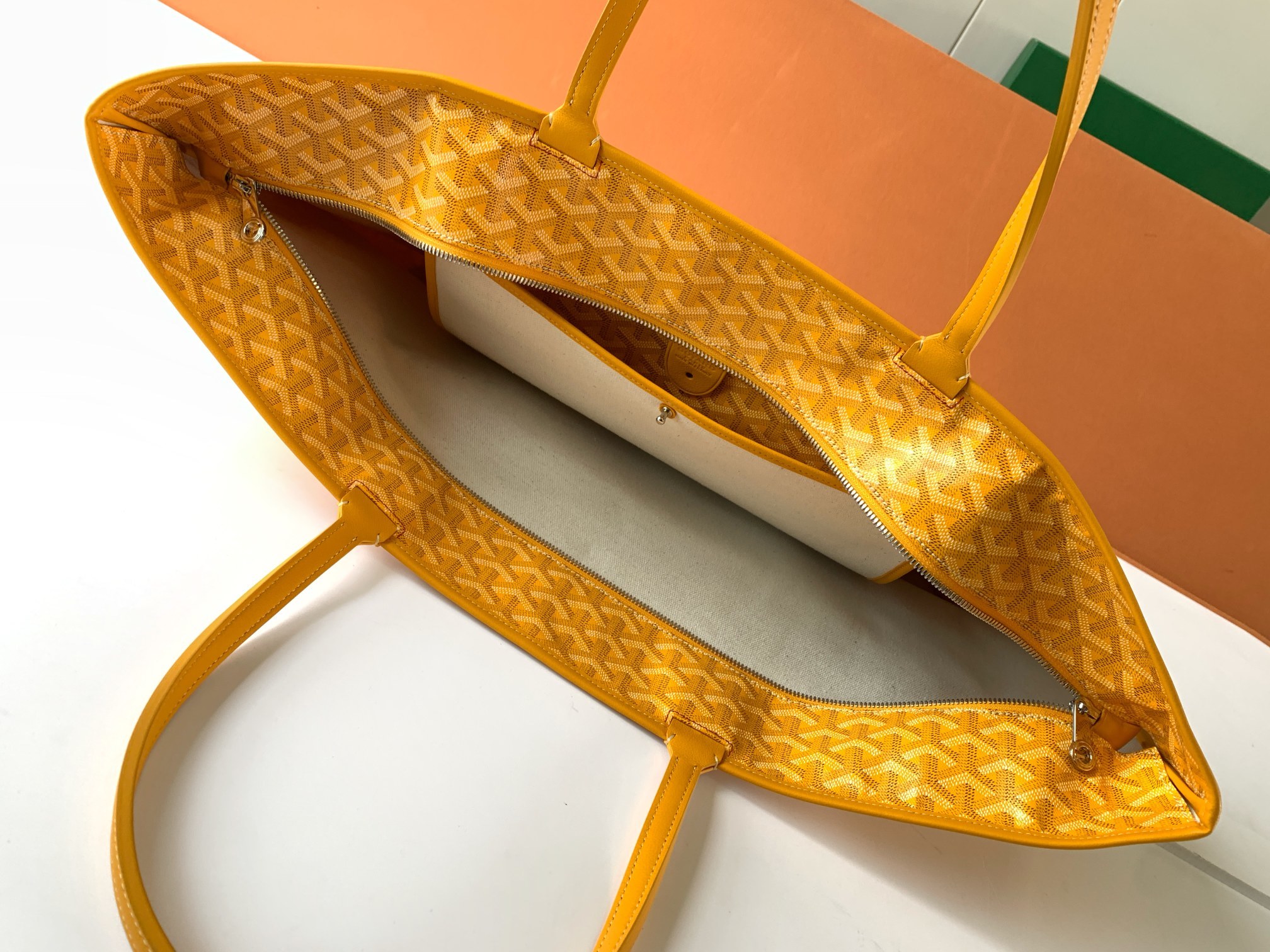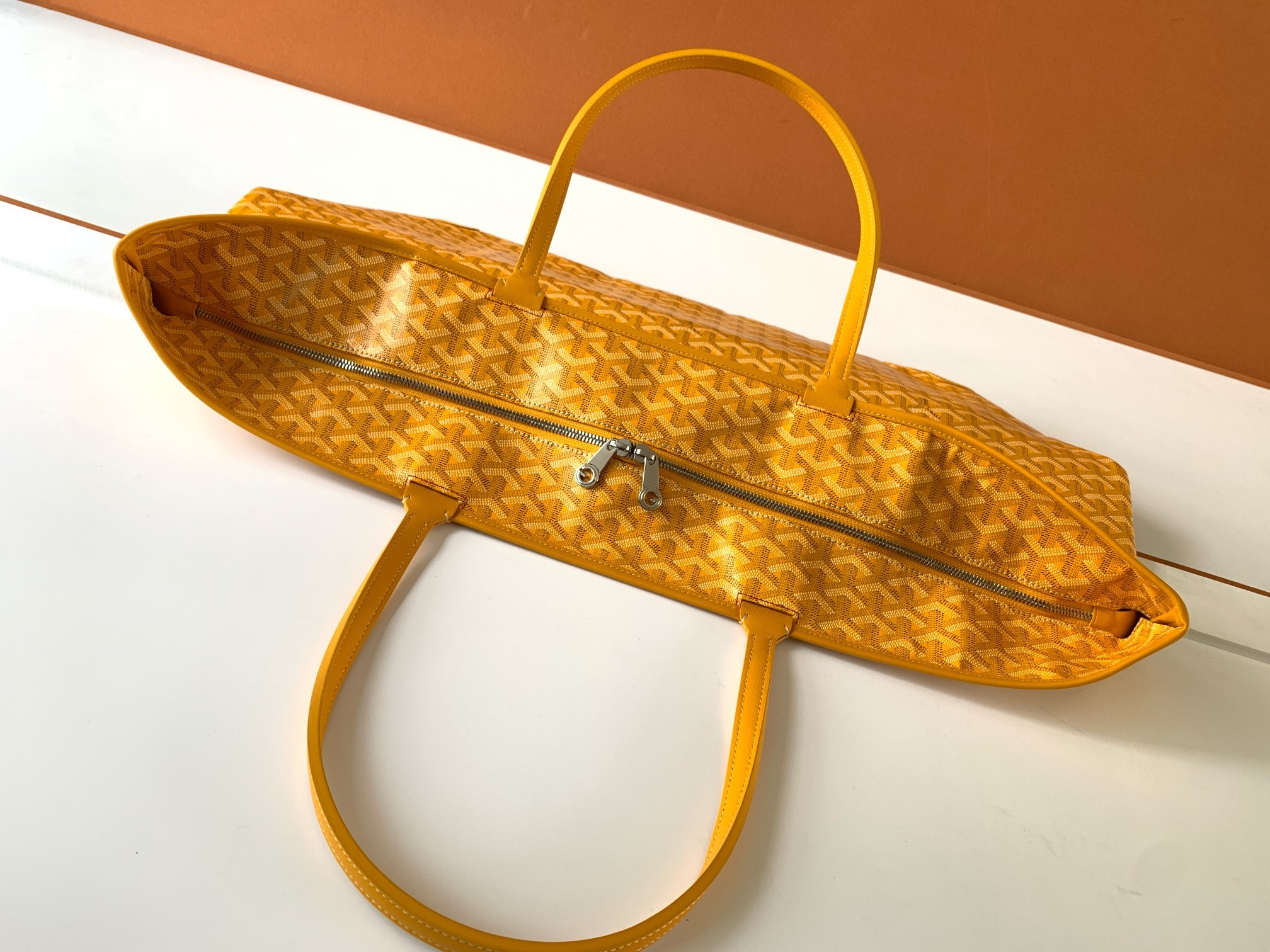 This is a replica GOYARD Artois GM Bag in yellow. The Artois GM bag uses the aesthetic lines and codes of our Artois PM and MM bags in a travel format, ideal for a weekend or as carry-on luggage. The handles ensure comfort when worn over the shoulder. The zip closure has two lockable zips to secure the contents.,