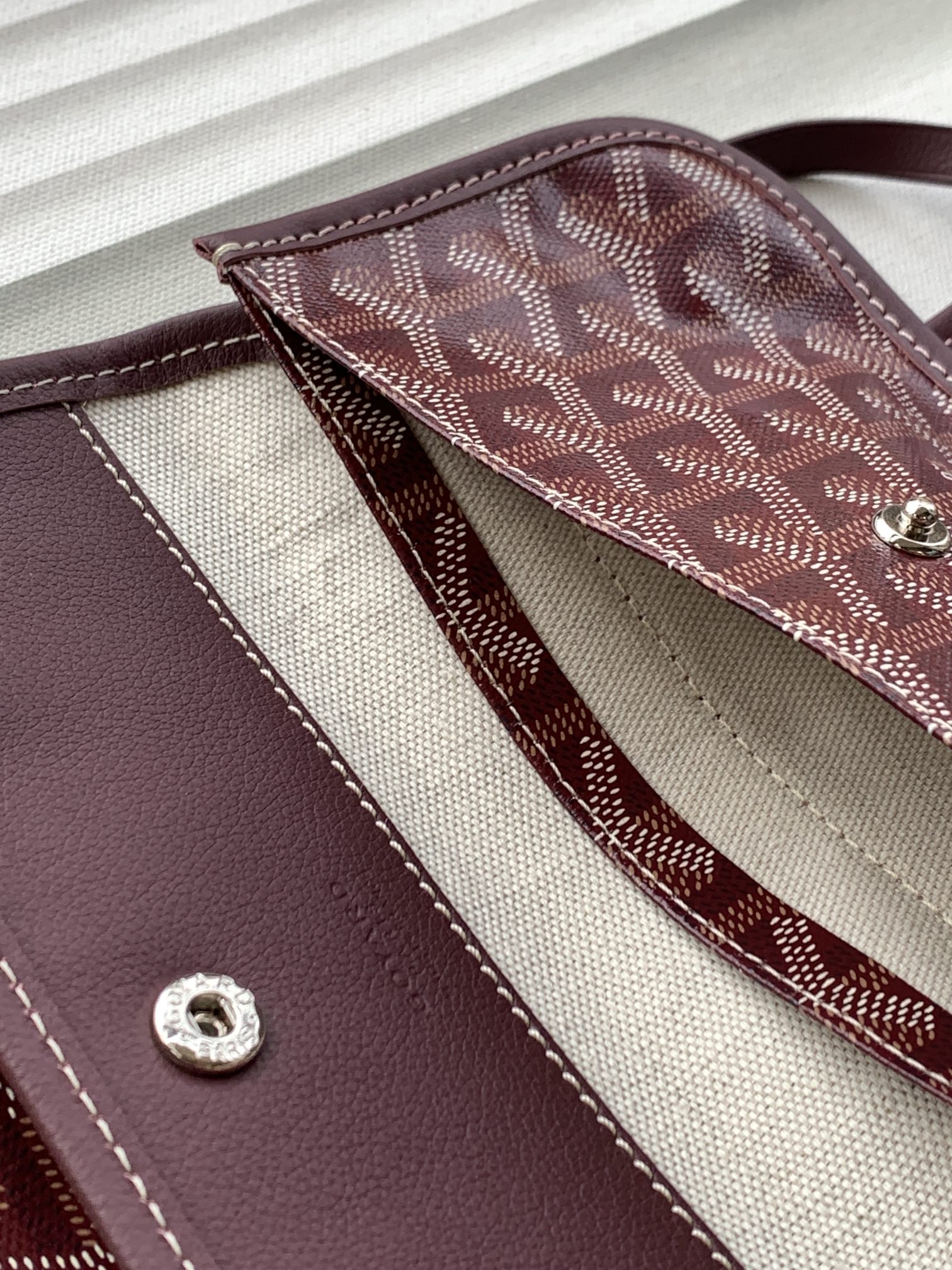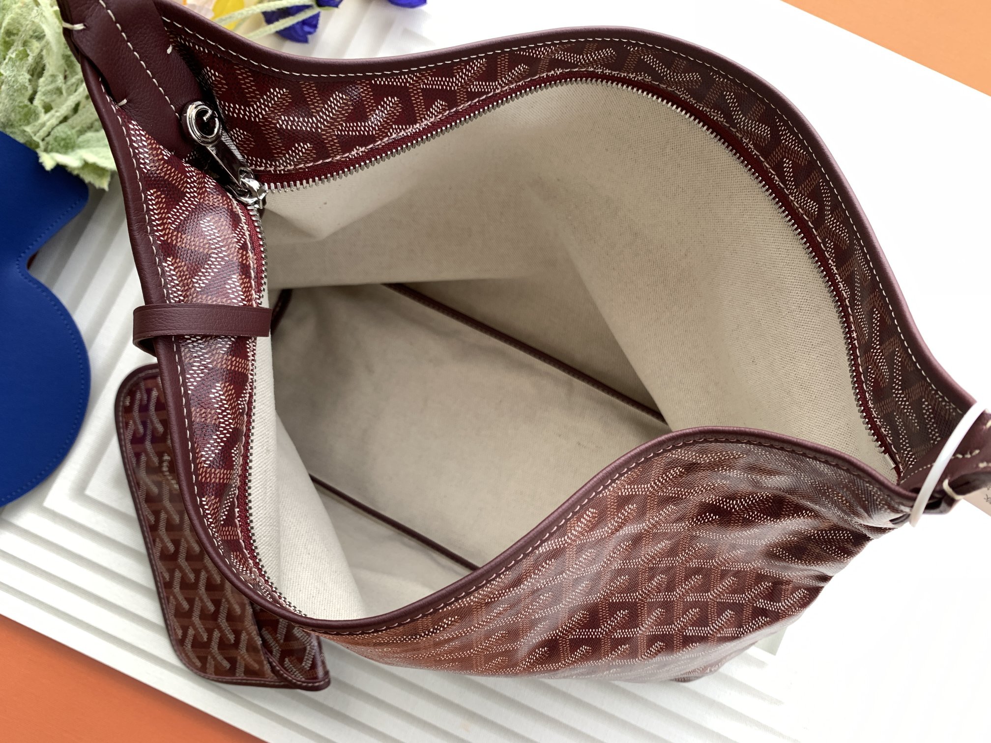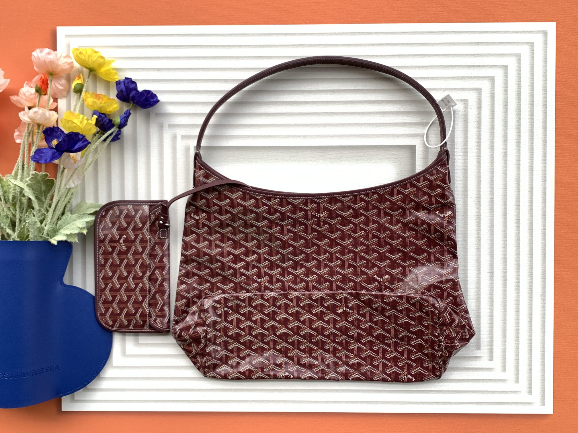 This is a replica GOYARD Bohème Hobo Bag in burgendy. The Bohème Hobo bag epitomizes lightness, flexibility, and safety thanks to its zip closure. It is very comfortable as a shoulder bag thanks to its wide handle. It also features the emblematic removable pouch that closes with a snap fastener.,