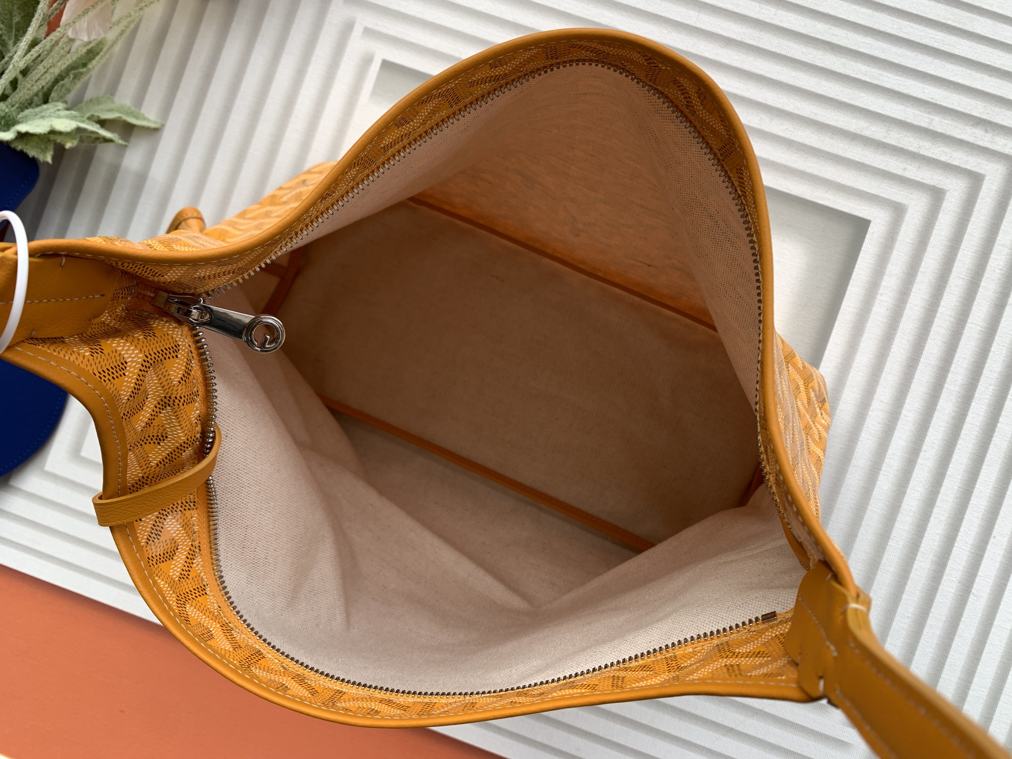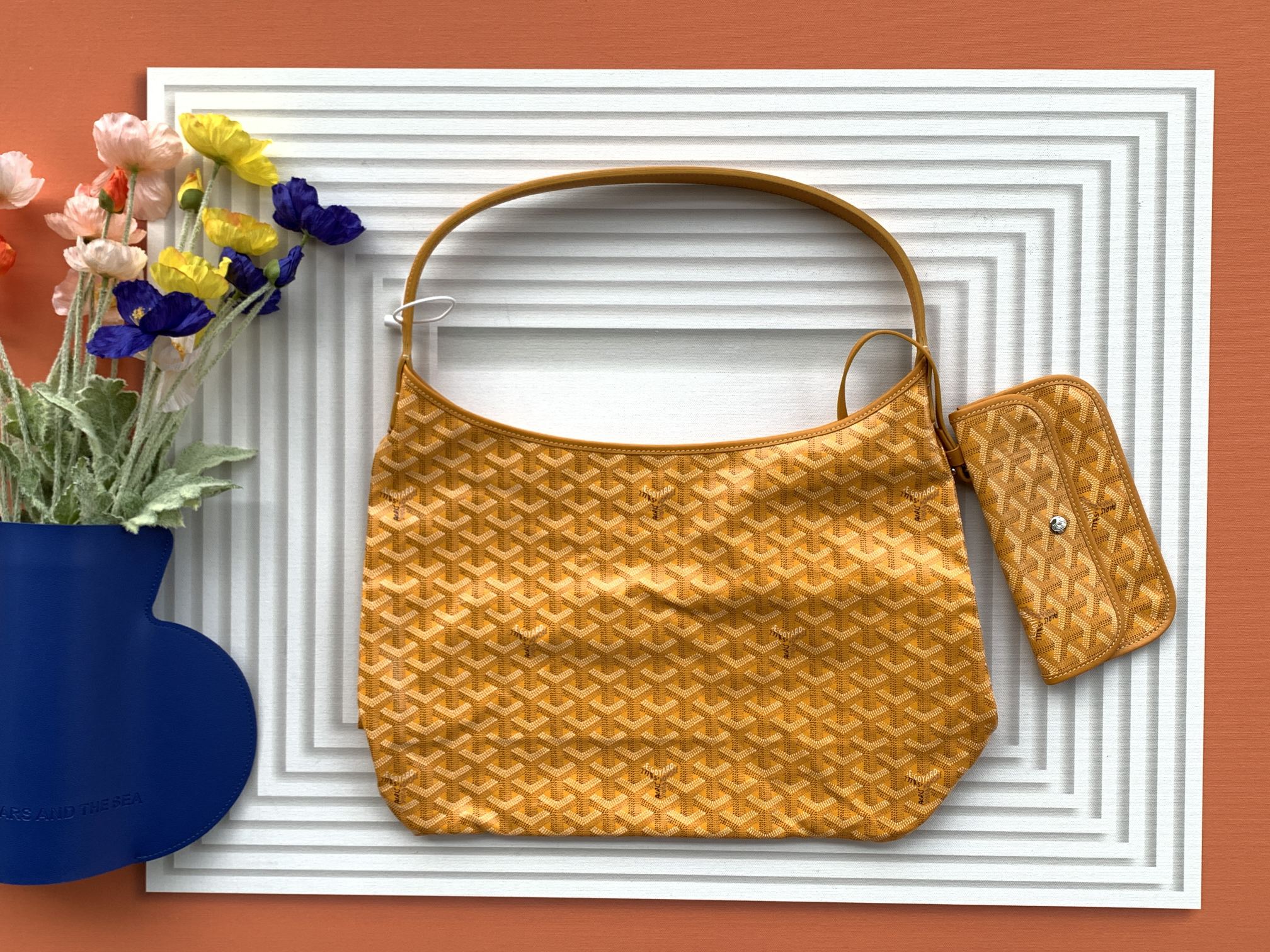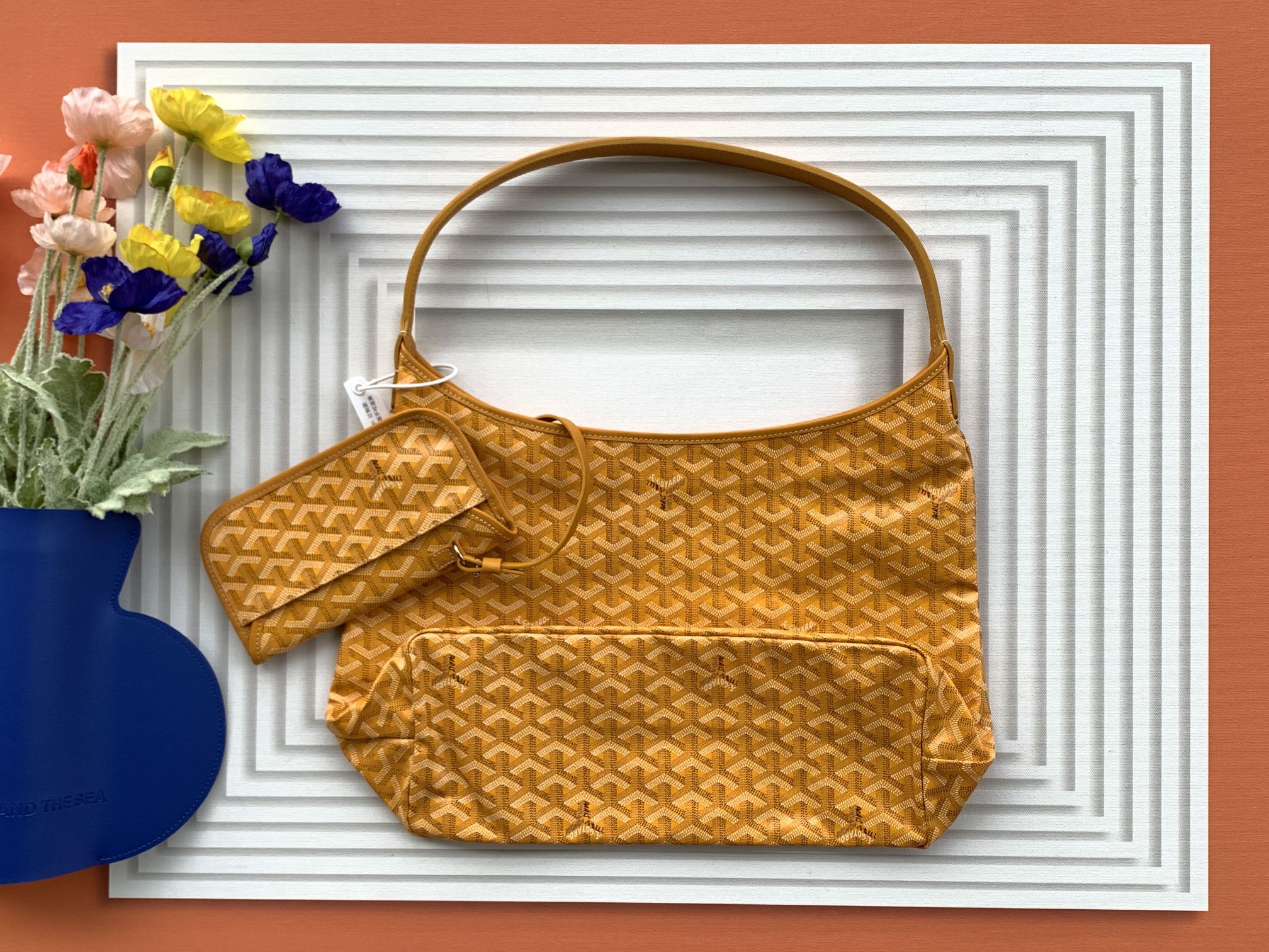 This is a replica GOYARD Bohème Hobo Bag in yellow. The Bohème Hobo bag epitomizes lightness, flexibility, and safety thanks to its zip closure. It is very comfortable as a shoulder bag thanks to its wide handle. It also features the emblematic removable pouch that closes with a snap fastener.,