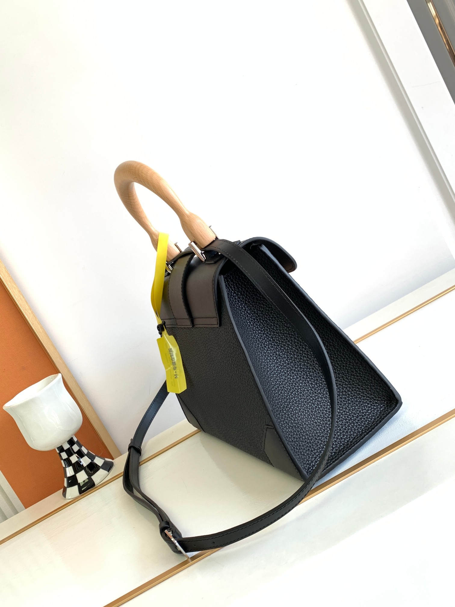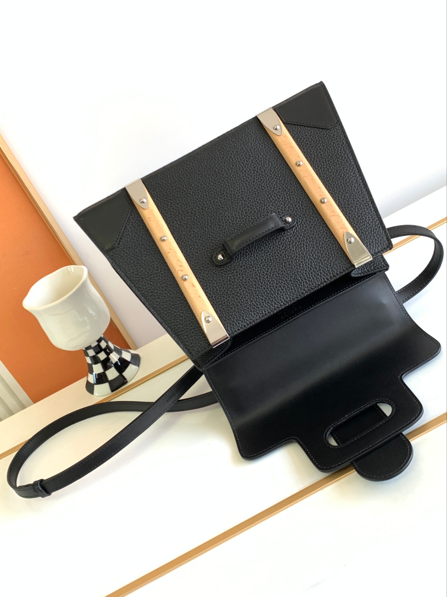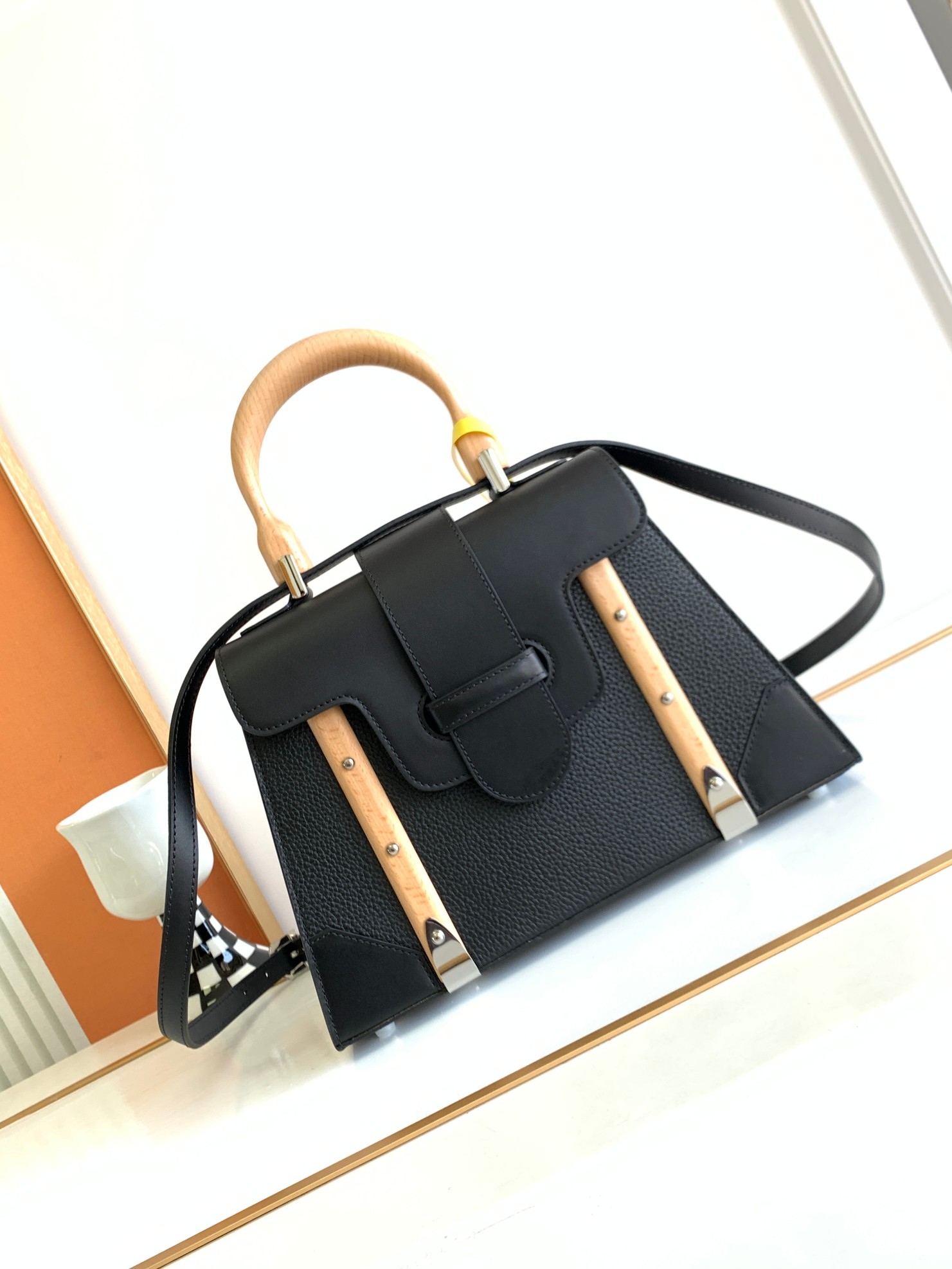 This is a replica GOYARD Saïgon PM Bag in black calfskin leather. The Saïgon bag is one of Maison Goyard’s emblematic pieces as it inherits all our trunk-making signature codes like the wood batons, leather corners and trunk rivets. In this structured PM size, the Saïgon bag can be worn with or without a strap for a chic and elegant style.,