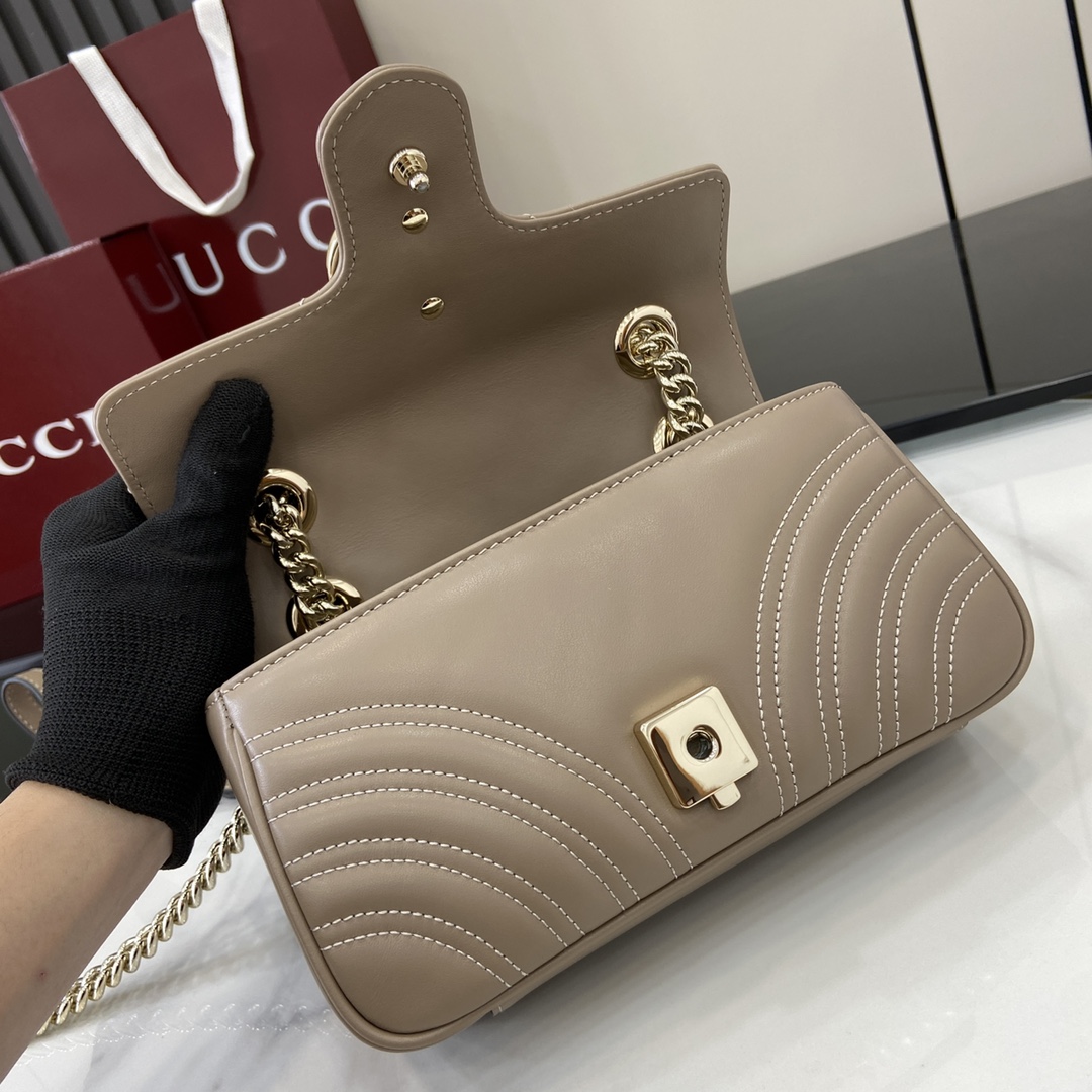 This is a replica GUCCI GG Marmont mini shoulder bag in taupe leather. Light gold toned hardware. ,Size: Mini,