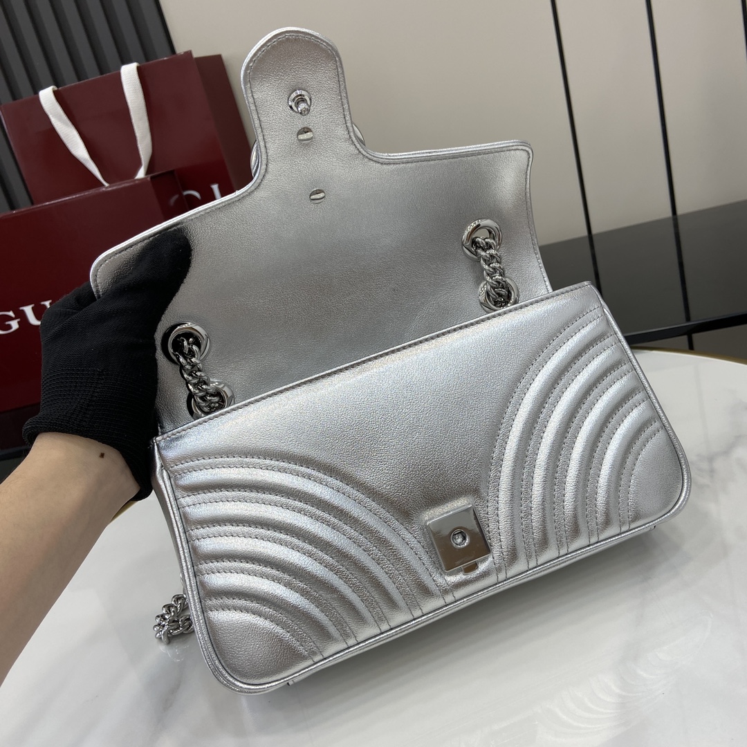 This is a replica GUCCI GG Marmont small shoulder bag in metalic silver leather. Silver-toned hardware. ,Size: Small,
