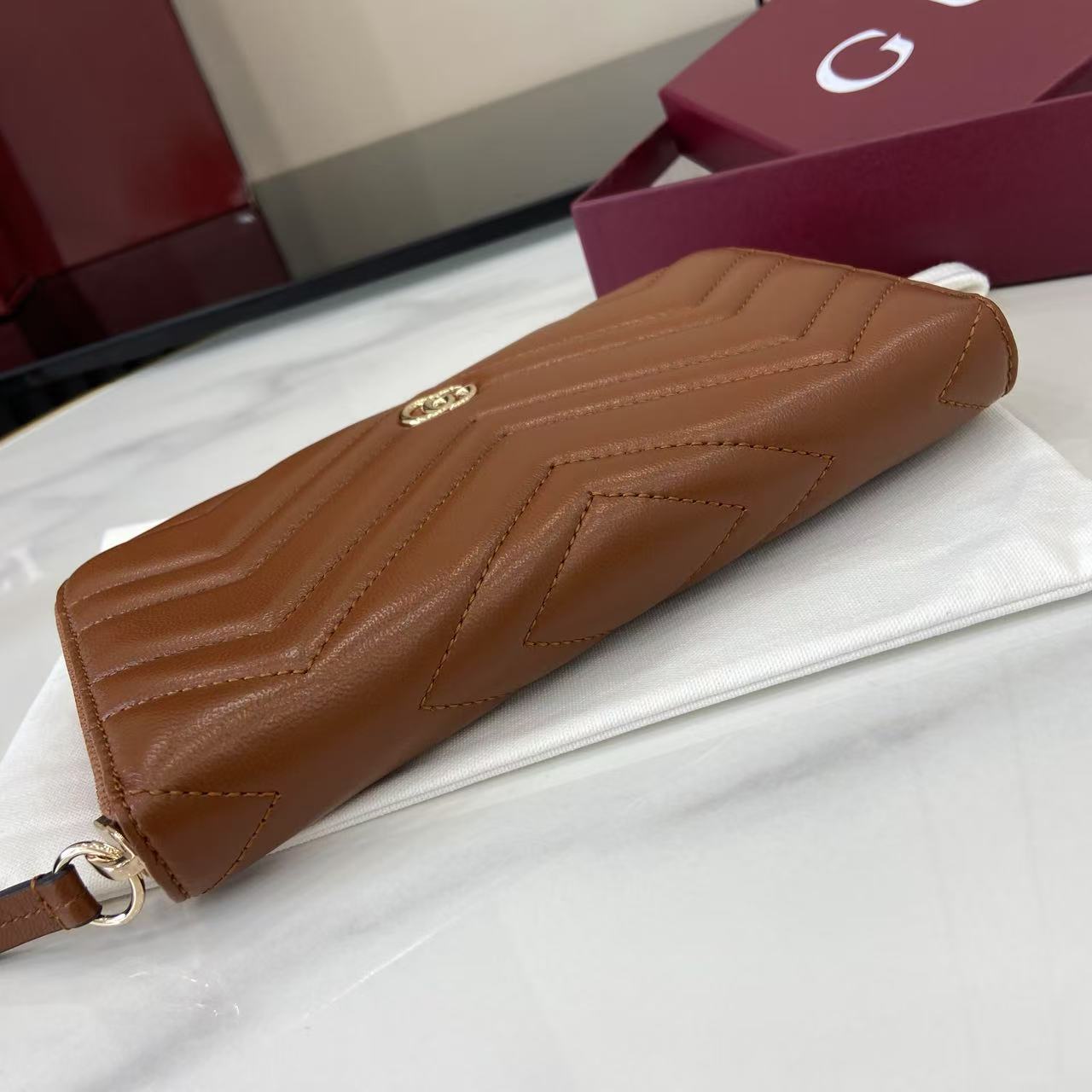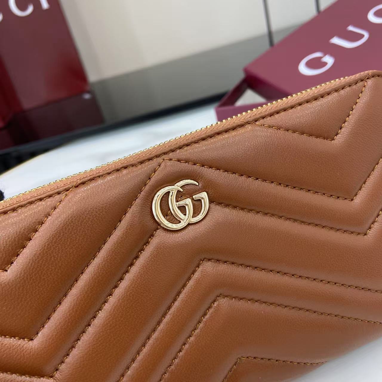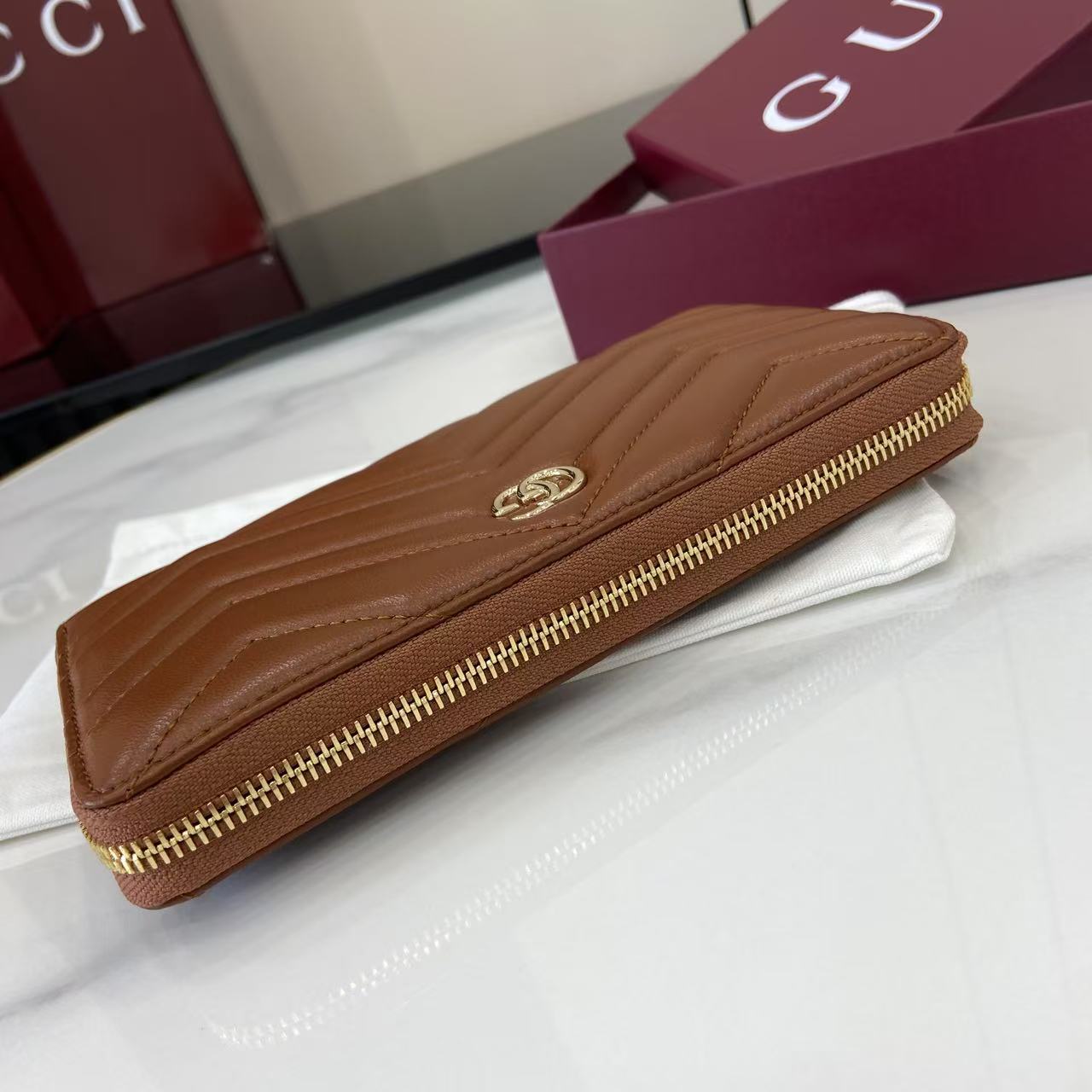 ,Brown matelassé chevron leather,Light gold-toned hardware,Brown taffeta lining,Double G,12 card slots and three bill compartments,Zip coin pocket,Zip around closure,Weight: 0.50lbs approximately,7.5″W x 4.1″H x .8″D
