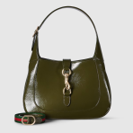 This is a replica GUCCI Jackie 1961 Small Shoulder Bag in Forest green patent leather. Crafted from fine leather which highlights its craftsmanship, it comes in crescent shape, and sleek silhouette. Light gold-toned hardware, leather trim, and an additional strap featuring the green and red Web.,Size,