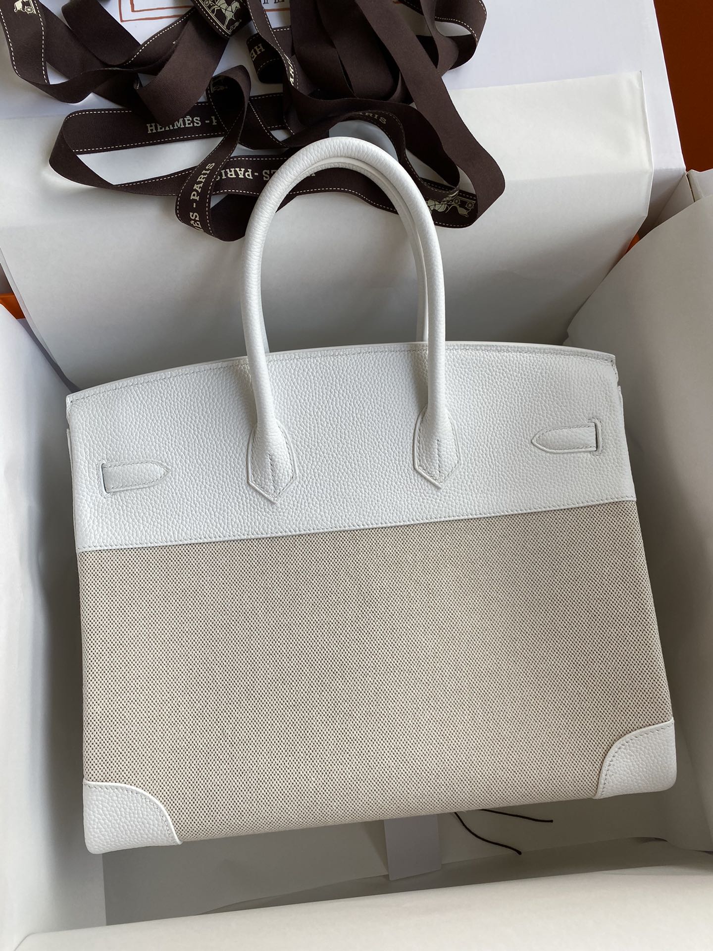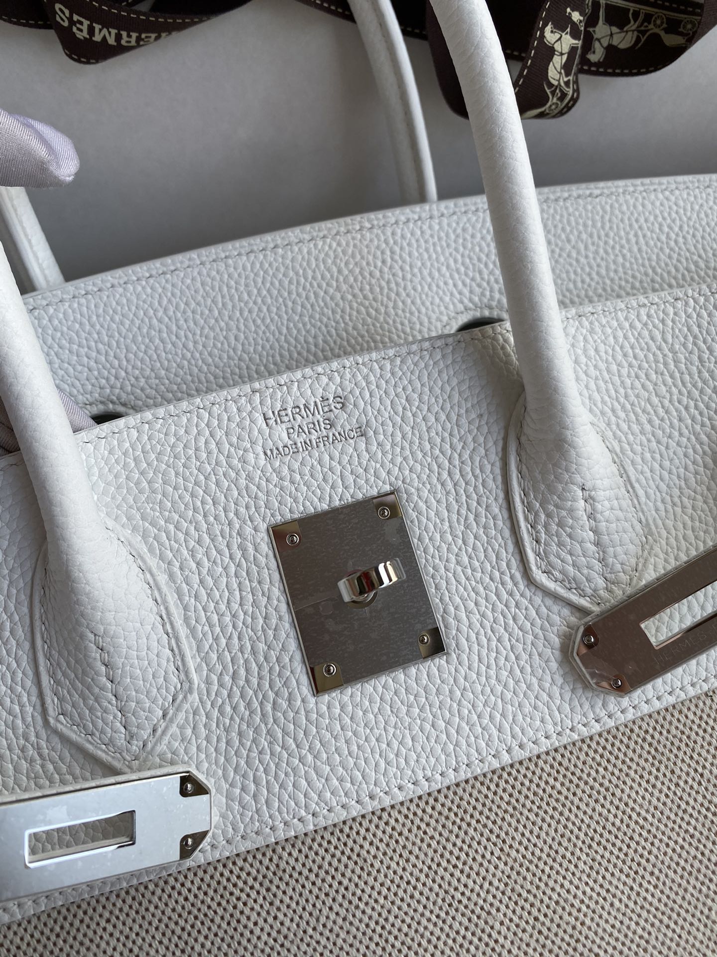 ###This Birkin is in White togo leather and Craie canvas with Palladium hardware and has tonal stitching, front flap, two straps with center toggle closure, clochette with lock and two keys, and double rolled handles.###