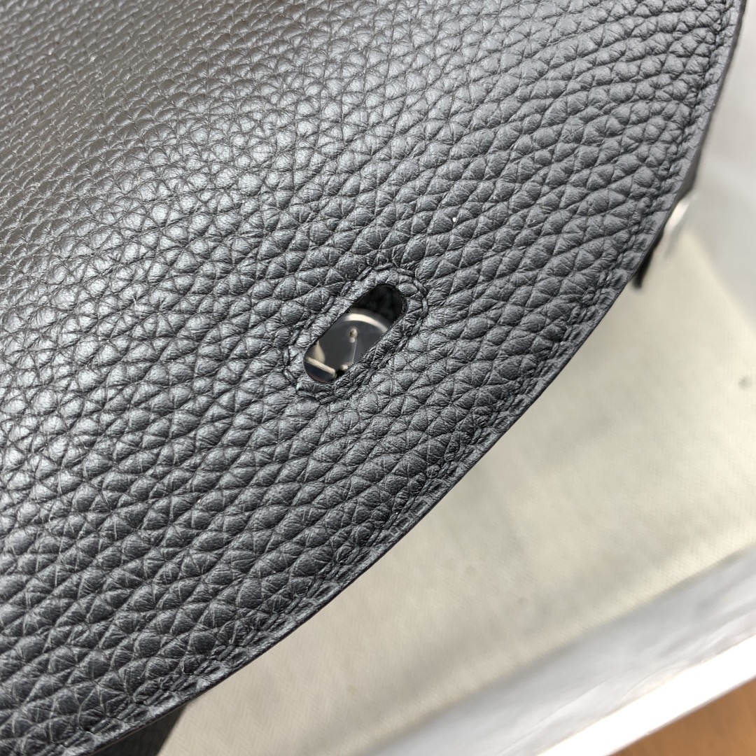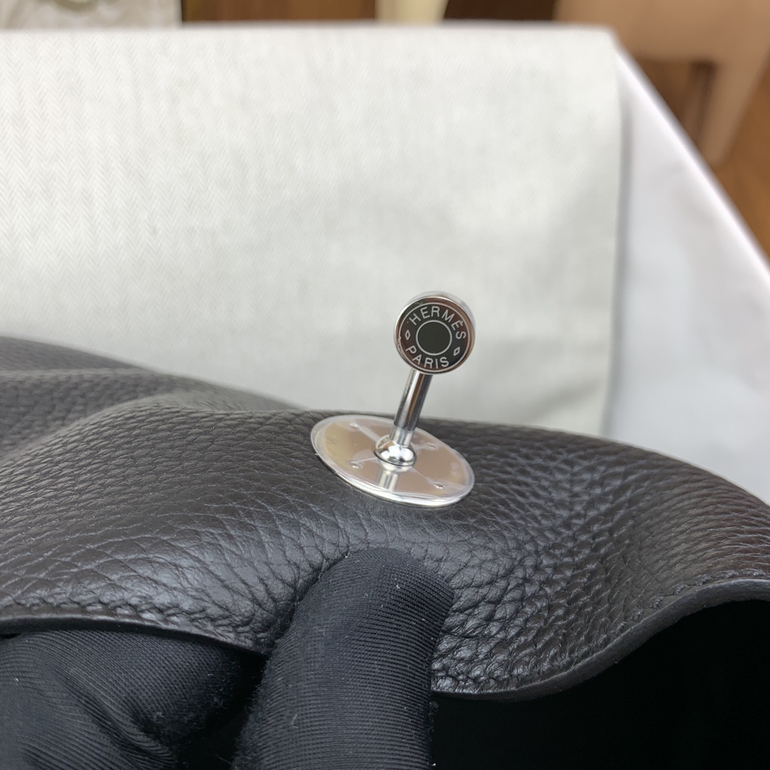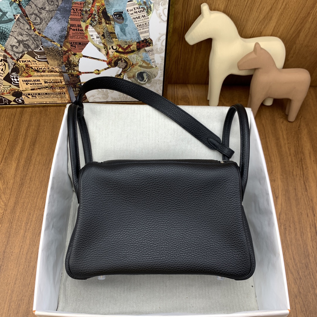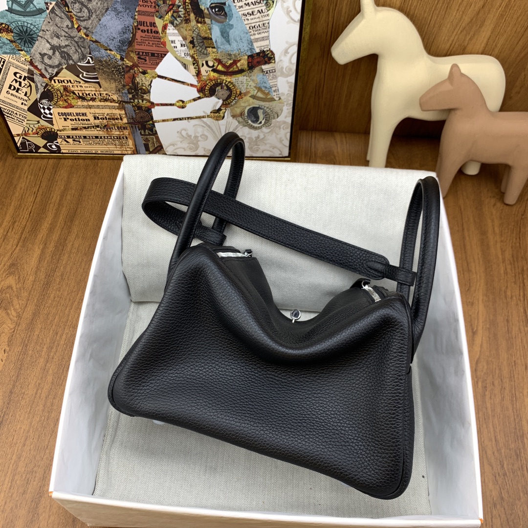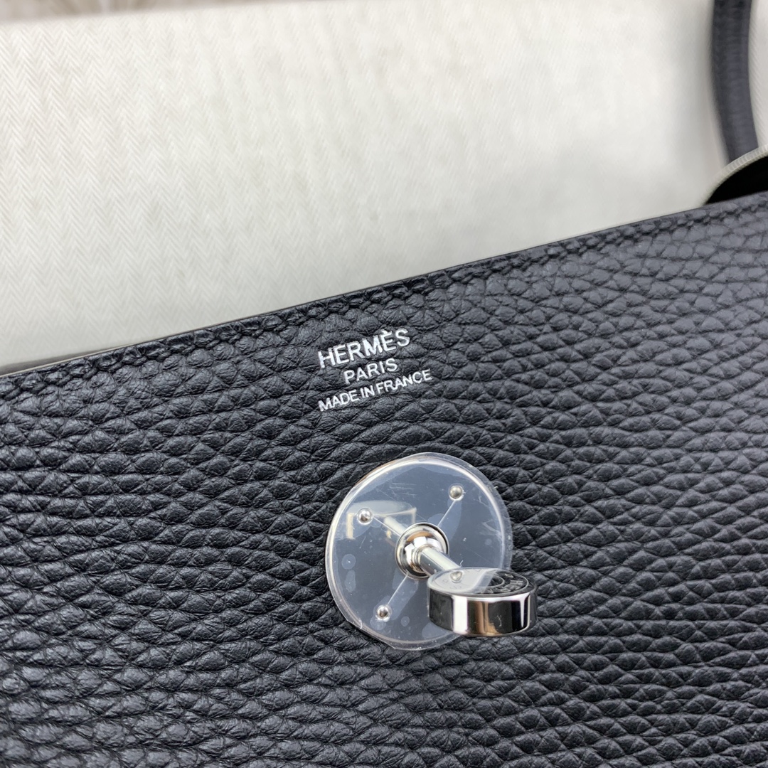 ###This Lindy is of Noir clemence with palladium hardware and features contrast stitching, double zipper pulls, center Hermès twist lock closure, five palladium feet, and two top handles that are linked by a removable shoulder strap.###