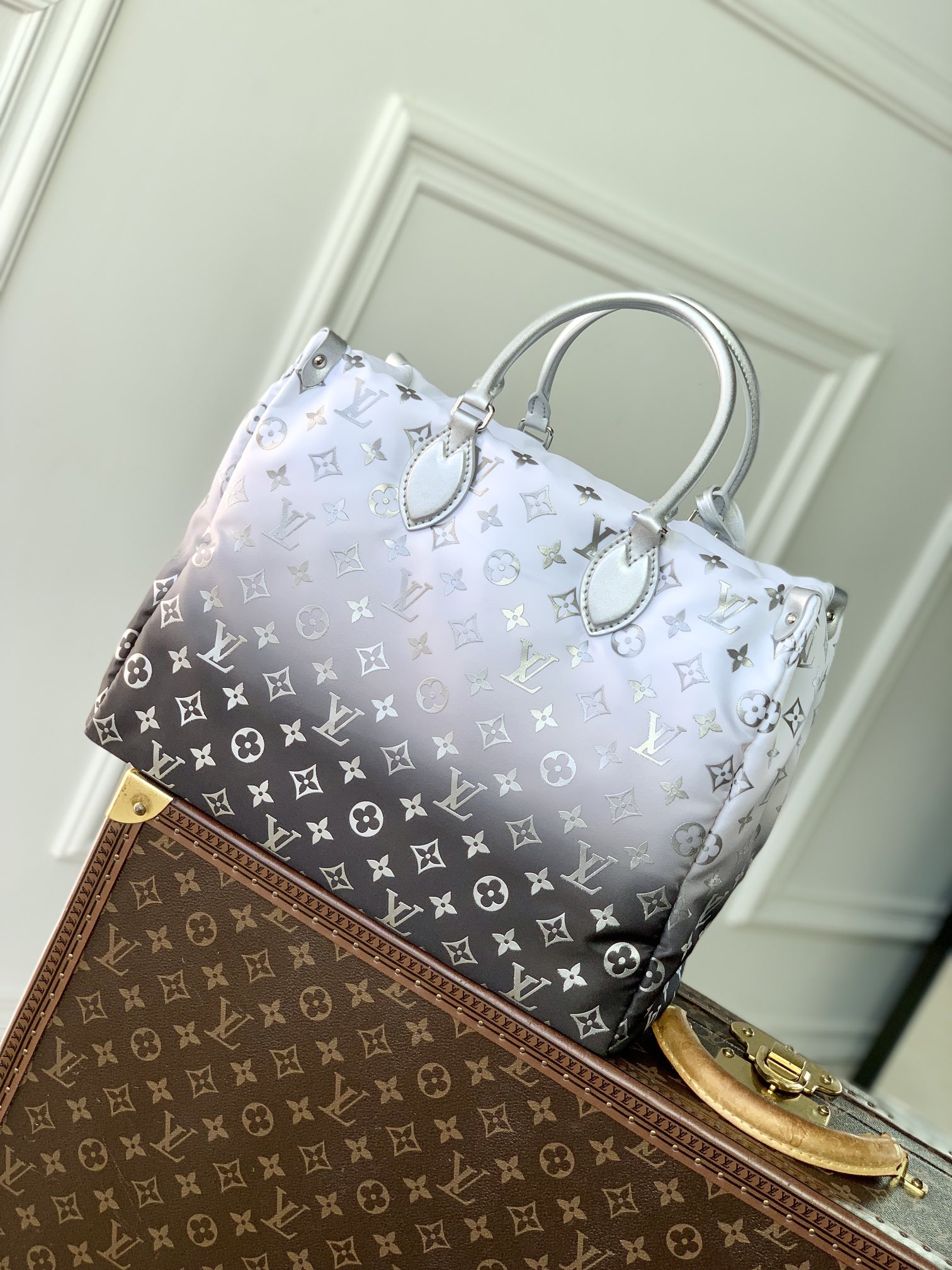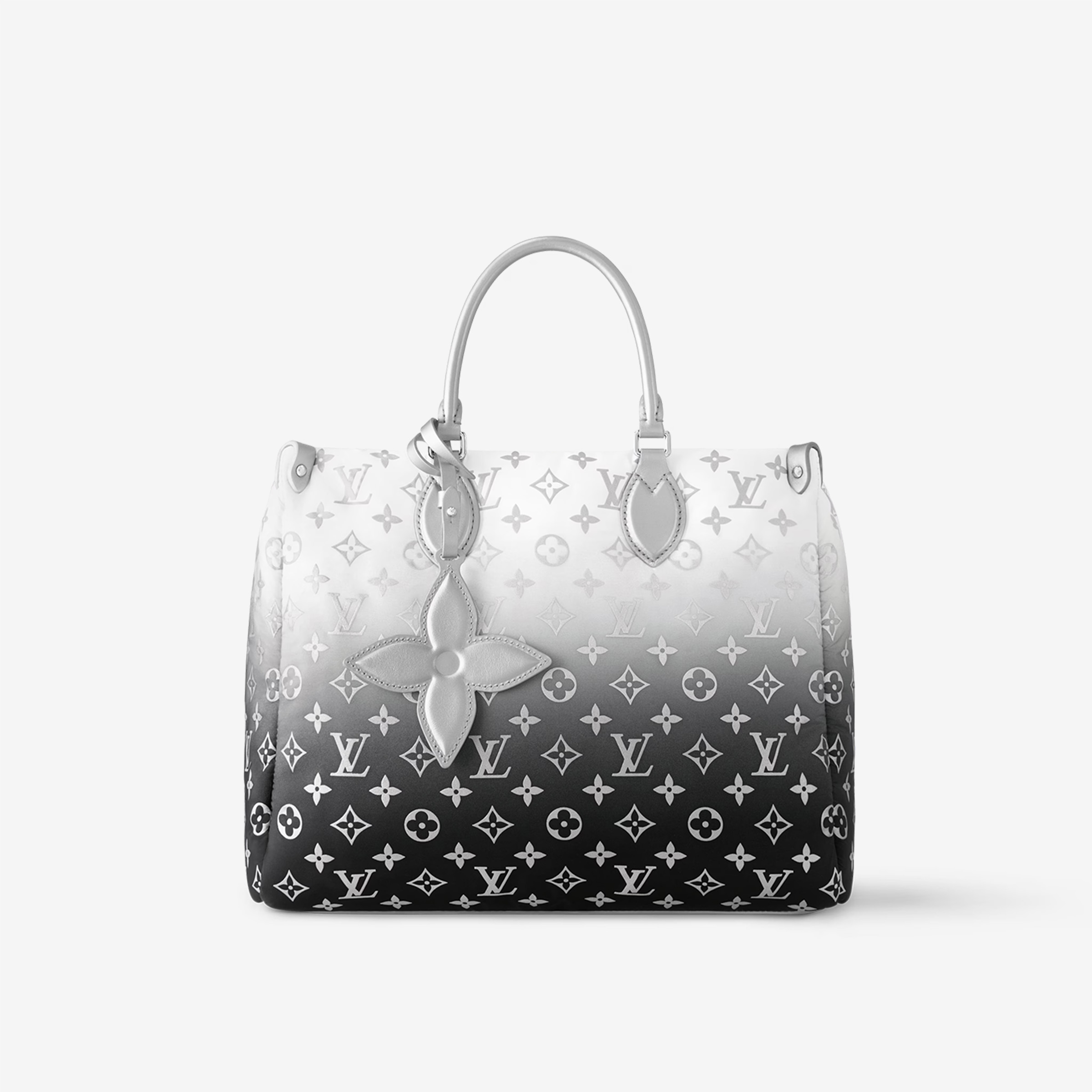 This is a replica LOUIS VUITTON M11847 OnTheGo MM. ,13.8 x 10.6 x 5.5 inches ,Frost,Monogram Nylon,Leather trim,Polyester lining,Silver-toned hardware,1 inside flat zipped pocket,1 inside double pocket,4 riveted corner tabs,1 leather flower charm,Fits: Smartphone, laptop 13’’, keys, Zippy wallet and earphones,Handle:Double