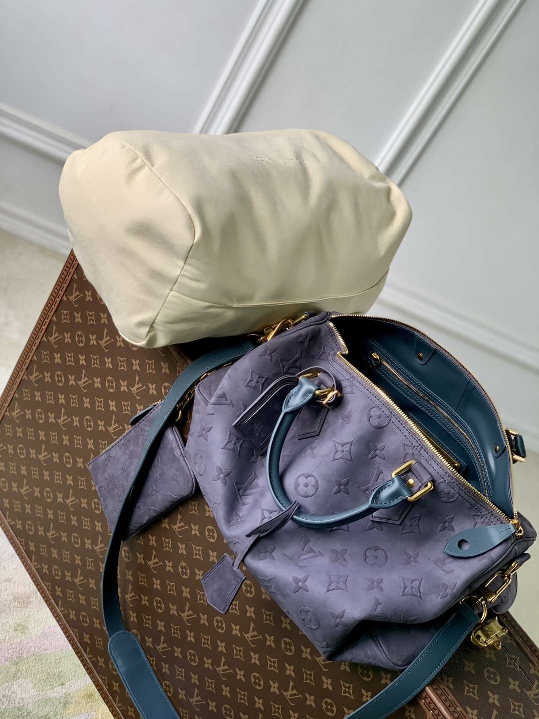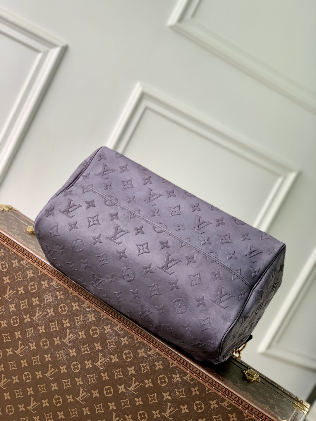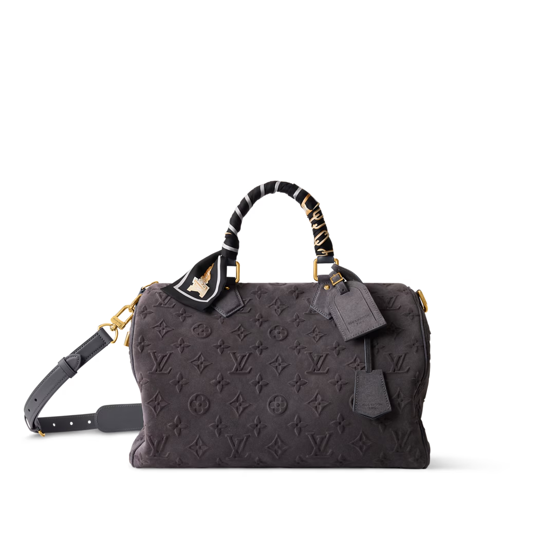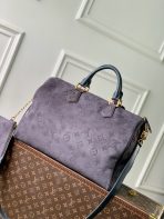 This is a replica LOUIS VUITTON M15225 Speedy P9 Bandoulière 40. ,40 x 26 x 23 cm ,Grey,Suede,Cowhide leather trim,Lambskin leather lining,Coloured hardware,Main compartment with lock,Flat inside trio pocket,Zipped inside pocket,Removable pouch in leather,Name tag,Key bell,Strap: Removable, adjustable,Strap Drop: 46.0 cm,Strap Drop Max: 60.0 cm,Handle: Single x2