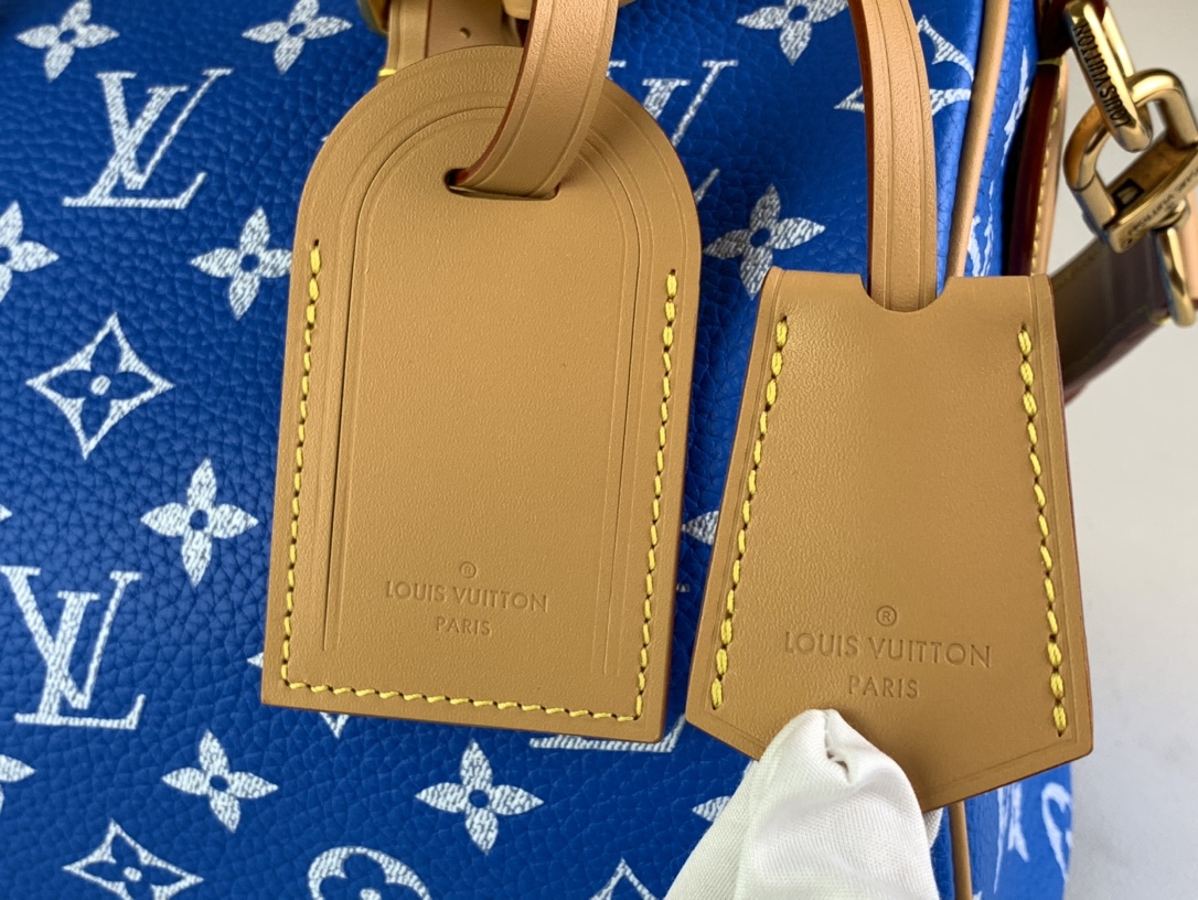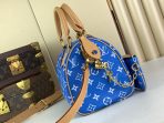 This is a replica LOUIS VUITTON M24424 Speedy P9 Bandoulière 25. ,9.8 x 7.5 x 5.9 inches ,Blue,Soft calfskin,Natural cowhide-leather trim,Lambskin lining,Gold-color hardware,Main compartment with lock,Inside zipped pocket,Removable pouch in leather,Name tag,Key bell,Strap:Removable, adjustable,Strap drop:21.7 inches,Strap drop max:24.8 inches,Handle:Double