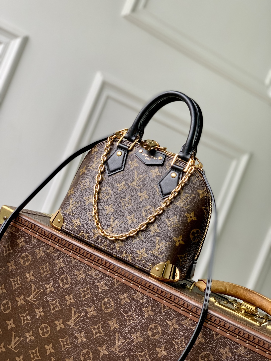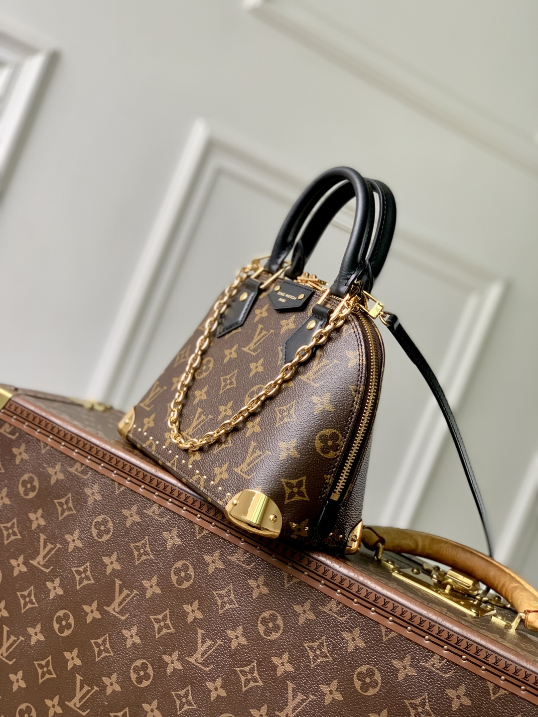This is a replica LOUIS VUITTON M26084 Alma BB Trunk. ,22 x 19 x 11 cm ,Monogram coated canvas,Cowhide leather trims,Microfibre lining,Gold-colour hardware,Zip closure with padlock and keys,1 flat inside pocket,Fits 6.7-inch smartphone, earphones, Rosalie Coin Purse, keys, lipstick,Strap: Removable, adjustable,Strap Drop: 50.0 cm,Strap Drop Max: 66.0 cm,Chain: Removable,Chain Drop: 22.0 cm,Handle: Single x2