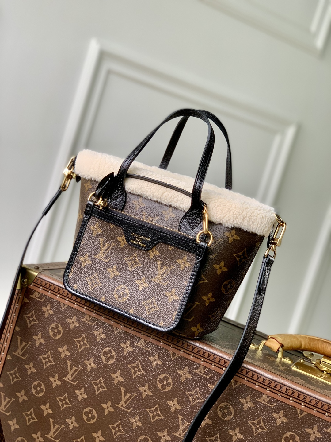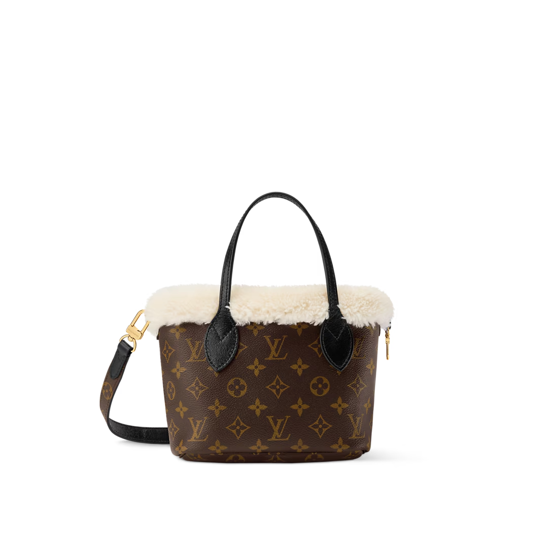 This is a replica LOUIS VUITTON M26315 Neverfull Bandoulière Inside Out BB Bag. ,26.5 x 16.5 x 11 cm ,Monogram shearling,Coated canvas and shearling,Leather trim,Shearling lining,Aged gold-colour hardware,Hook closure,1 removable zipped pouch,Fits 6.7-inch smartphone, earphones, Rosalie Coin Purse, keys, lipstick,Strap: Removable, non-adjustable,Strap Drop: 50.0 cm,Handle: Single x2