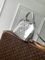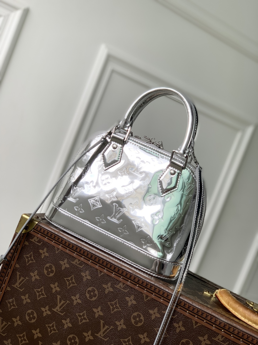 This is a replica LOUIS VUITTON M26335 Alma BB. ,23.5 x 17.5 x 11.5 cm ,Silver,Coated canvas,Coated canvas trim,Textile lining (cotton and polyester),Silver-colour hardware,Double zip closure with padlock,1 inside flat pocket,Fits 6.7-inch smartphone, earphones, sunglasses, keys, lipstick,Strap: Removable, non-adjustable,Strap Drop: 52.0 cm,Handle: Single x2