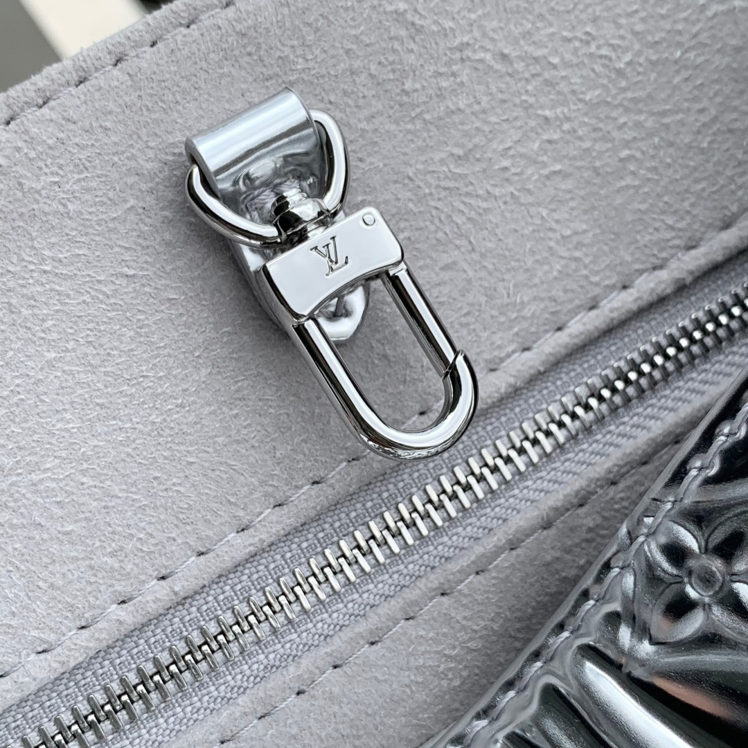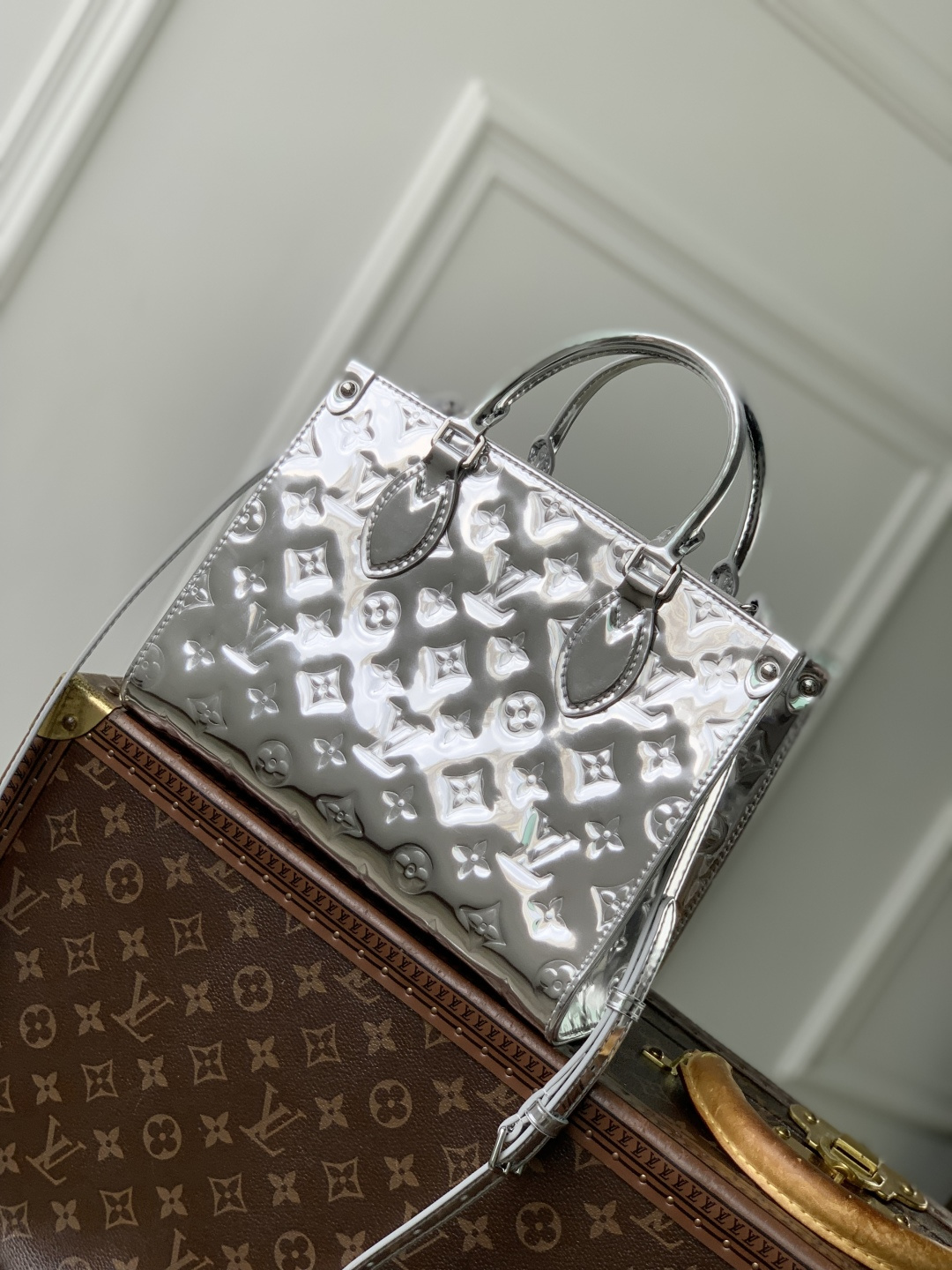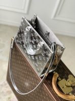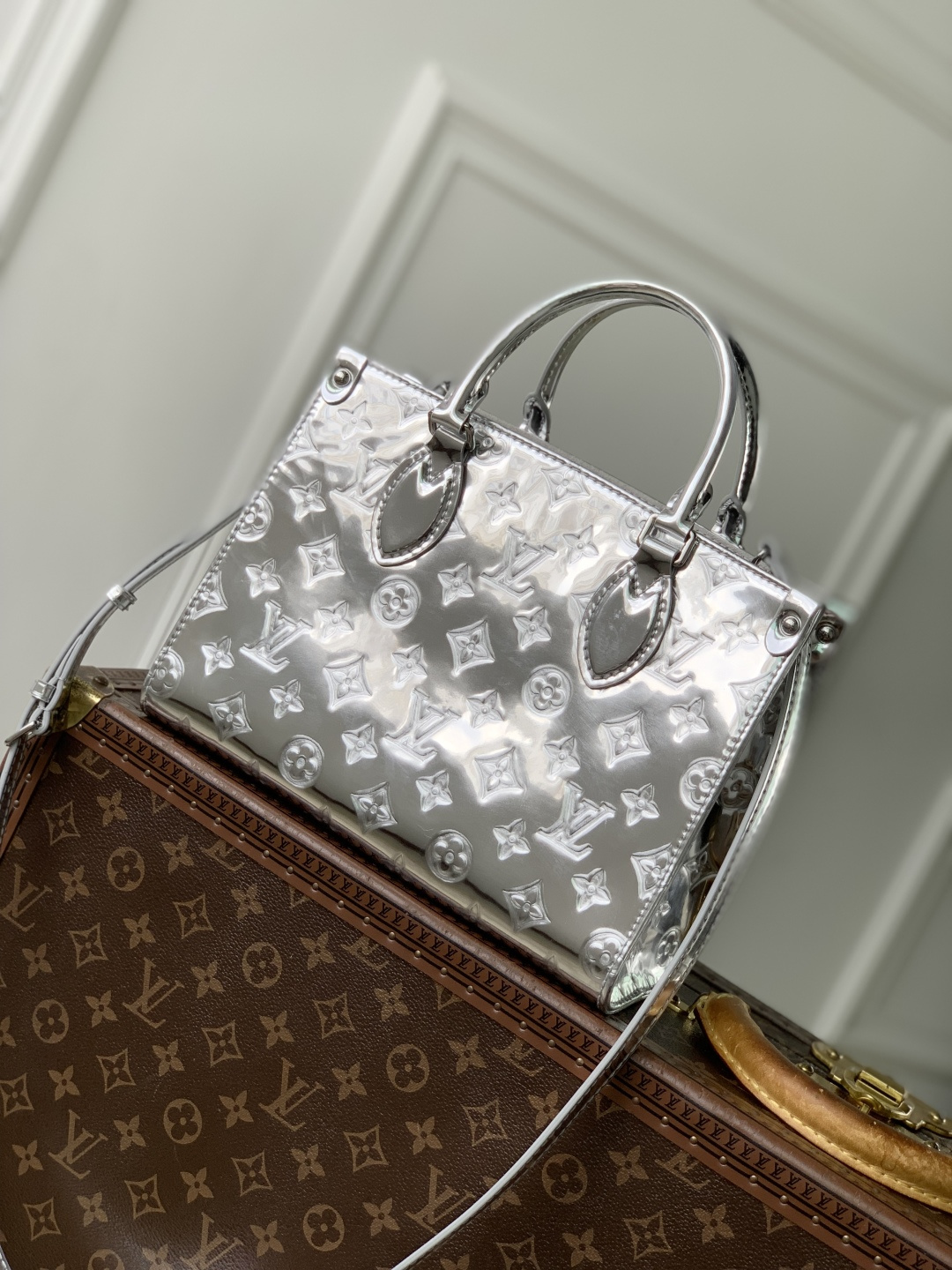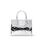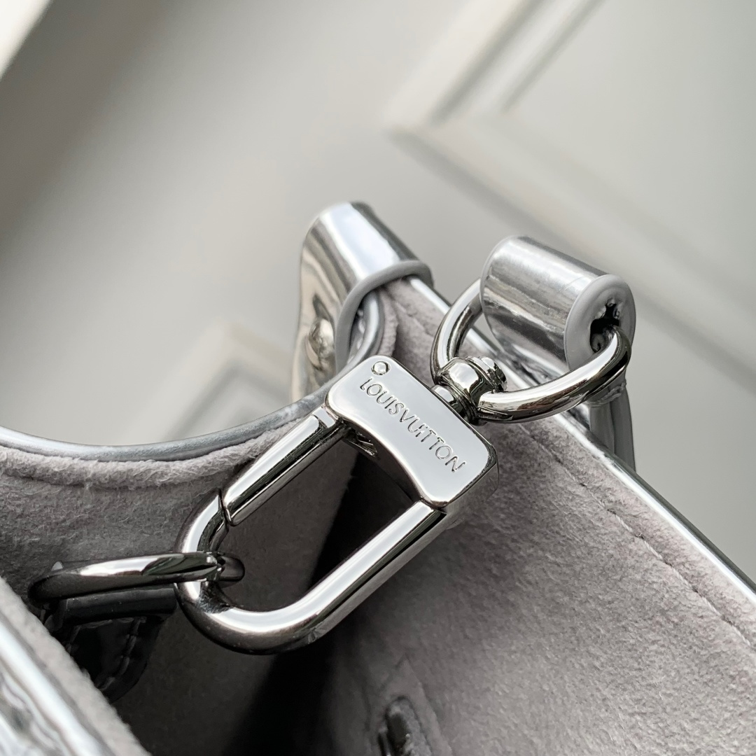 This is a replica LOUIS VUITTON M26373 OnTheGo PM. ,25 x 19 x 11.5 cm ,Silver,Coated canvas,Coated canvas trim,Textile lining (cotton and polyester),Silver-colour hardware,1 snap hook closure,1 inside flat zipped pocket,2 inside flat pockets,Fits 6.7-inch smartphone, earphones, Sarah long wallet, small book, keys, lipstick,Strap: Removable, non-adjustable,Strap Drop: 51.0 cm,Handle: Single x2