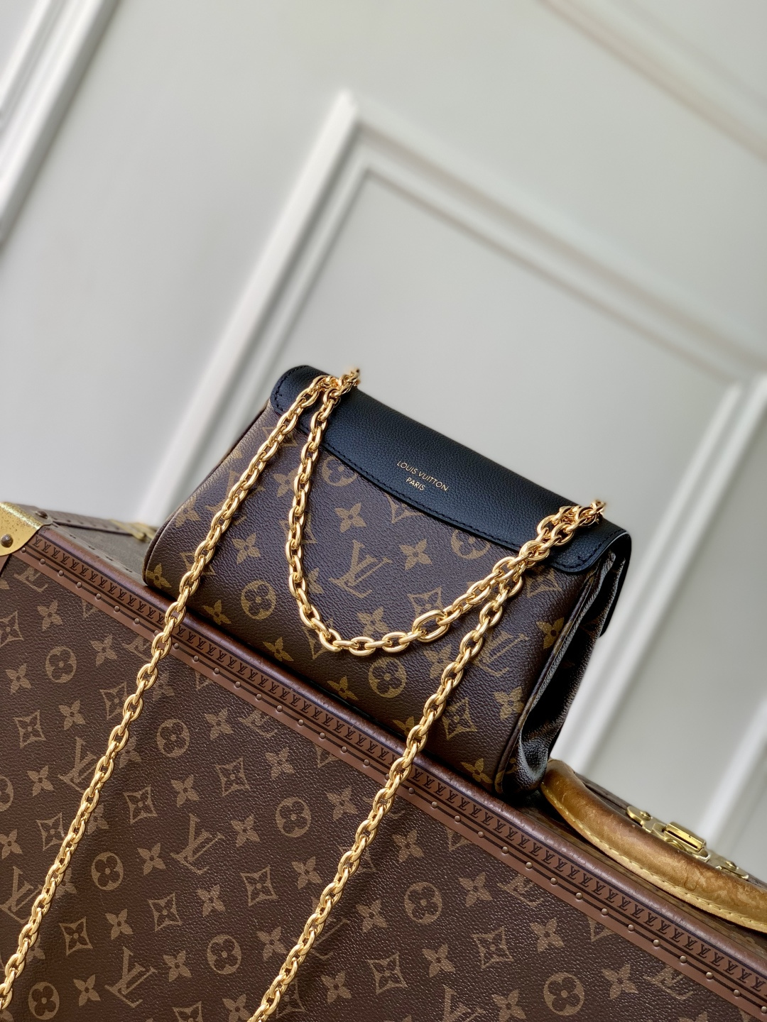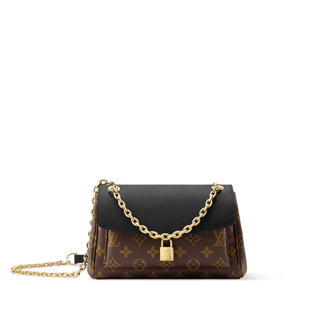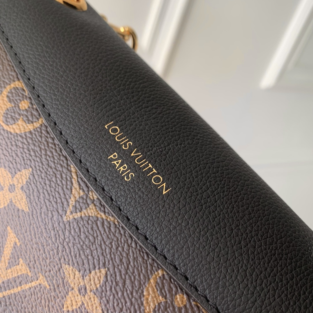 This is a replica LOUIS VUITTON M26398 Saint Germain BB. ,24 x 17 x 9 cm ,Monogram/Black,Leather and coated canvas,Leather trim,Textile lining,Aged gold-colour hardware,1 protective leather shoulder pad,Magnet closure,2 snap buttons,1 padlock,1 exterior pocket,1 flat inside pocket,Fits 6.7-inch smartphone, earphones, Rosalie Coin Purse, lipstick,Chain: Sliding, non-removable,Chain Drop: 32.0 cm,Chain Drop Max: 57.0 cm