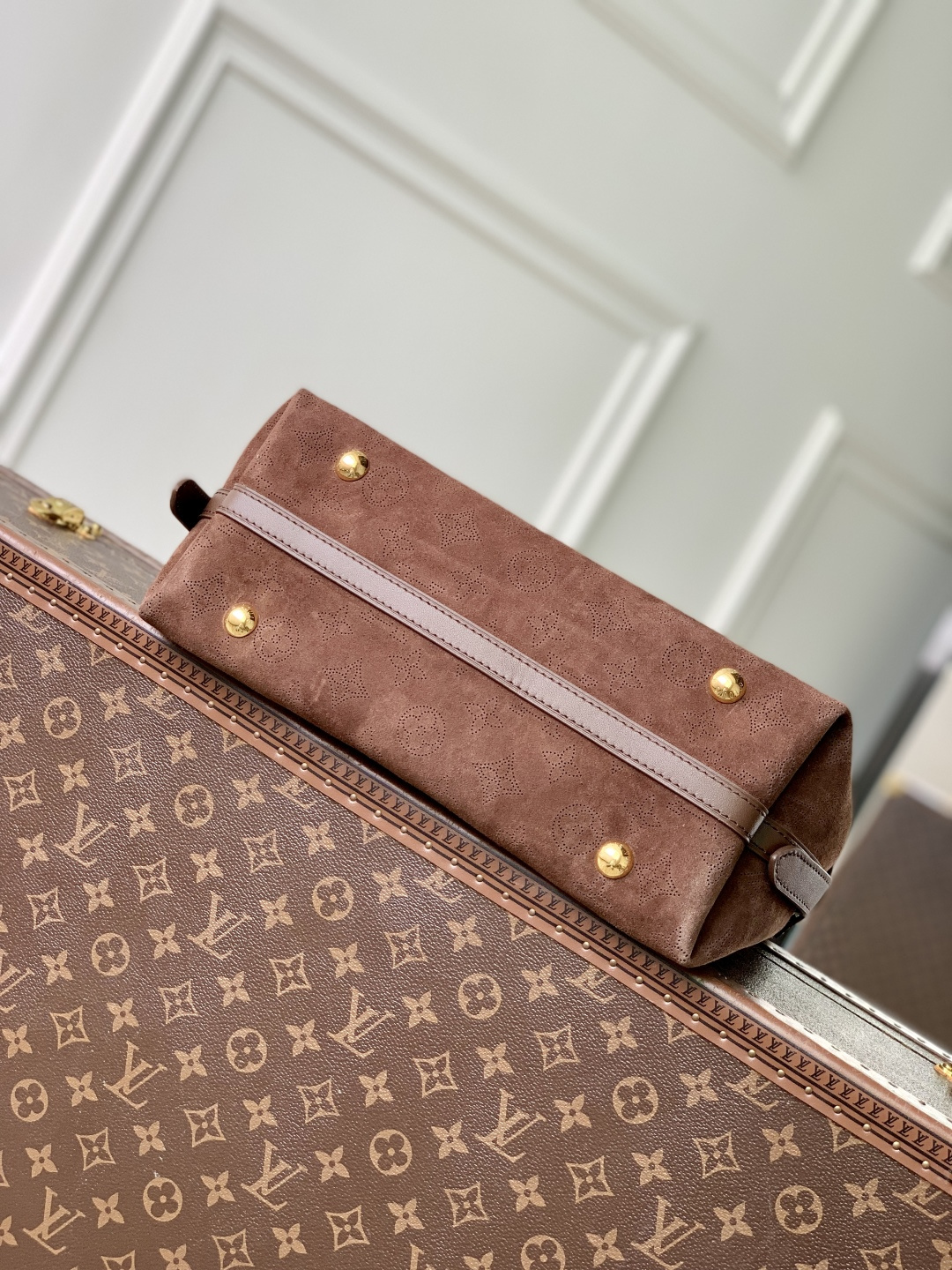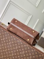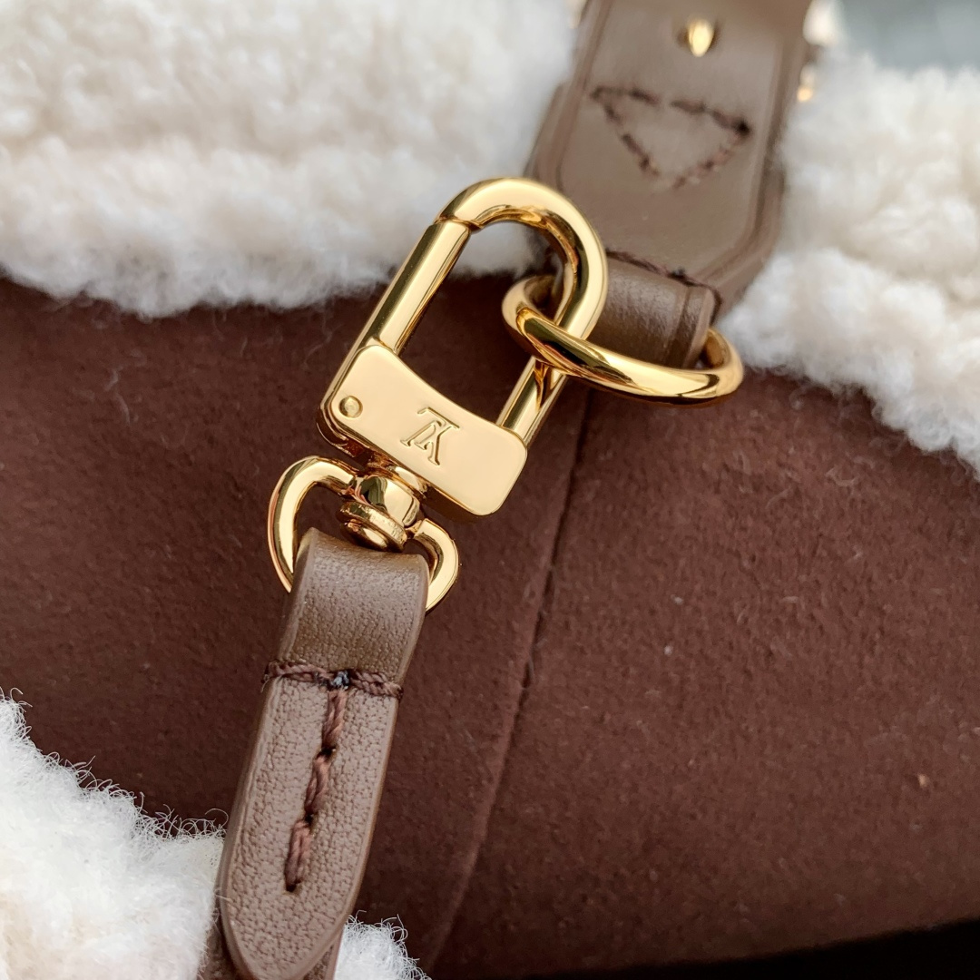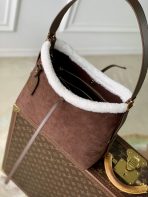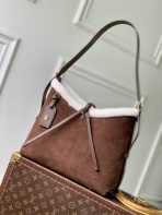This is a replica LOUIS VUITTON M26421 CarryAll PM. ,22 x 34 x 11 cm ,Chocolate Brown,Suede calfskin and shearling,Cowhide leather trim,Microfibre lining,Gold-colour hardware,Leather lace and magnet closure,2 small flat inside pockets,Zipped inside pocket,1 name tag,Fits 14-inch smartphone, earphones, Zippy wallet, keys,Strap: Removable, adjustable,Strap Drop: 42.0 cm,Strap Drop Max: 55.0 cm,Handle: Single x2