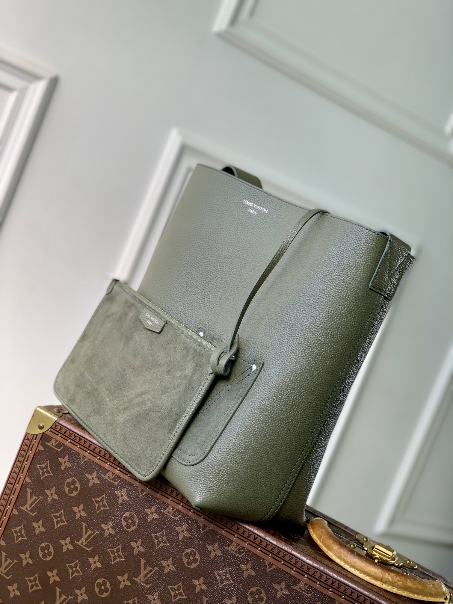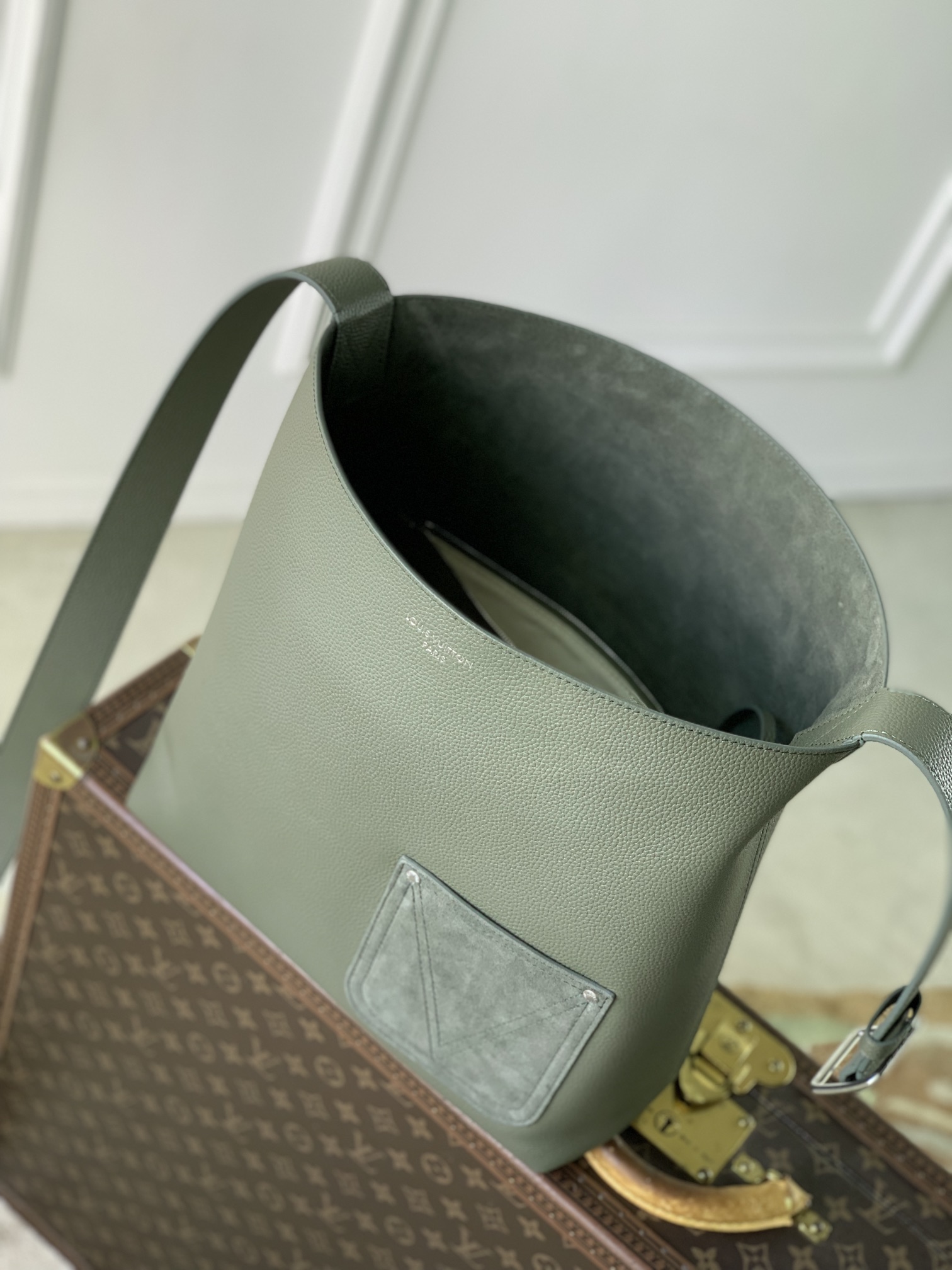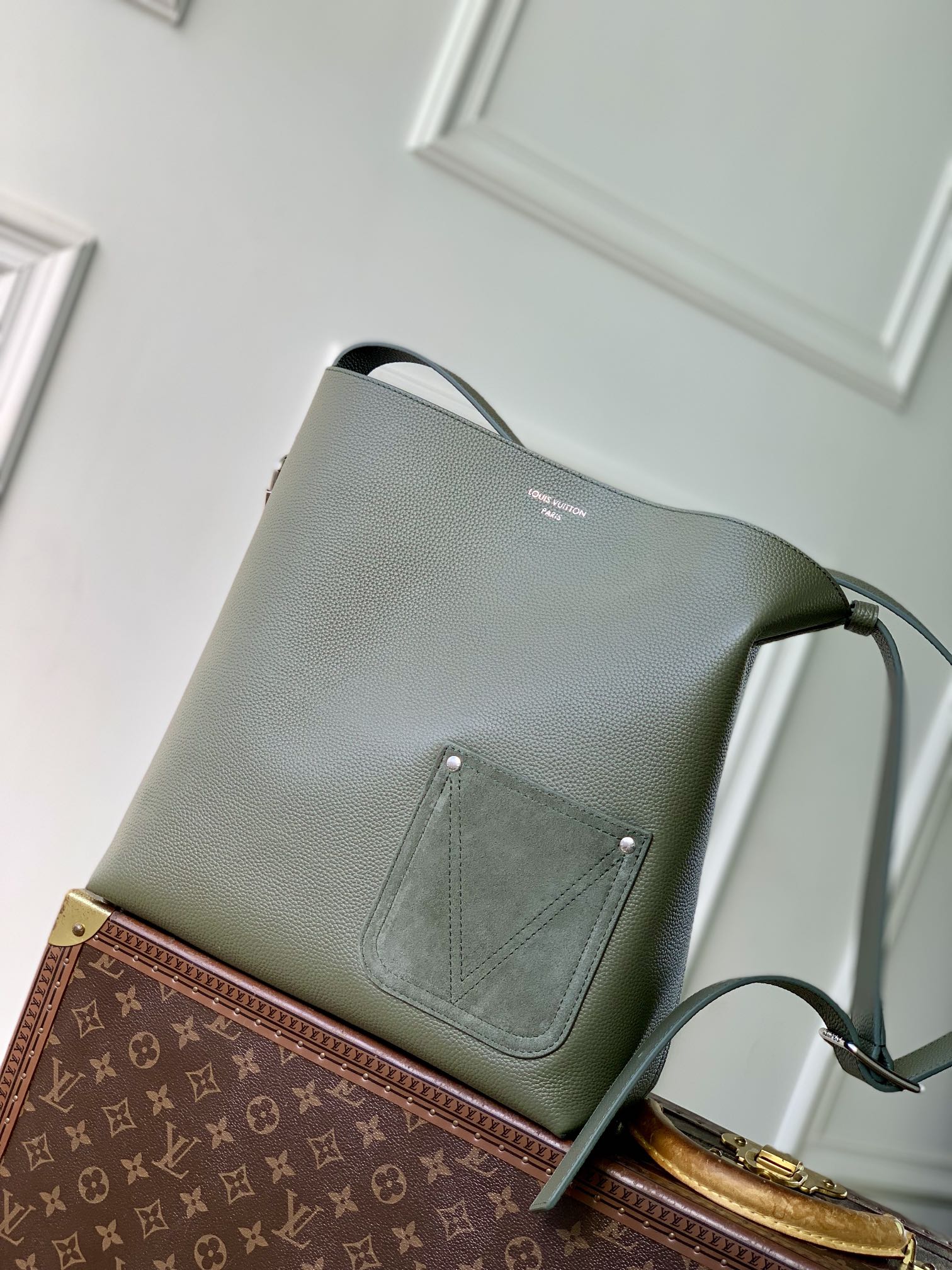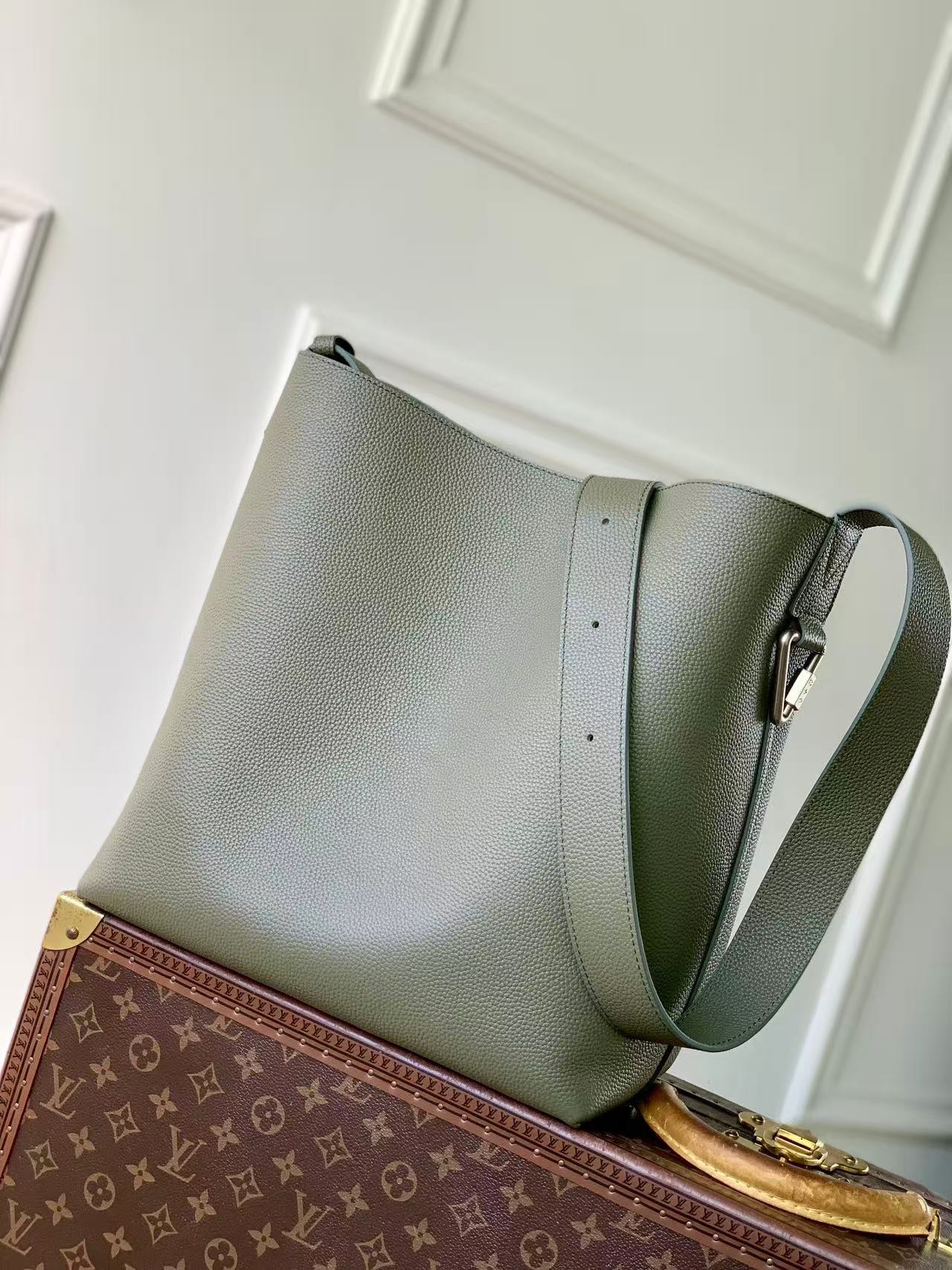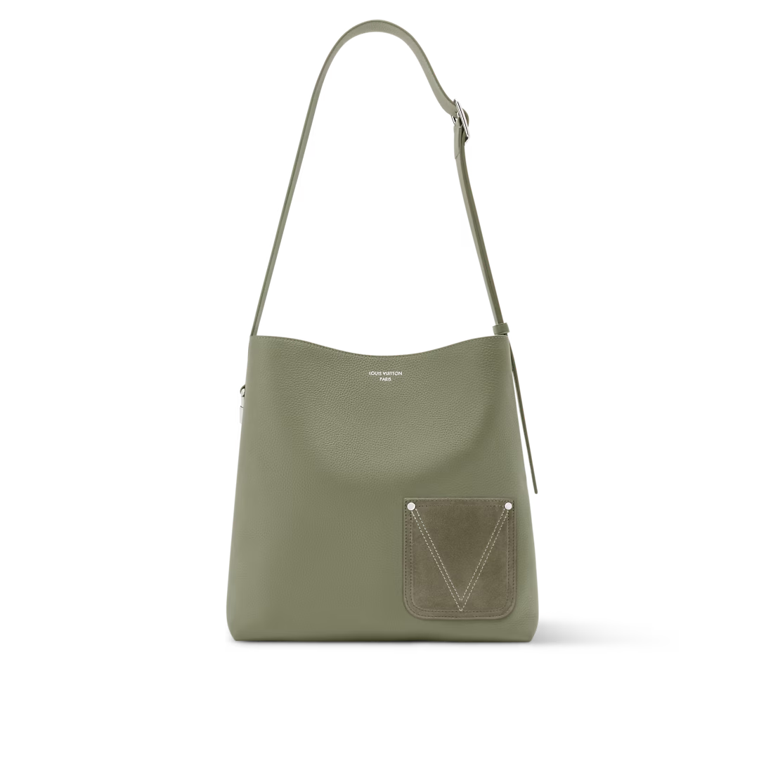 This is a replica LOUIS VUITTON M26747 Verso Hobo Bag. ,30 x 33 x 15.5 cm ,Khaki Green,LV Touch cowhide leather,Cowhide leather trim,Suede lining,Silver-colour hardware,Front pocket,Carabiner clip,Inside removable zipped pouch,Inside pocket,Strap: Non-removable, adjustable,Strap Drop: 39.5 cm,Strap Drop Max: 53.0 cm