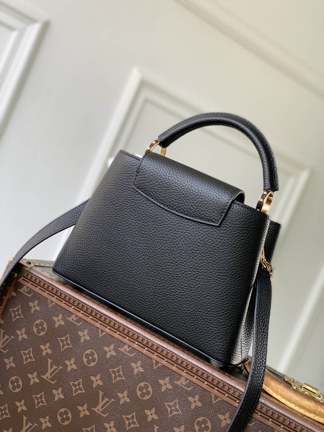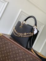 This is a replica LOUIS VUITTON M27035 Capucines MM. ,31.05 x 20 x 11 cm ,Black,Taurillon leather,Taurillon leather trim,Cowhide leather lining,Gold- and silver-colour hardware,Double carry style: flap inside or outside,Compartmented interior with 1 zipped pocket and 2 flat pockets,4 protective metal base feet,Fits smartphone, earphones, LV Vertical wallet, small makeup bag, keys,Strap: Removable, adjustable,Strap Drop: 45.5 cm,Strap Drop Max: 53.0 cm,Handle: Single