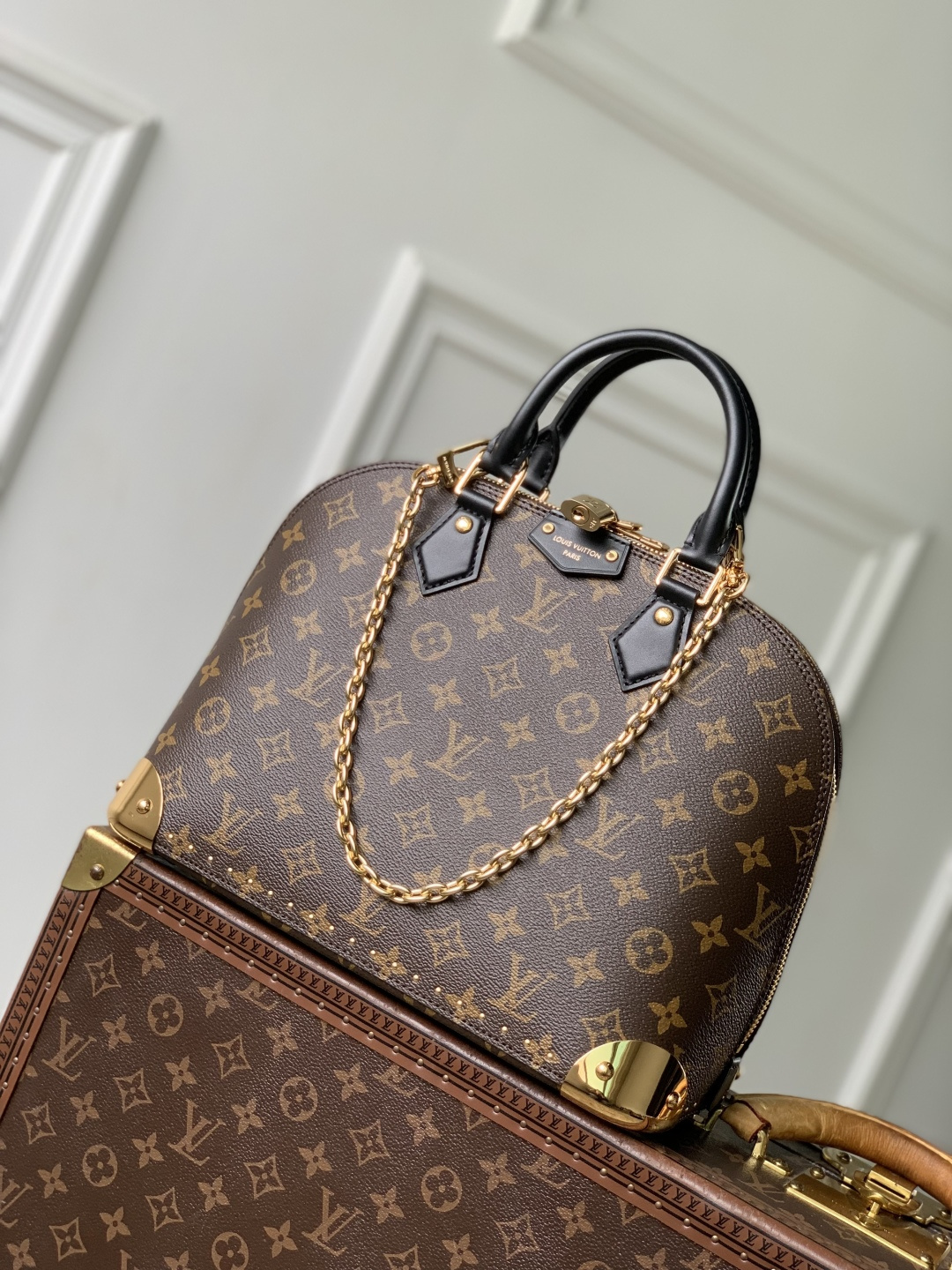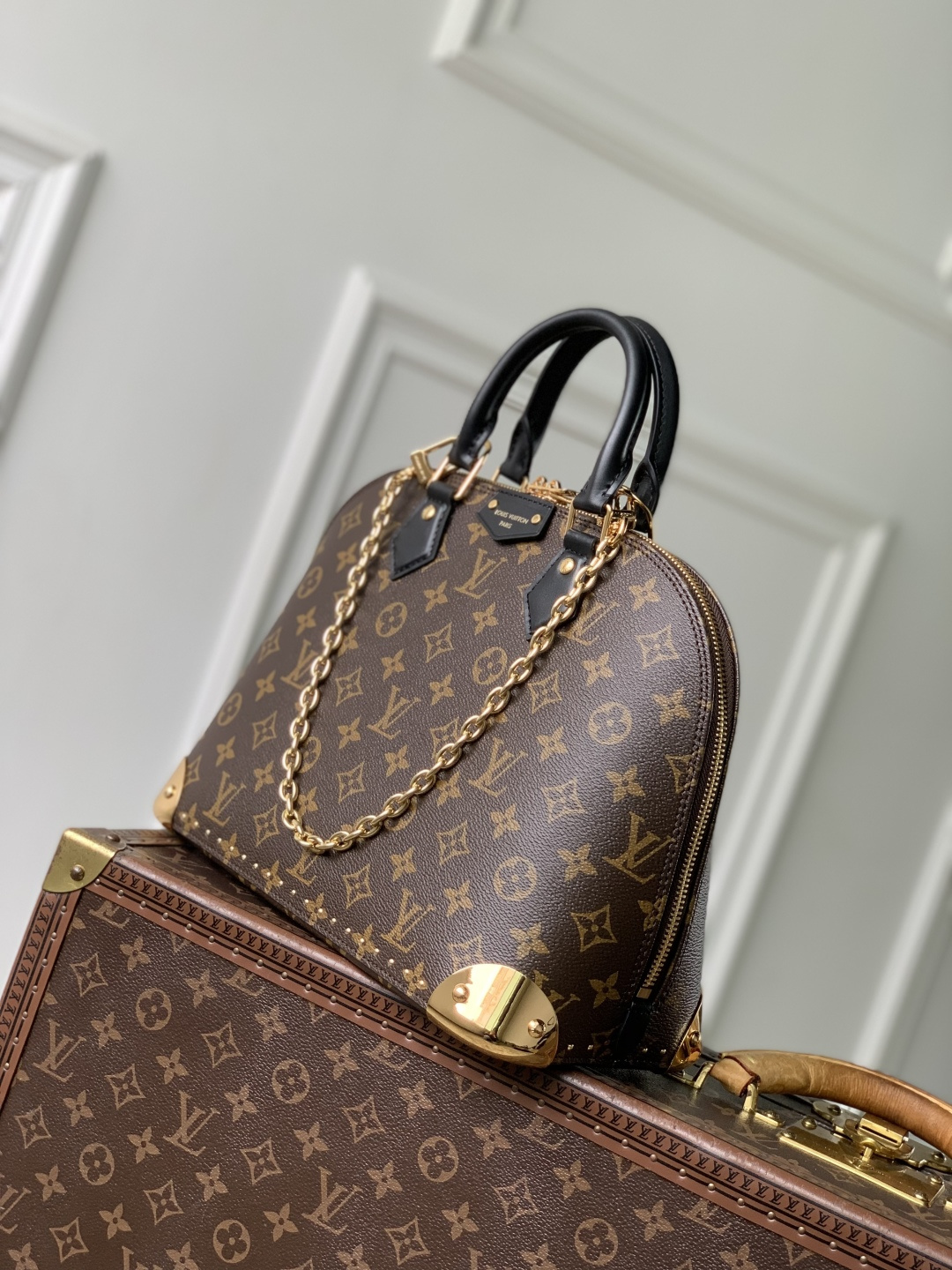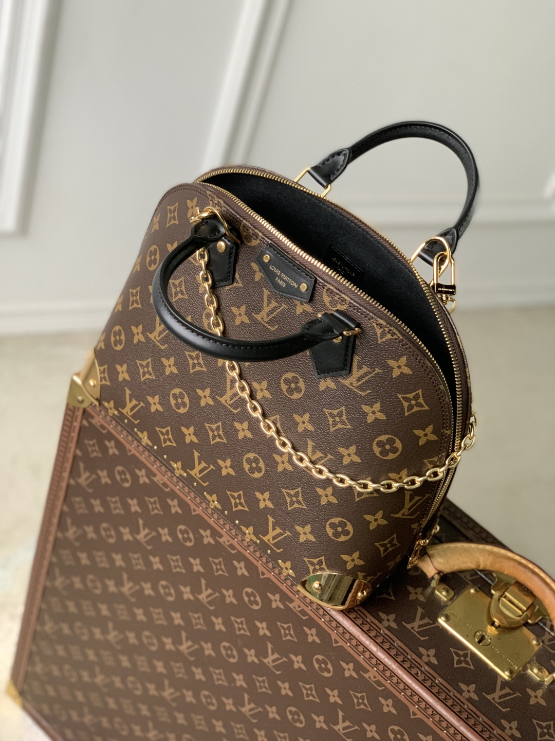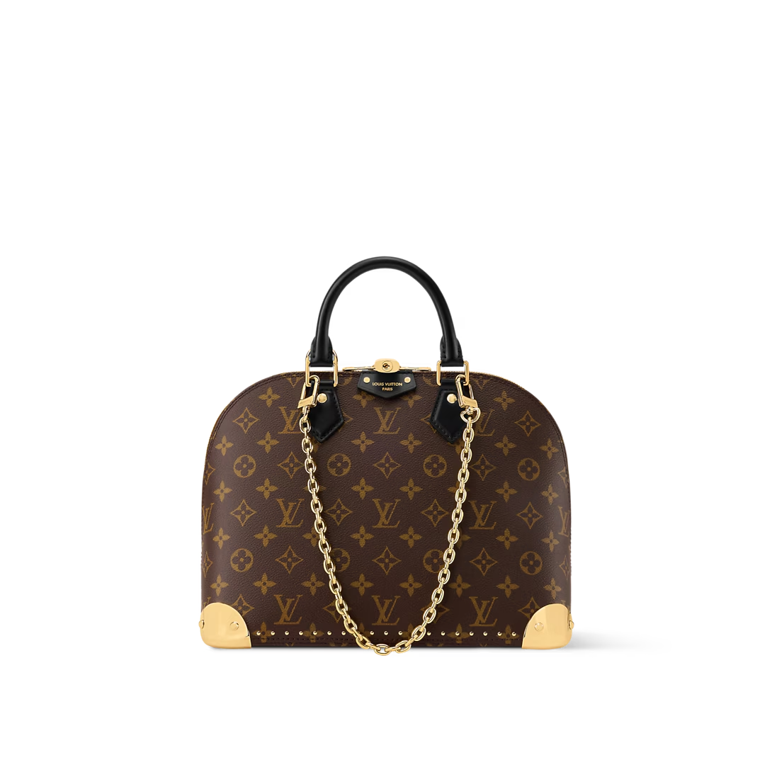 This is a replica LOUIS VUITTON M27216 Alma PM Trunk Bag. ,31 x 25 x 16 cm ,Monogram coated canvas,Cowhide leather trims,Microfibre lining,Gold-colour hardware,Zip closure with padlock and keys,1 flat inside pocket,Fits smartphone, earphones, Clémence Wallet, notebook, sunglasses,Chain: Removable,Chain Drop: 19.0 cm,Handle: Single x2