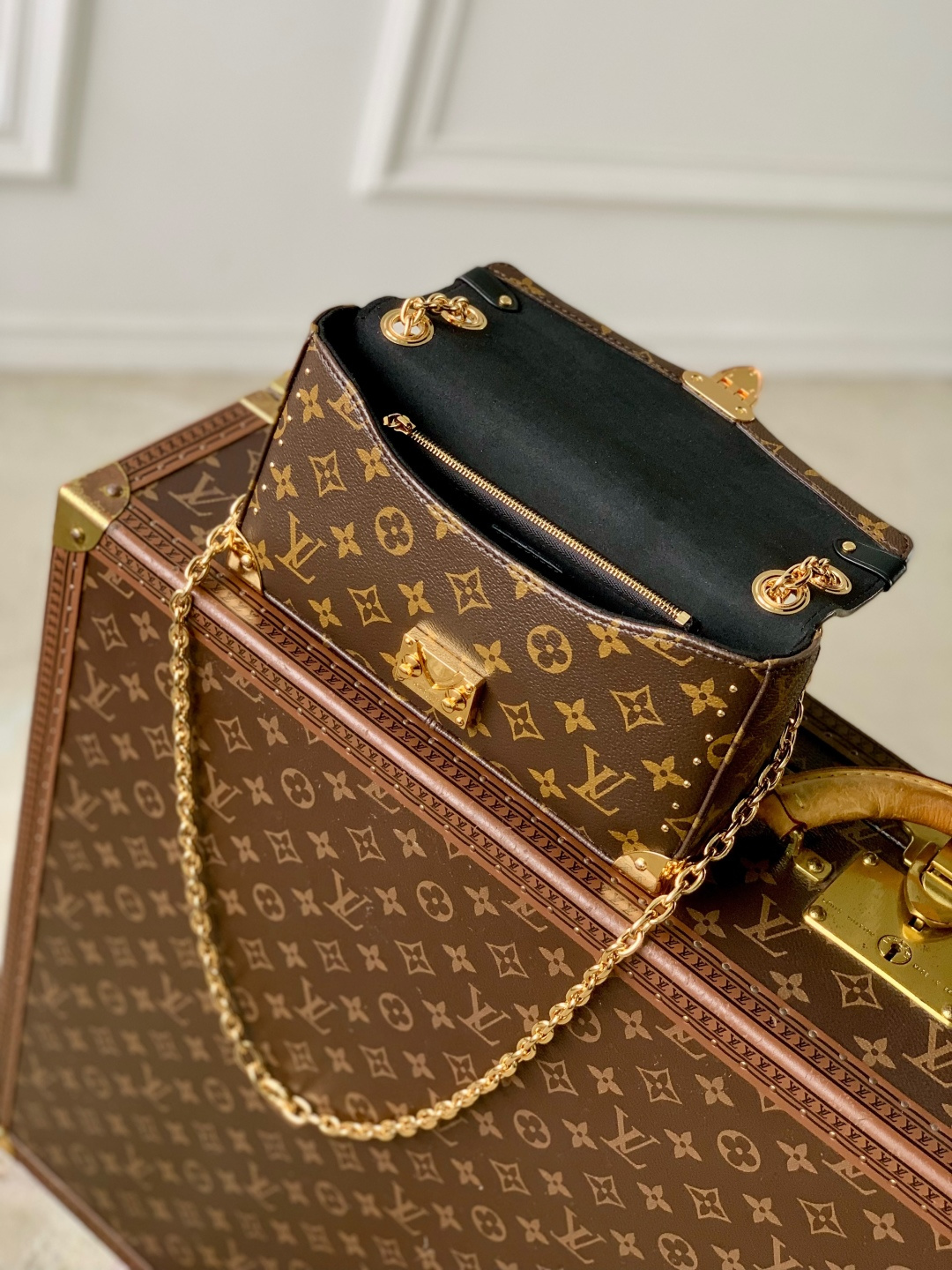 This is a replica LOUIS VUITTON M27266 Trunkie East West Bag. ,25 x 15 x 6 cm ,Monogram coated canvas,Cowhide leather trim,Microfibre lining,Gold-colour hardware,Flap closure with magnetic S-lock,Inside zipped pocket,Chain: Sliding, non-removable,Chain Drop: 30.0 cm,Chain Drop Max: 48.0 cm