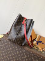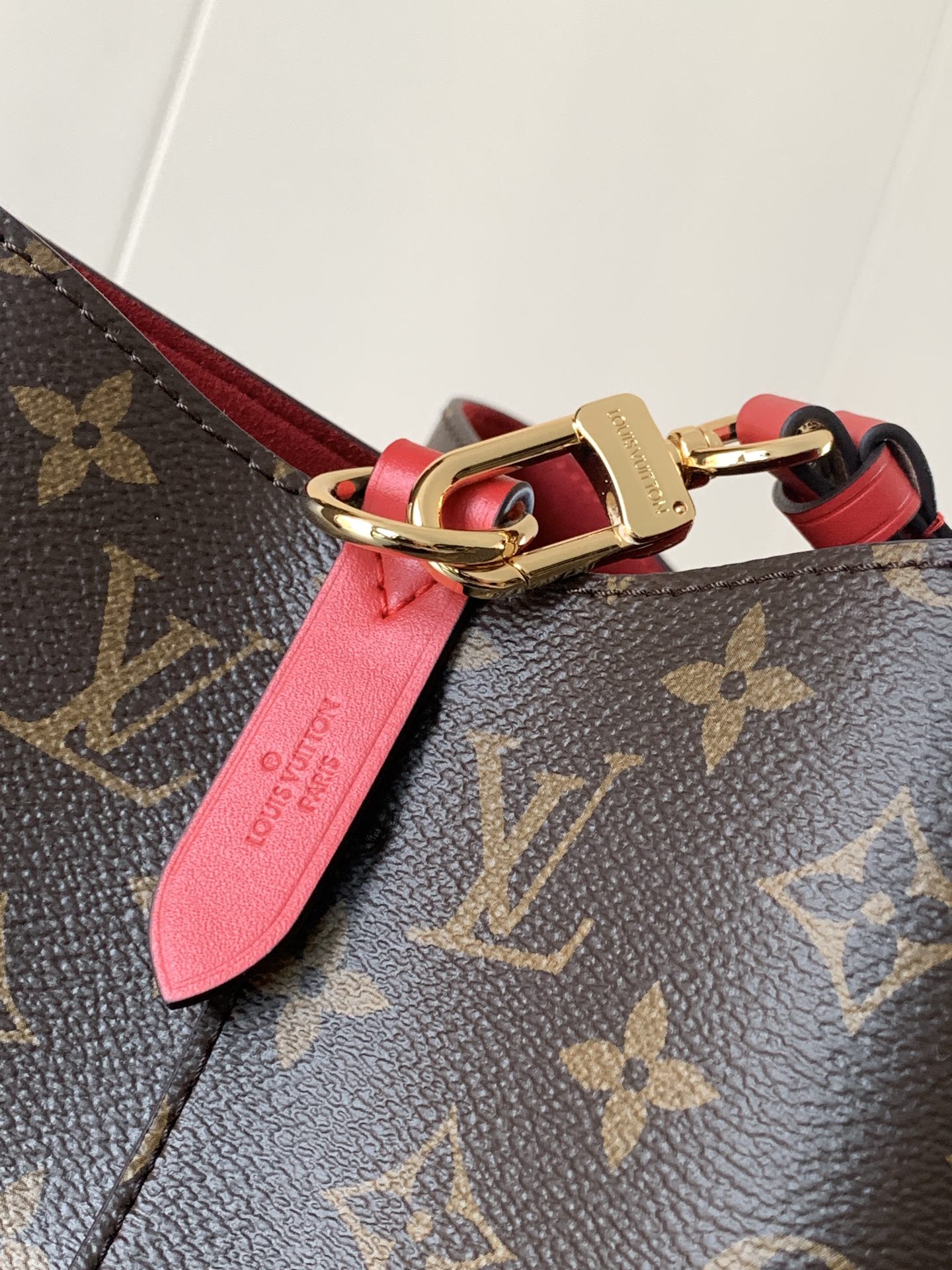 This is a replica LOUIS VUITTON M44021 NéoNoé MM. ,10.2 x 10.2 x 6.9 inches ,Coquelicot Red,Monogram coated canvas,Colored cowhide leather trim,Microfiber lining,Gold-color hardware,2 compartments,Zipped central pocket,Metal eyelets,Fits: smartphone, Victorine Compact Wallet, tissues, lipstick, earphones, keys,Strap:Removable, adjustable,Strap drop:12.2 inches,Strap drop max:21.3 inches,Handle:Single, removable