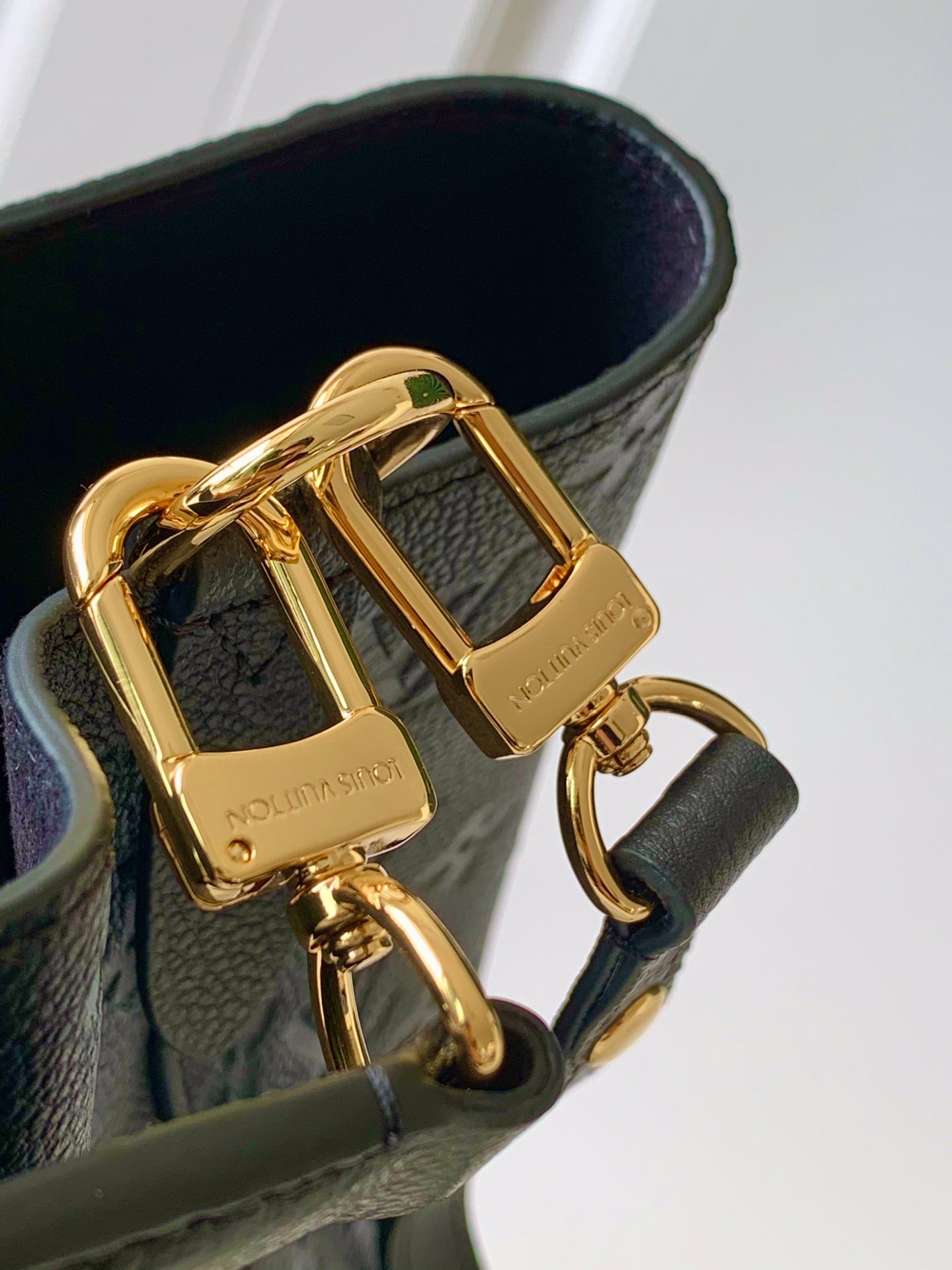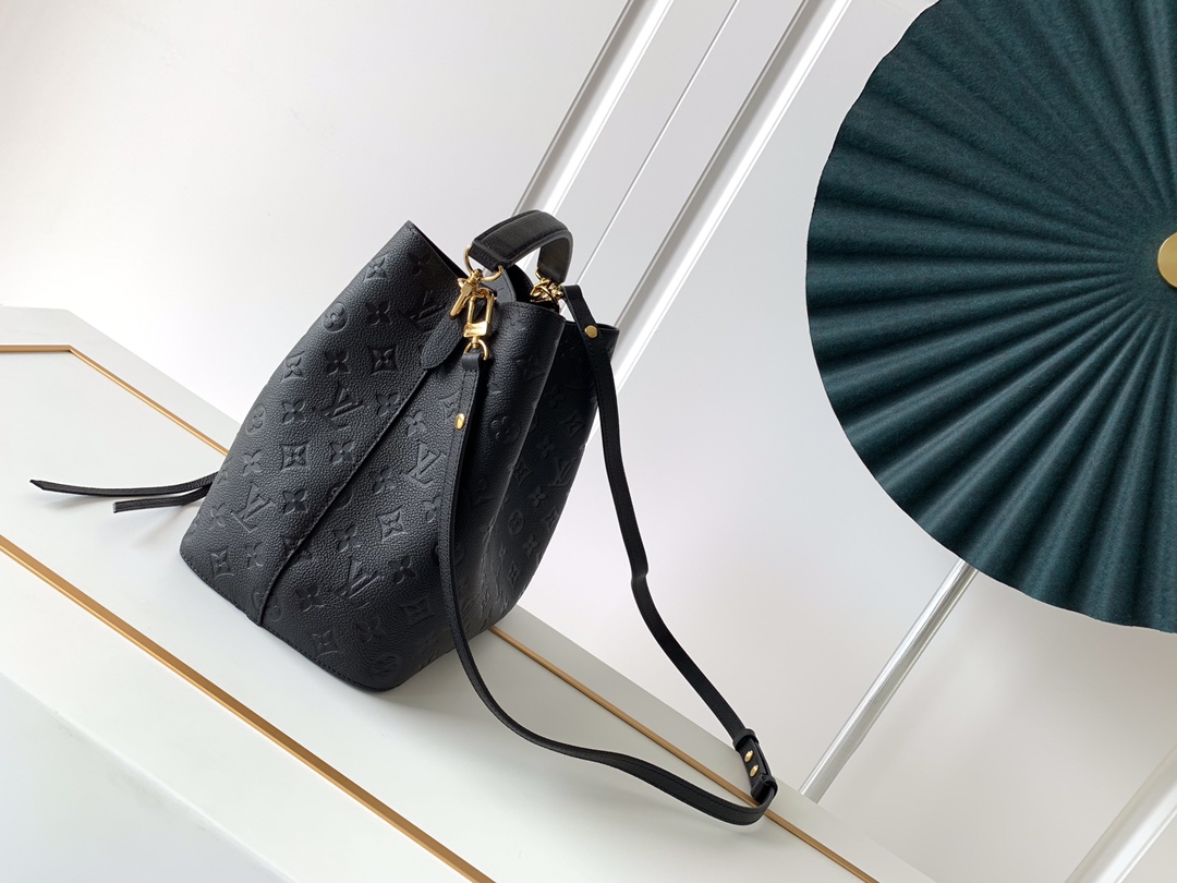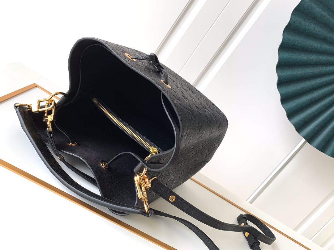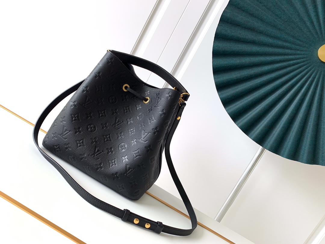 This is a replica LOUIS VUITTON M45256 NéoNoé MM. ,10.2 x 10.2 x 6.9 inches ,Black,Embossed Monogram Empreinte grained cowhide leather,Cowhide-leather trim,Microfiber lining,Gold-color hardware,2 compartments,Zipped central pocket,Metal eyelets,Fits: smartphone, Victorine Compact Wallet, tissues, lipstick, earphones, keys,Strap:Removable, adjustable,Strap drop:12.2 inches,Strap drop max:21.3 inches,Handle:Single, removable