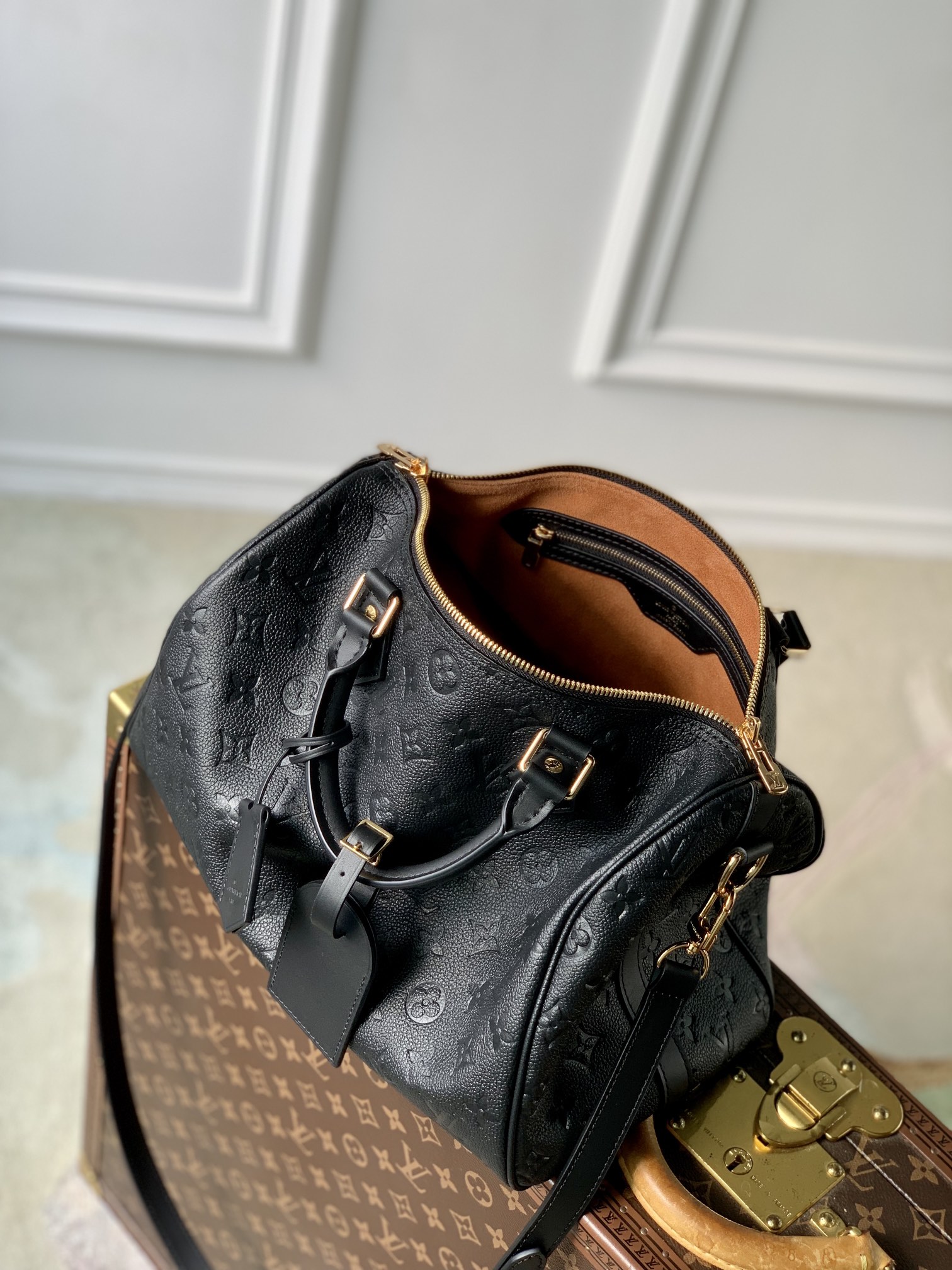 This is a replica LOUIS VUITTON M47186 Speedy Soft 30. ,11.8 x 8.3 x 6.7 inches ,Black,Supple monogram Empreinte cowhide leather,1 removable and adjustable leather strap,Cowhide-leather trim,Suede calfskin lining,Gold-color hardware,Inside zipped pocket,Padlock,Name tag,Fits: smartphone, compact wallet, keys,Strap:Removable, adjustable,Strap drop:16.5 inches,Strap drop max:19.7 inches,Handle:Double