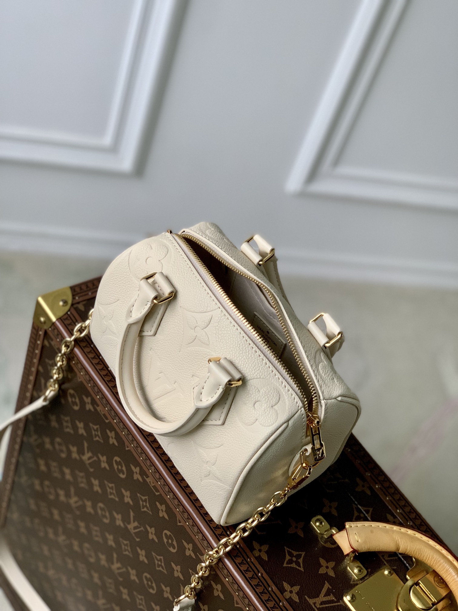 This is a replica LOUIS VUITTON M58954 Speedy Bandoulière 20. ,8.1 x 5.3 x 4.7 inches ,Crème Beige,Embossed grained cowhide leather,Cowhide-leather trim,Microfiber lining,Gold-color hardware,Double zip closure,Inside flat pocket,Padlock,Fits: 6.7-inches smartphone, Lou Compact Wallet, keys, tissues, book, sunglasses, lipstick,Strap:Removable, adjustable,Strap drop:19.3 inches,Strap drop max:21.3 inches,Handle:Double