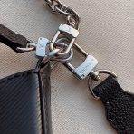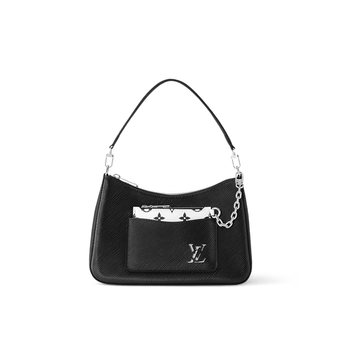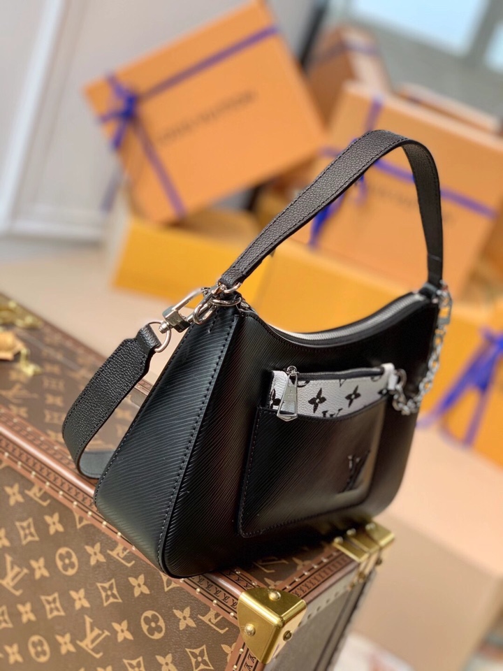 This is a replica LOUIS VUITTON M80689 Marelle Bag. ,25 x 15 x 8 cm ,Black,Epi grained cowhide leather,Smooth cowhide leather and canvas trim,Microfibre lining,Silver-colour hardware,Flat front pocket,Zipped removable pocket hooked to the bag with a removable chain,Inside large flat pocket,Fits: a smartphone, a Romy Card Holder, keys, lipstick and tissues,Strap: Removable, adjustable,Strap Drop: 47.0 cm,Strap Drop Max: 56.0 cm,Handle: Single, removable