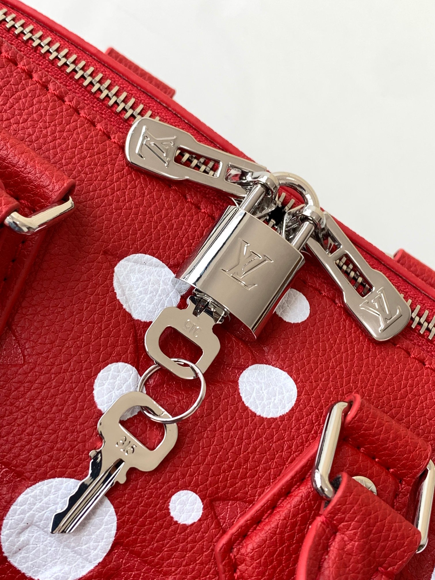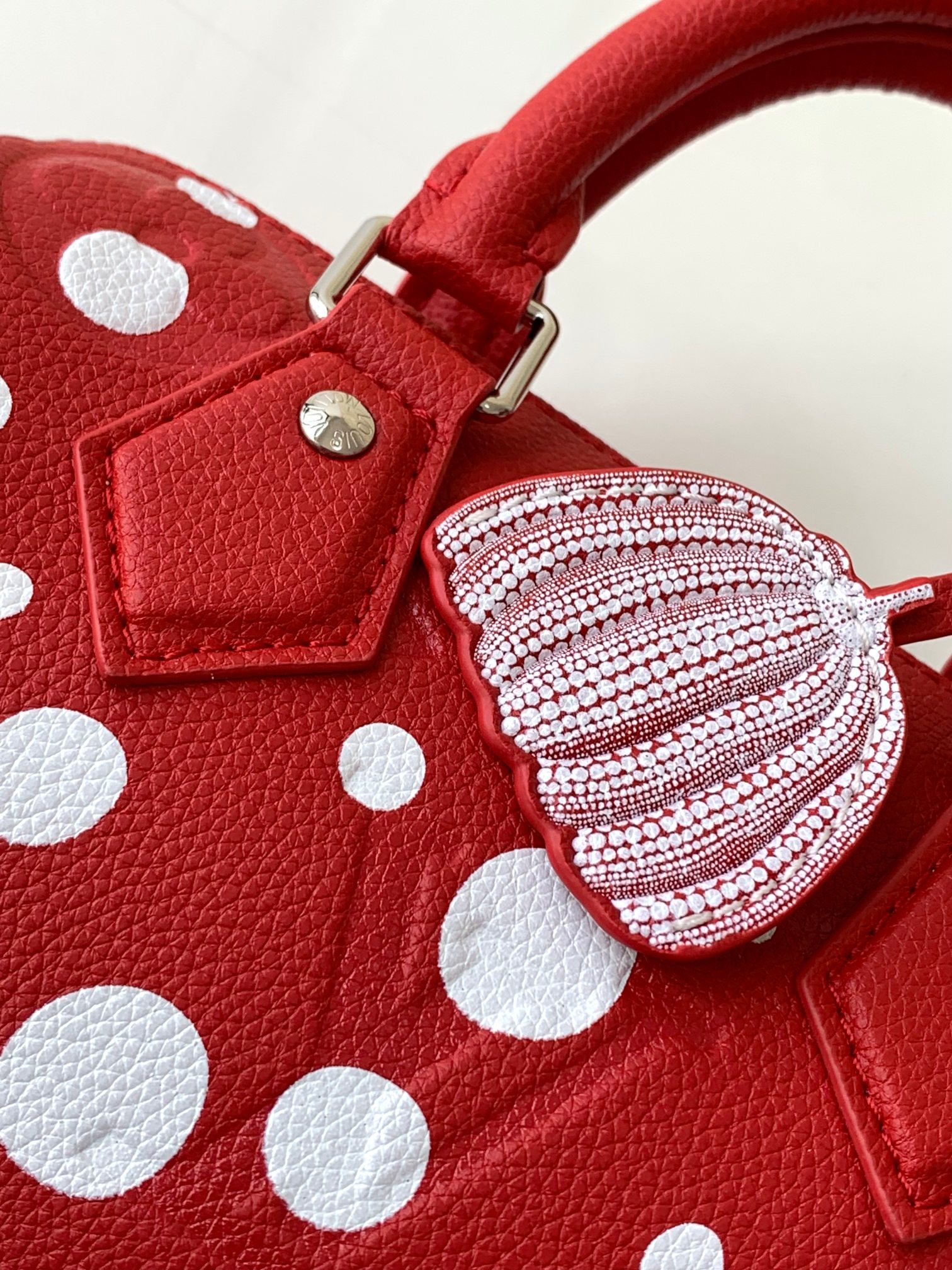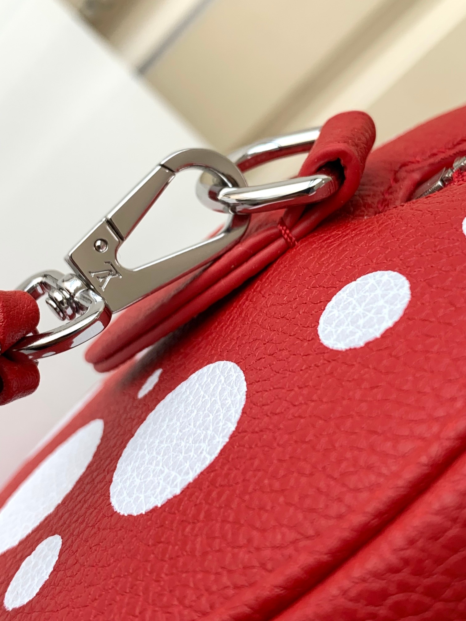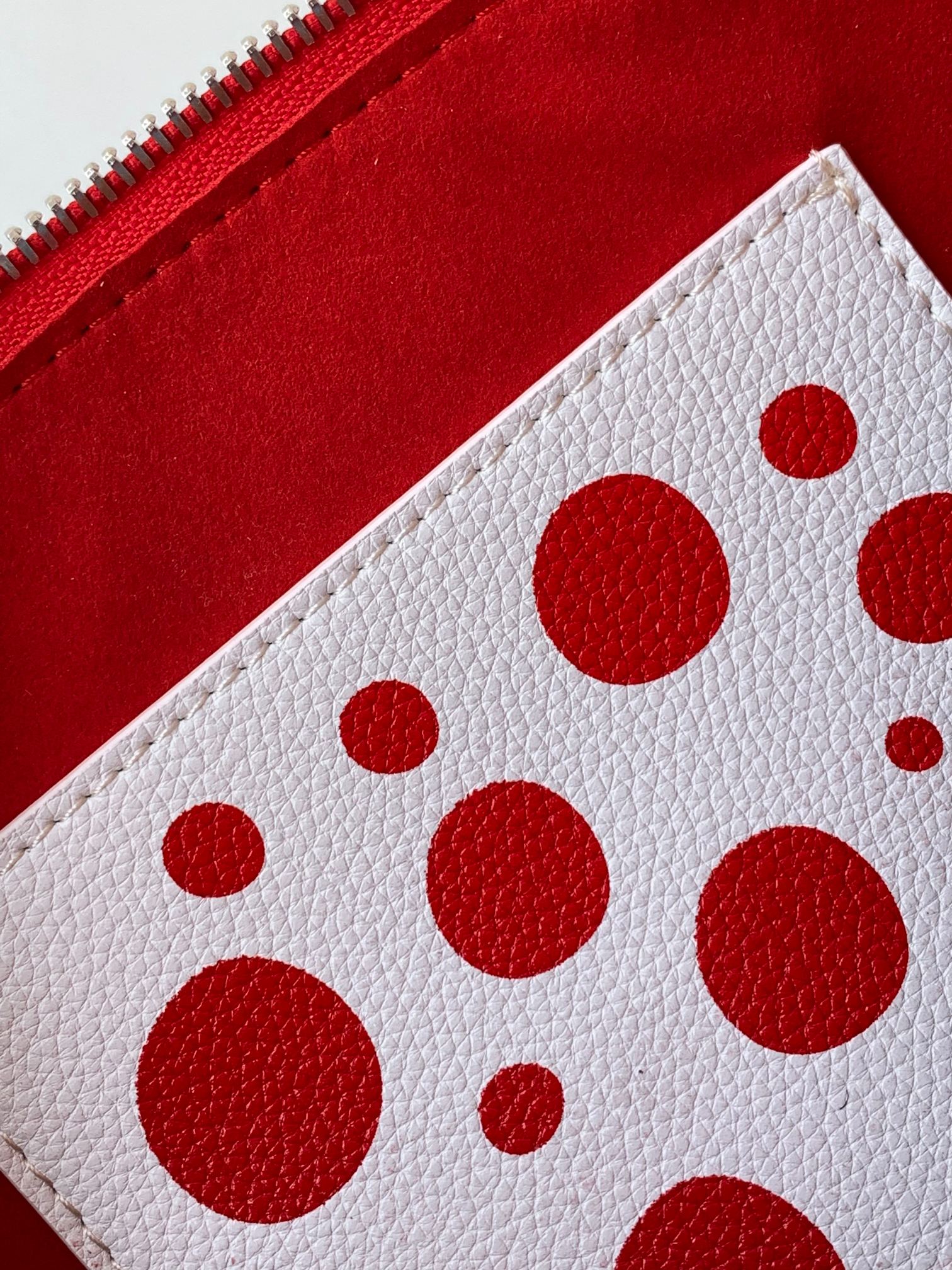 Cheerful white dots are screen-printed on red Monogram Empreinte cowhide,