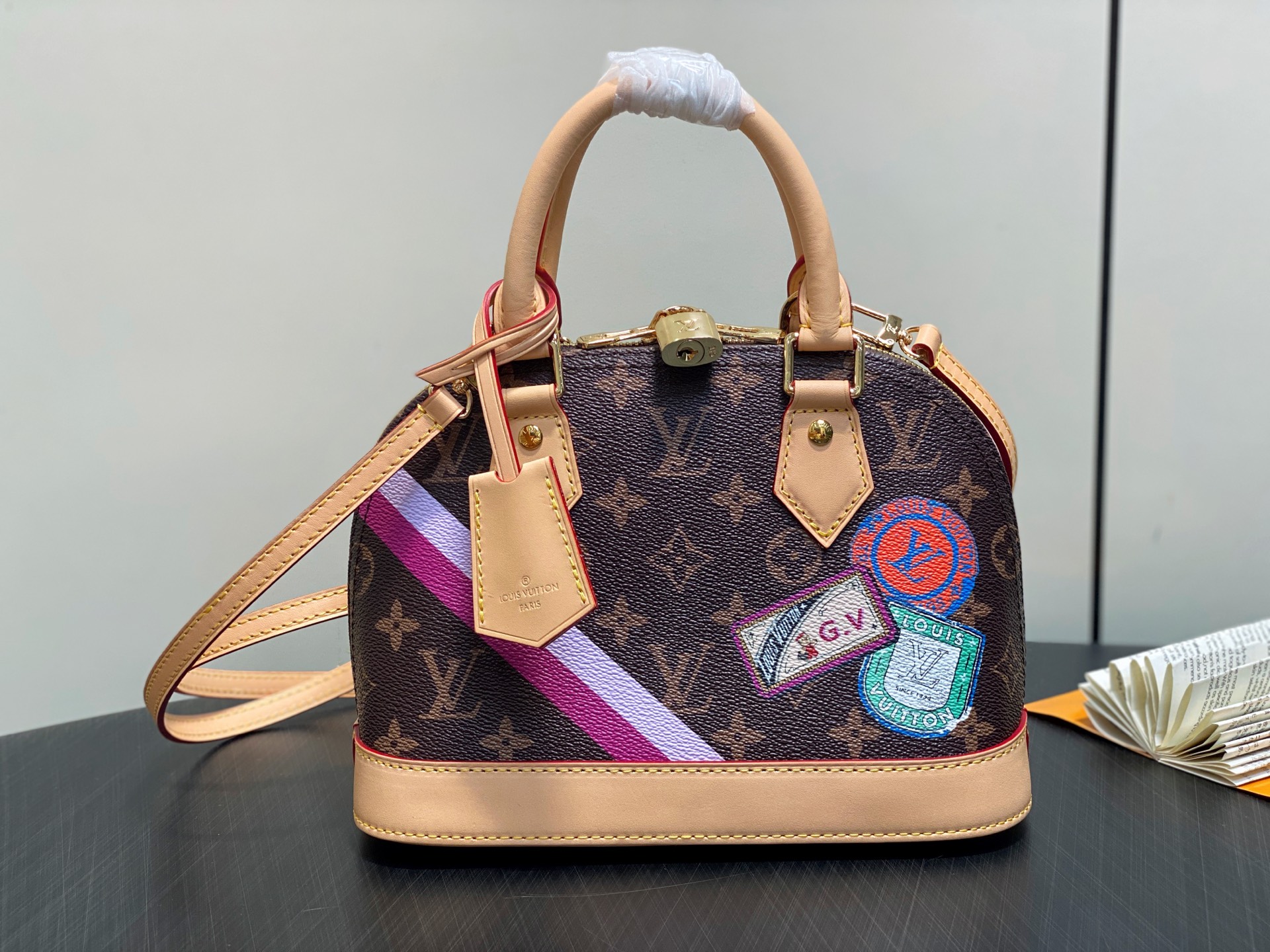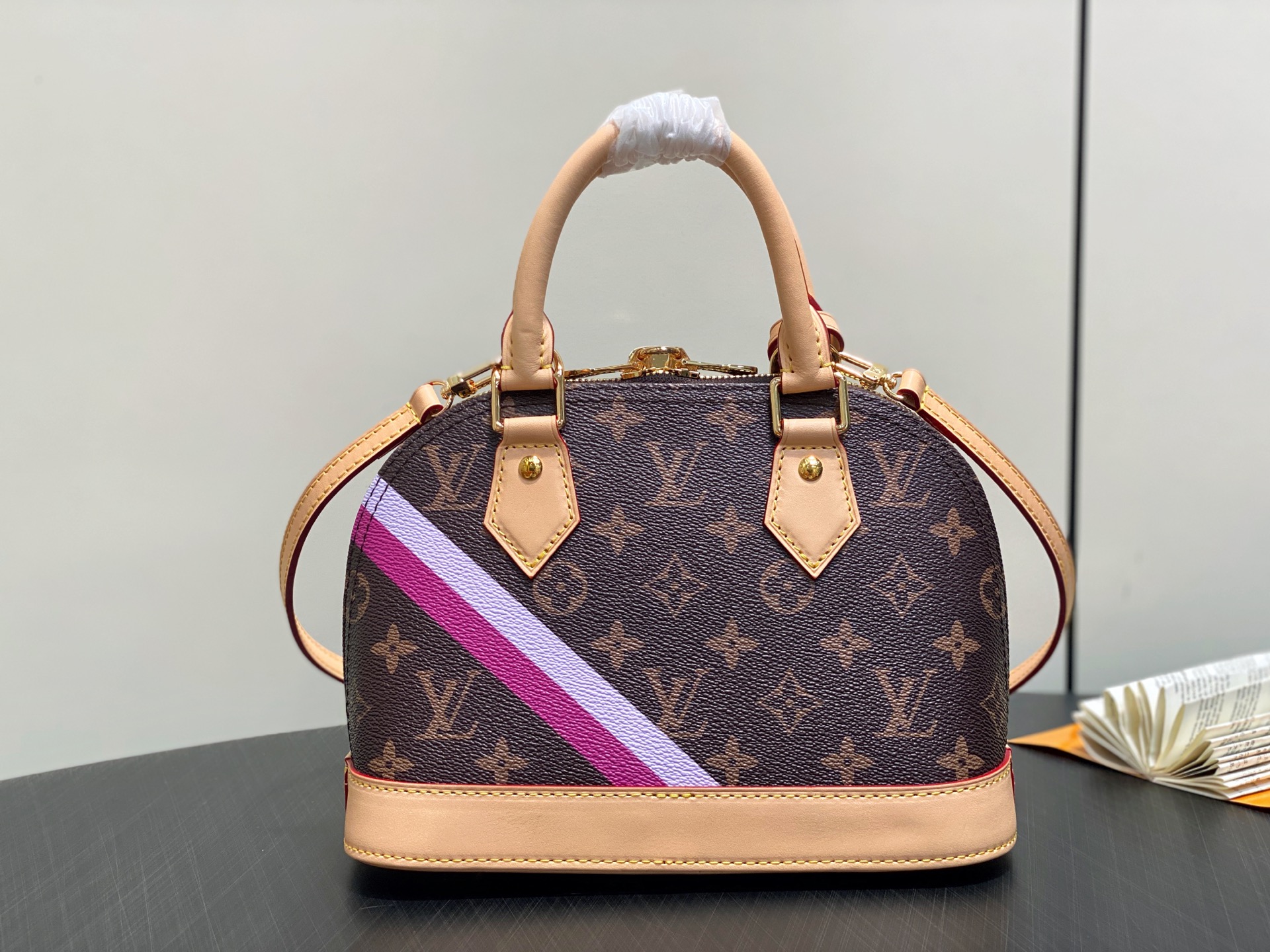 This is a replica LOUIS VUITTON P01917 Mon Monogram Alma BB Bag. ,23.5 x 17.5 x 11.5 cm ,Monogram coated canvas,Cowhide leather trim,Textile lining,Gold-colour hardware,Double zip closure,Padlock,Key bell,Flat inside pocket,4 protective metal bottom studs,Fits 6.7-inch smartphone, earphones, lipstick, tissues, keys, sunglasses,Weight: 0.5 kg,Strap: Removable, non-adjustable,Strap Drop: 56.0 cm,Handle: Single x2