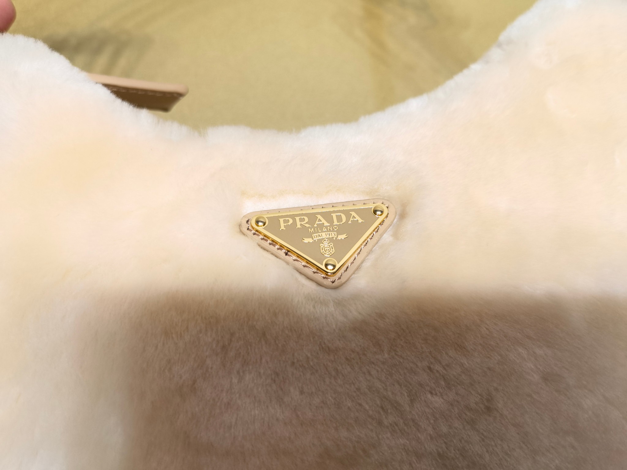 This is a replica Prada 1BC194 Arqué small shearling and leather shoulder bag. ,Detachable, adjustable leather shoulder strap, length: 90 cm. Maximum length 93 cm – Minimum length 83 cm – Maximum drop 60 cm- Minimum drop 55 cm,Metal hardware,Enameled metal triangle logo on the front,Zipper closure,Nappa leather interior with patch pocket,