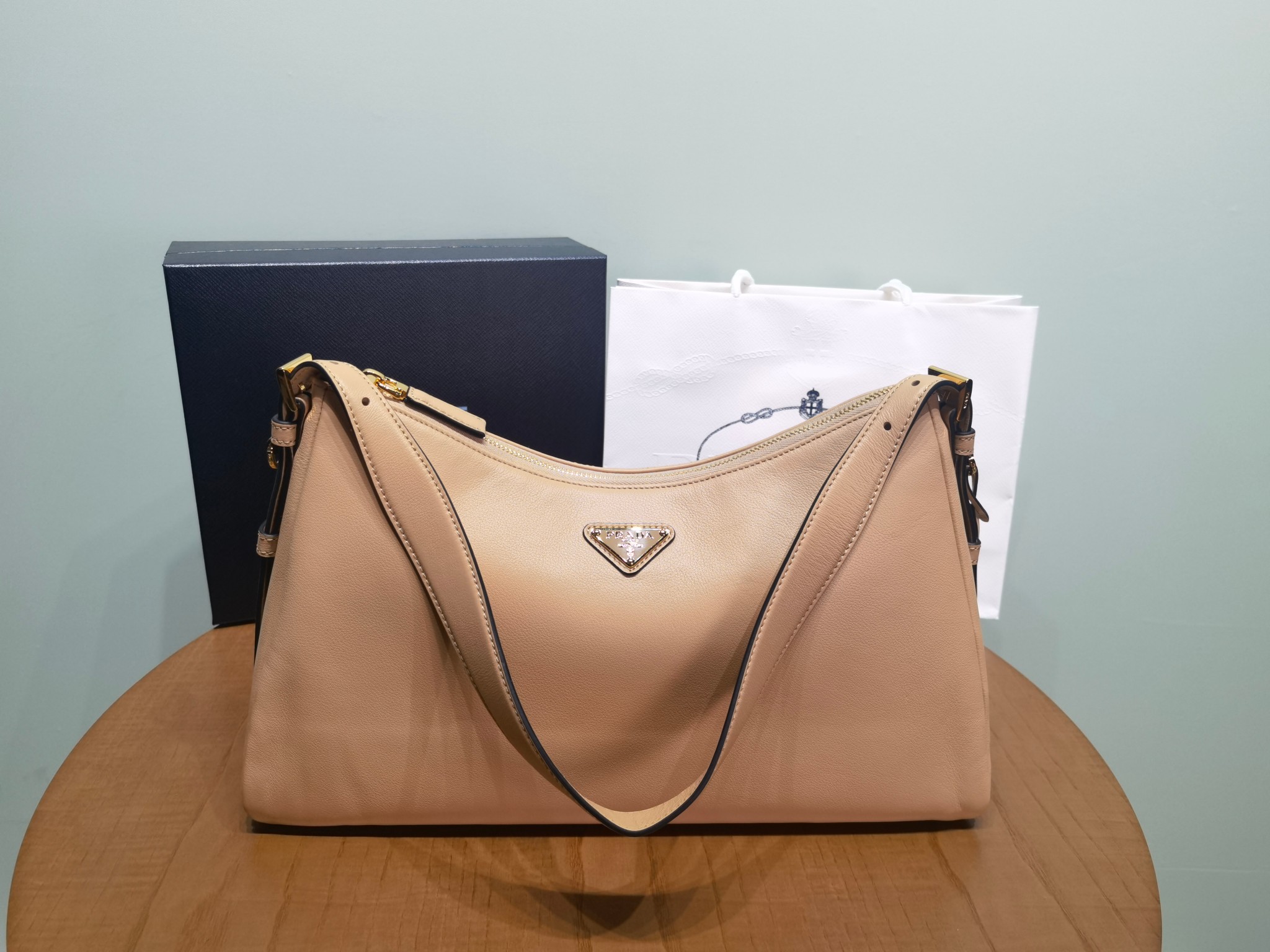 This is a replica Prada Aimée 1BC228 large leather shoulder bag. ,With adjustable leather handles. Minimum drop 38 cm – Maximum drop 28 cm,Detachable keychain,Metal hardware accessories,Enameled metal triangle logo on the front,Zipper closure,Nappa leather lining with two interior pockets, one with zipper,