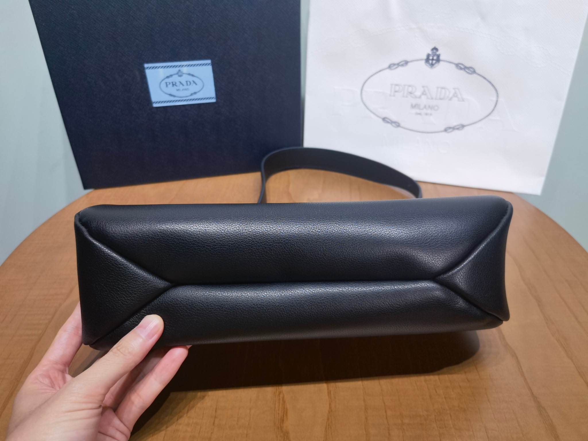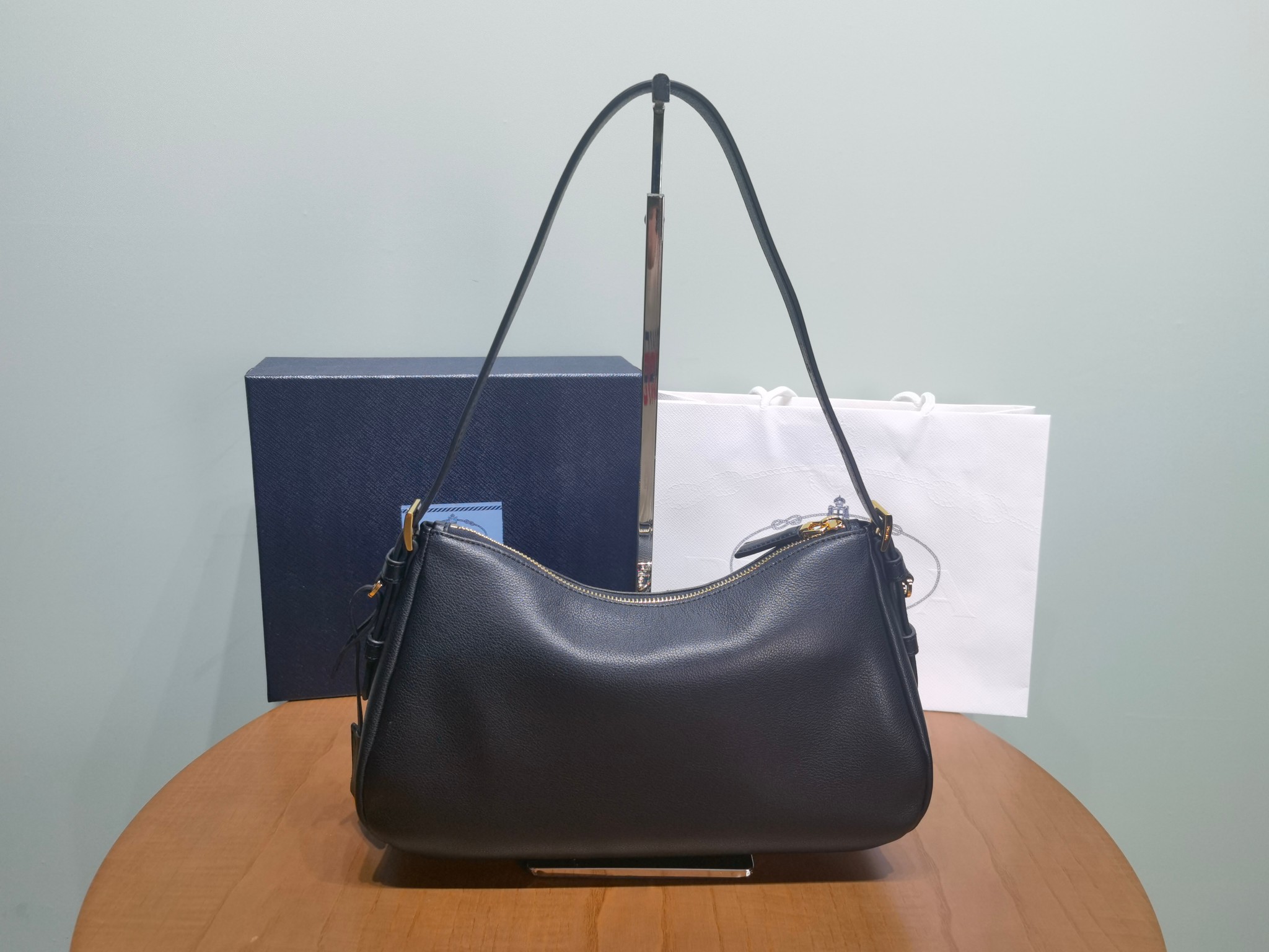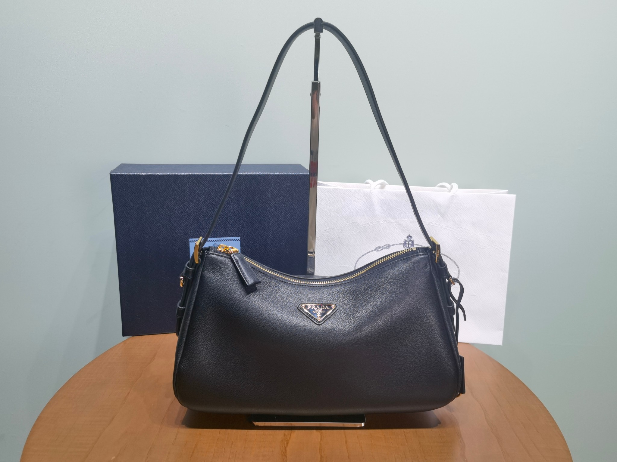 This is a replica Prada Aimée 1BC229 medium leather shoulder bag. ,Leather handle,Removable key holder,Metal hardware,Enamelled metal triangle logo on the front,Zipper closure,Nappa leather interior with two pockets, including one with zipper closure,Height: 18cm,Width: 31cm,Length: 10cm