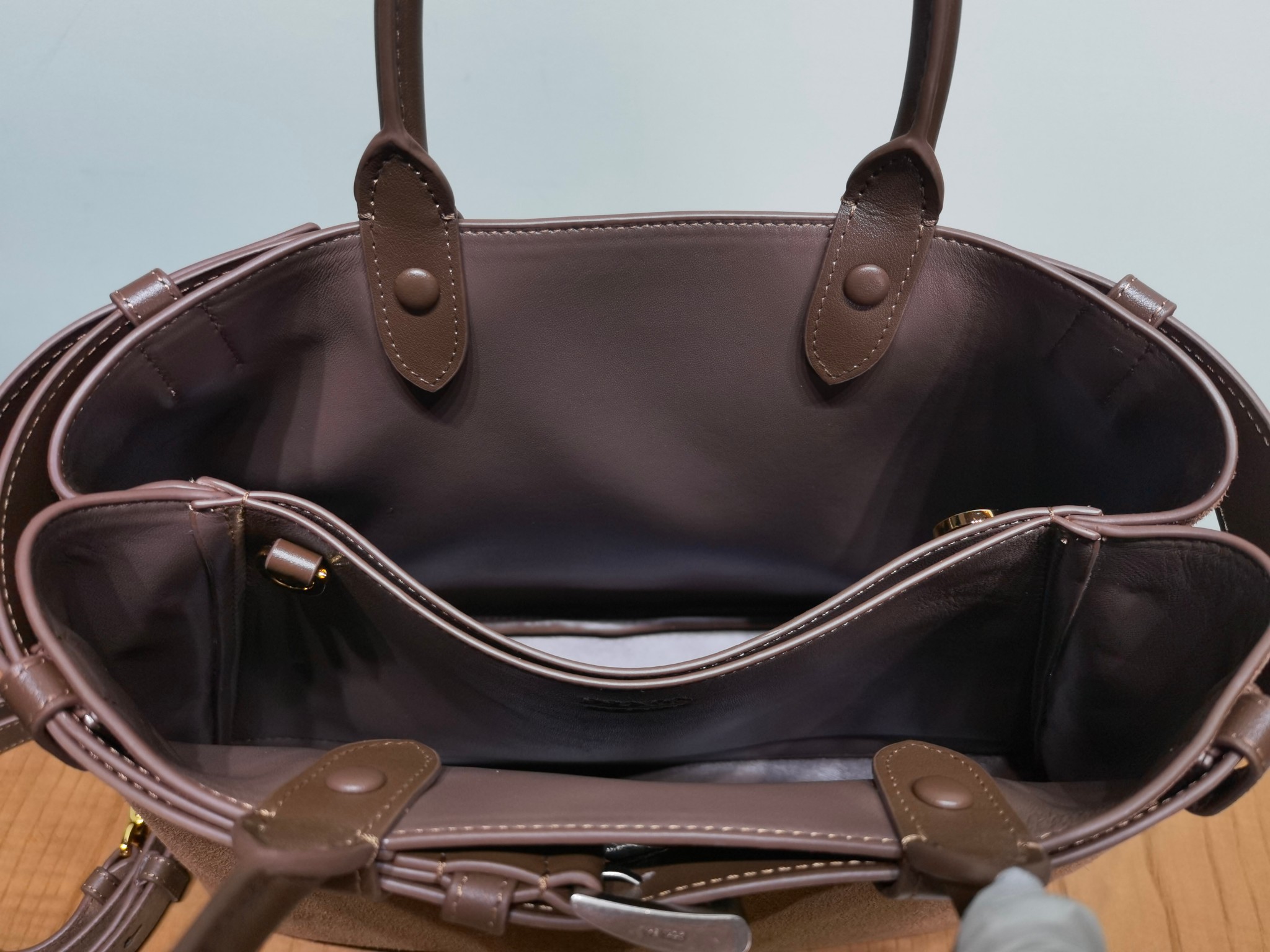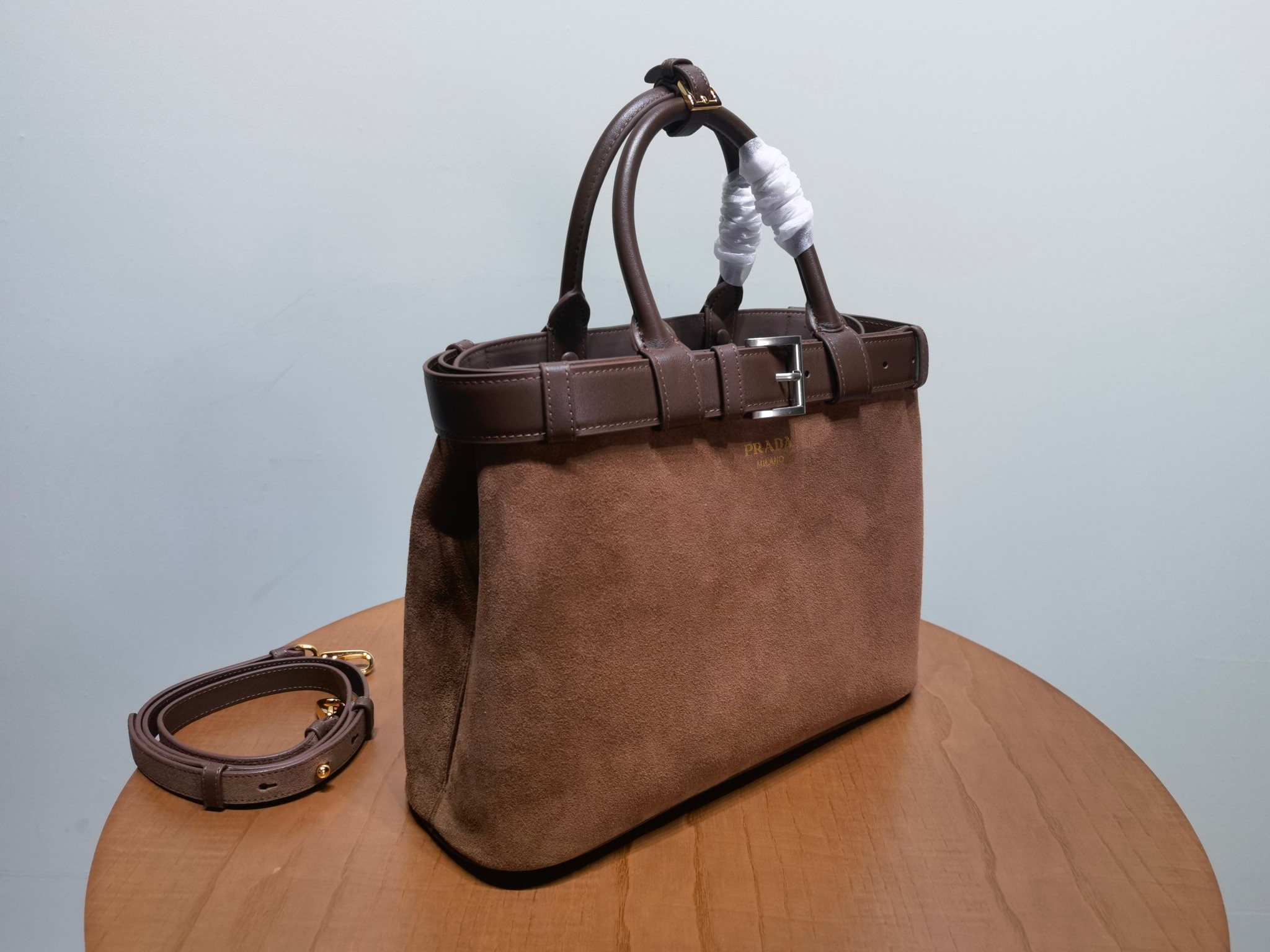 This is a replica Prada Buckle 1BA417 Medium Suede Leather Drawstring Bag. ,Decorative buckle strap,Leather handle,Removable and adjustable leather shoulder strap Maximum length 110 cm – Minimum length 100 cm – Maximum drop 55 cm – Minimum drop 50 cm,Metal hardware accessories,Front printed lettering logo,Nappa leather lining with middle pocket,