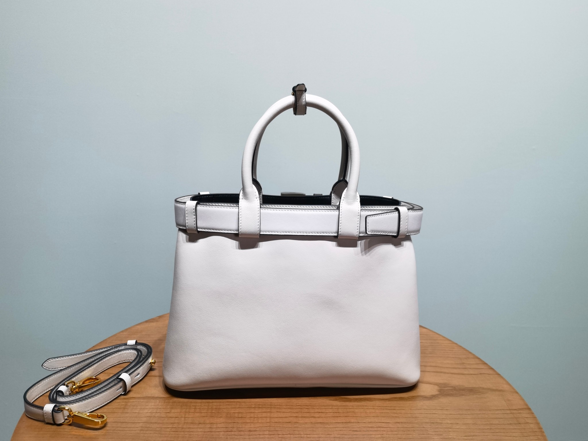 This is a replica Prada Buckle 1BA434 Small Leather Drawstring Bag. ,Buckle decorative belt,Leather handle,Removable and adjustable leather shoulder strap Maximum length 110 cm – Minimum length 100 cm – Maximum drop 55 cm – Minimum drop 50 cm,Metal hardware accessories,Leather front with embossed logo lettering,Nappa leather lining with middle pocket,