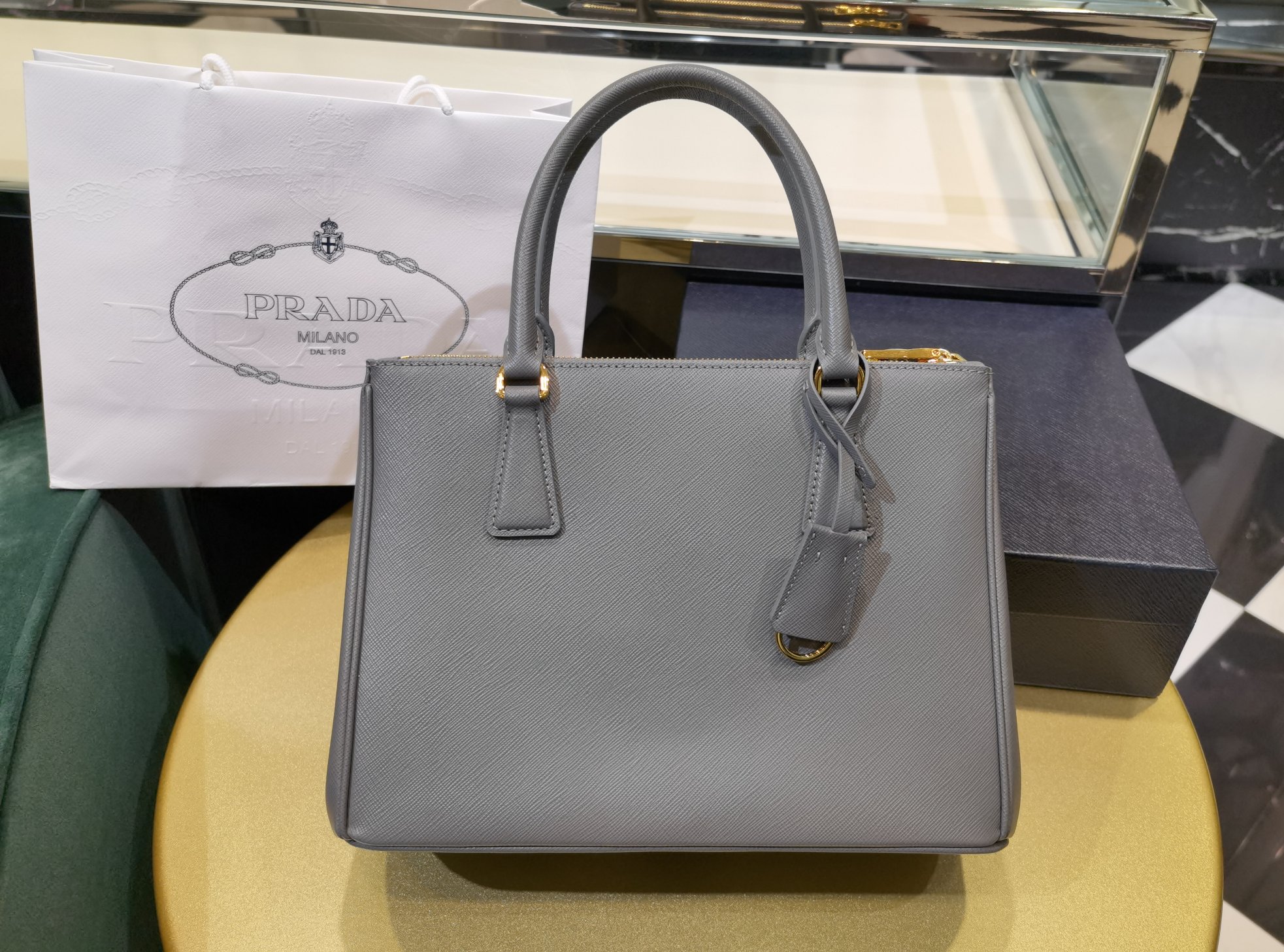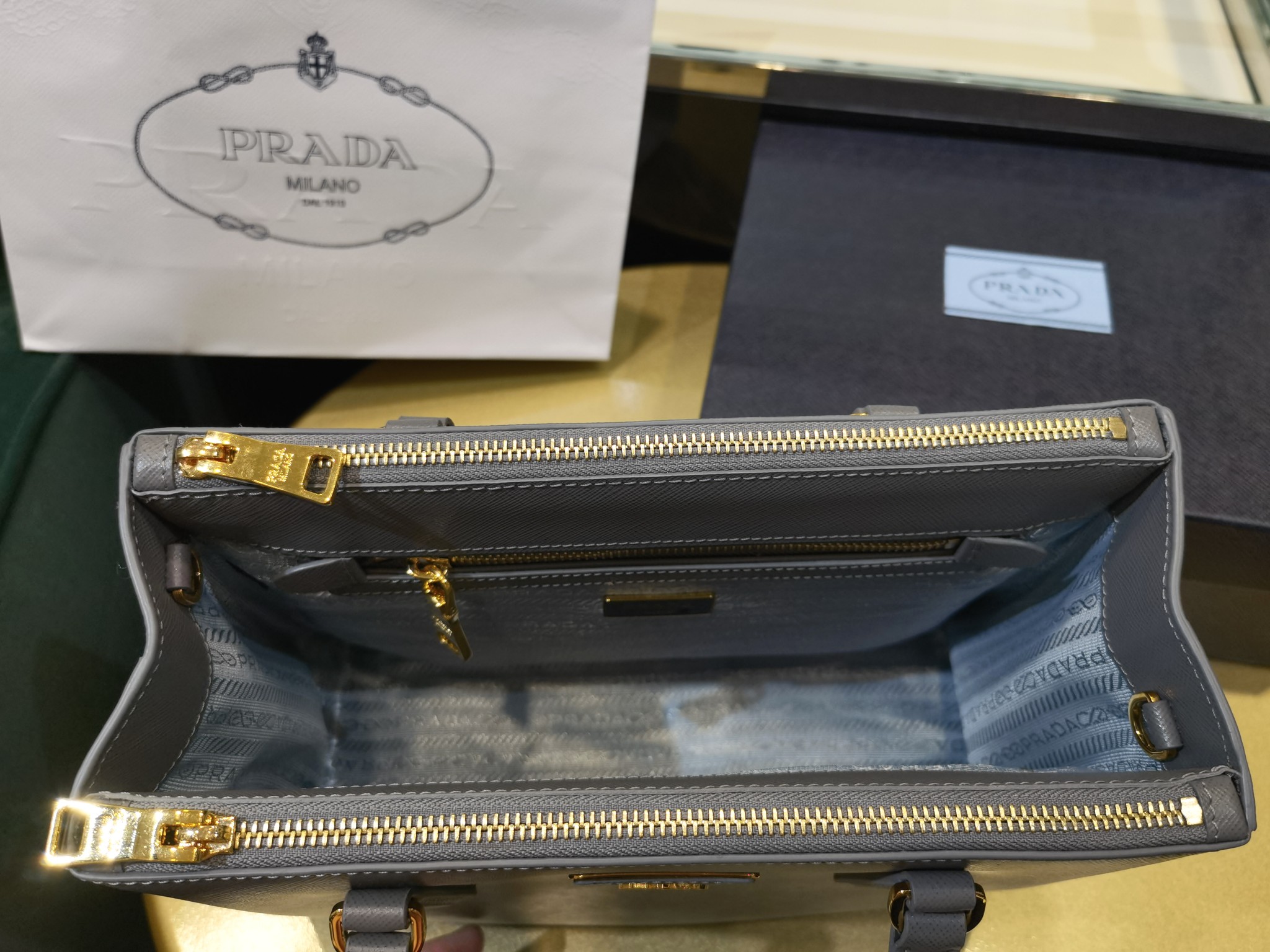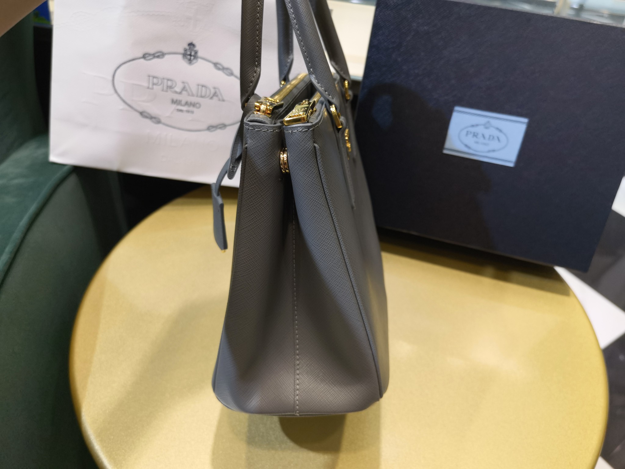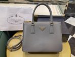 This is a replica Prada Galleria 1BA863 medium leather bag. ,Leather handles,Detachable, adjustable leather shoulder strap. Max. length: 120 cm – Min. length: 110 cm – Max. drop length: 60 cm – Min. drop length: 55 cm,Removable leather key ring,External zipper pockets,Metal hardware,Leather triangle with metal lettering logo on the front,Snap closure on the sides,Logo-print nylon lining with two pockets, including one with zipper,With purse feet,Height: 19.5cm,Width: 28cm,Length: 12cm