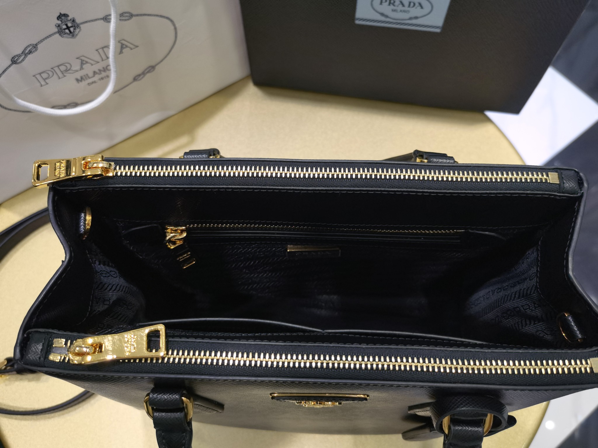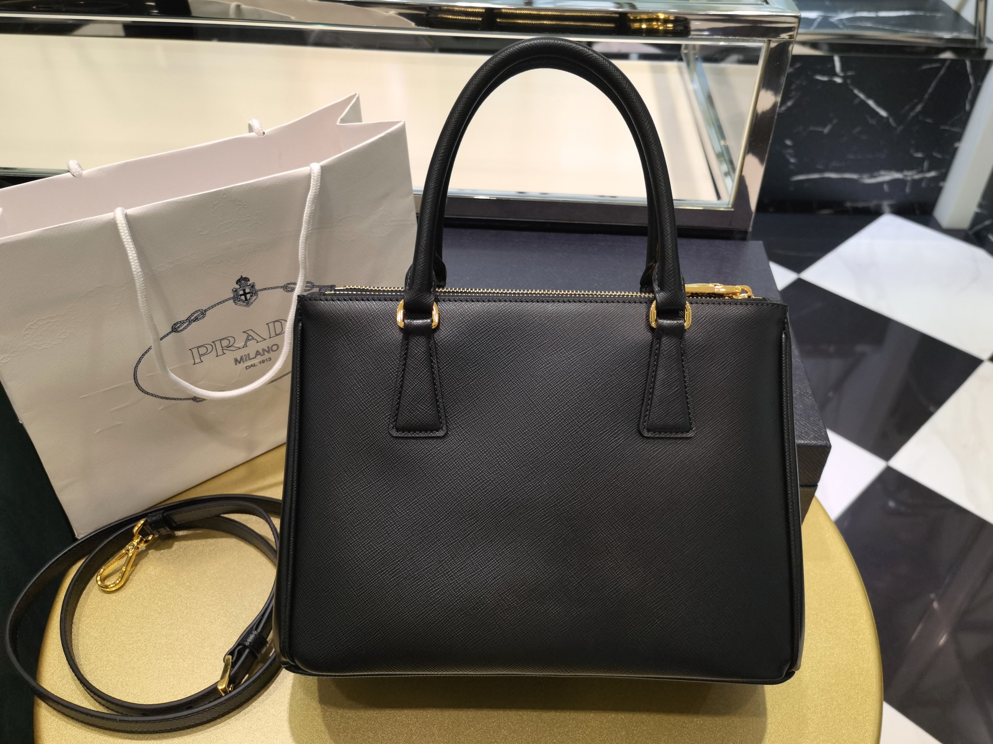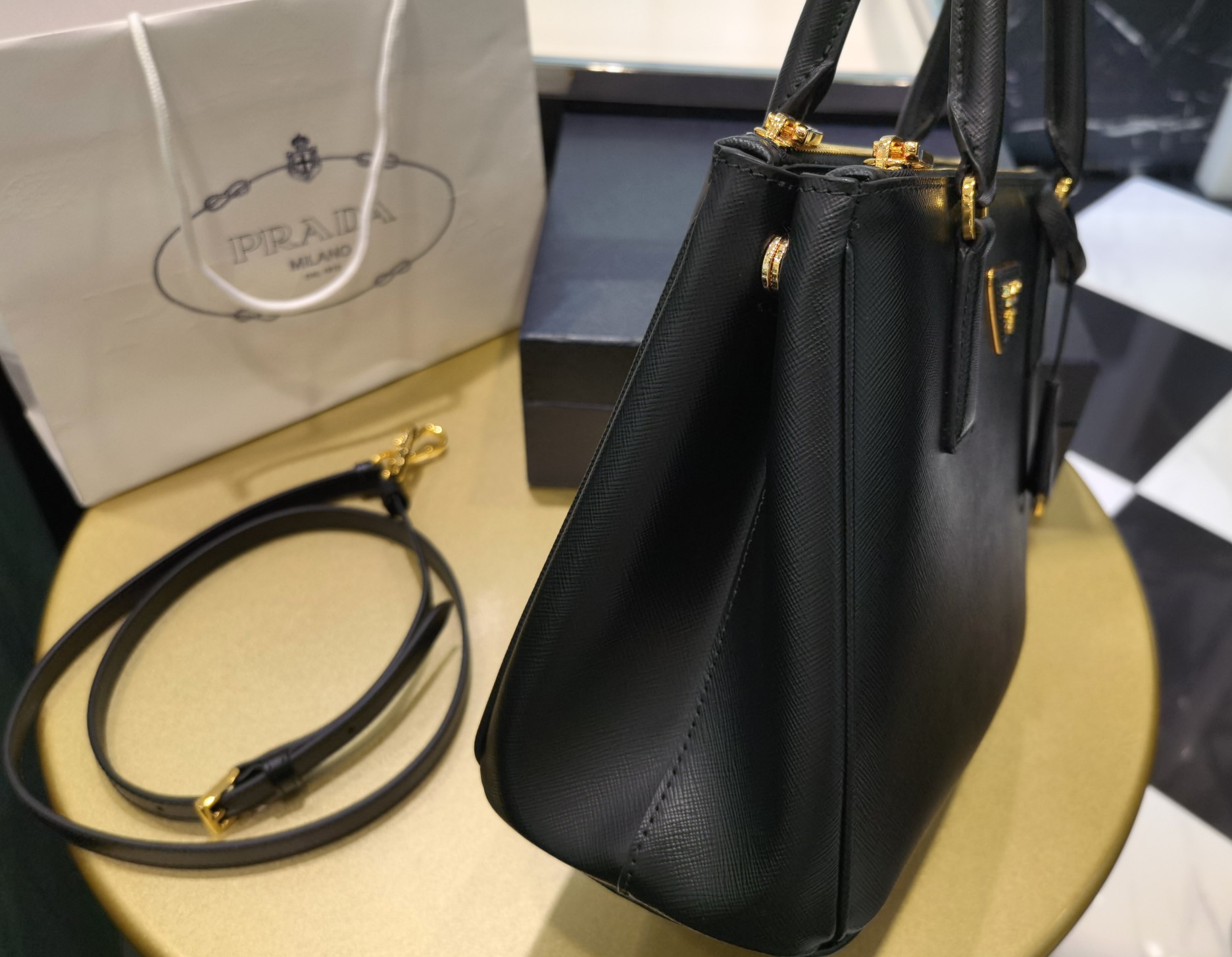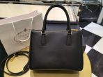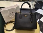 This is a replica Prada Galleria 1BA863 medium leather bag. ,Leather handles,Detachable, adjustable leather shoulder strap. Max. length: 120 cm – Min. length: 110 cm – Max. drop length: 60 cm – Min. drop length: 55 cm,Removable leather key ring,External zipper pockets,Metal hardware,Leather triangle with metal lettering logo on the front,Snap closure on the sides,Logo-print nylon lining with two pockets, including one with zipper,With purse feet,Height: 19.5cm,Width: 28cm,Length: 12cm