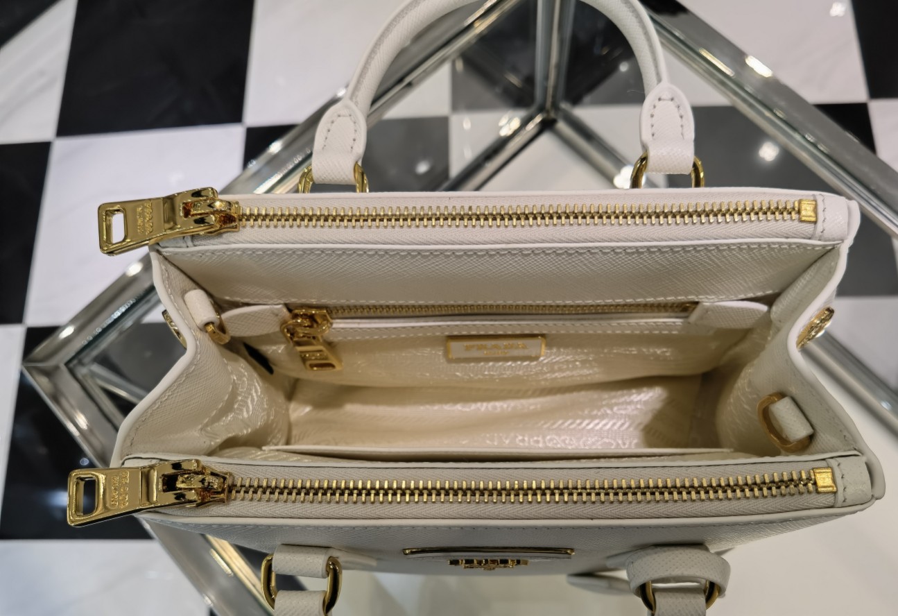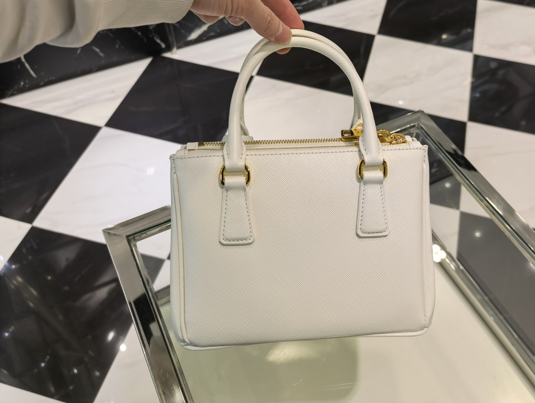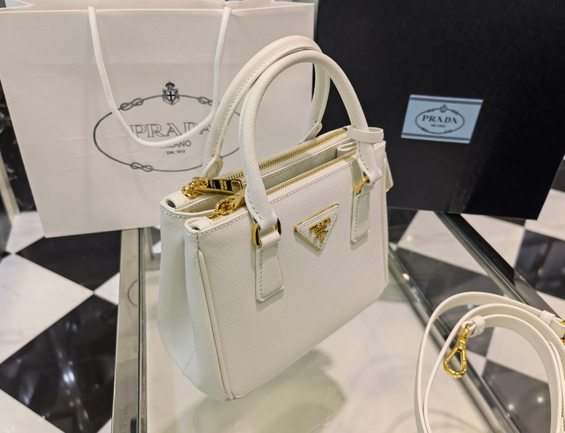 This is a replica Prada Galleria 1BA906 Saffiano leather mini-bag. ,Leather handles,Detachable, adjustable leather shoulder strap. Max. length: 120 cm – Min. length: 110 cm – Max. drop length: 60 cm – Min. drop length: 55 cm,Removable leather key ring,External zipper pockets,Metal hardware,Leather triangle with metal lettering logo on the front,Snap closure on the sides,Logo-print nylon lining with two pockets, including one with zipper,With purse feet,Height: 14.5cm,Width: 20cm,Length: 9.5cm