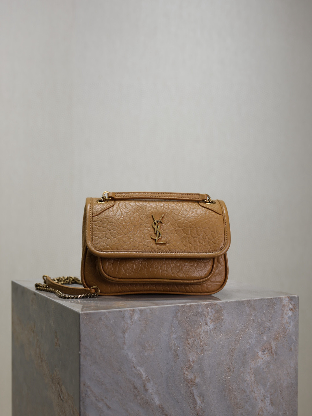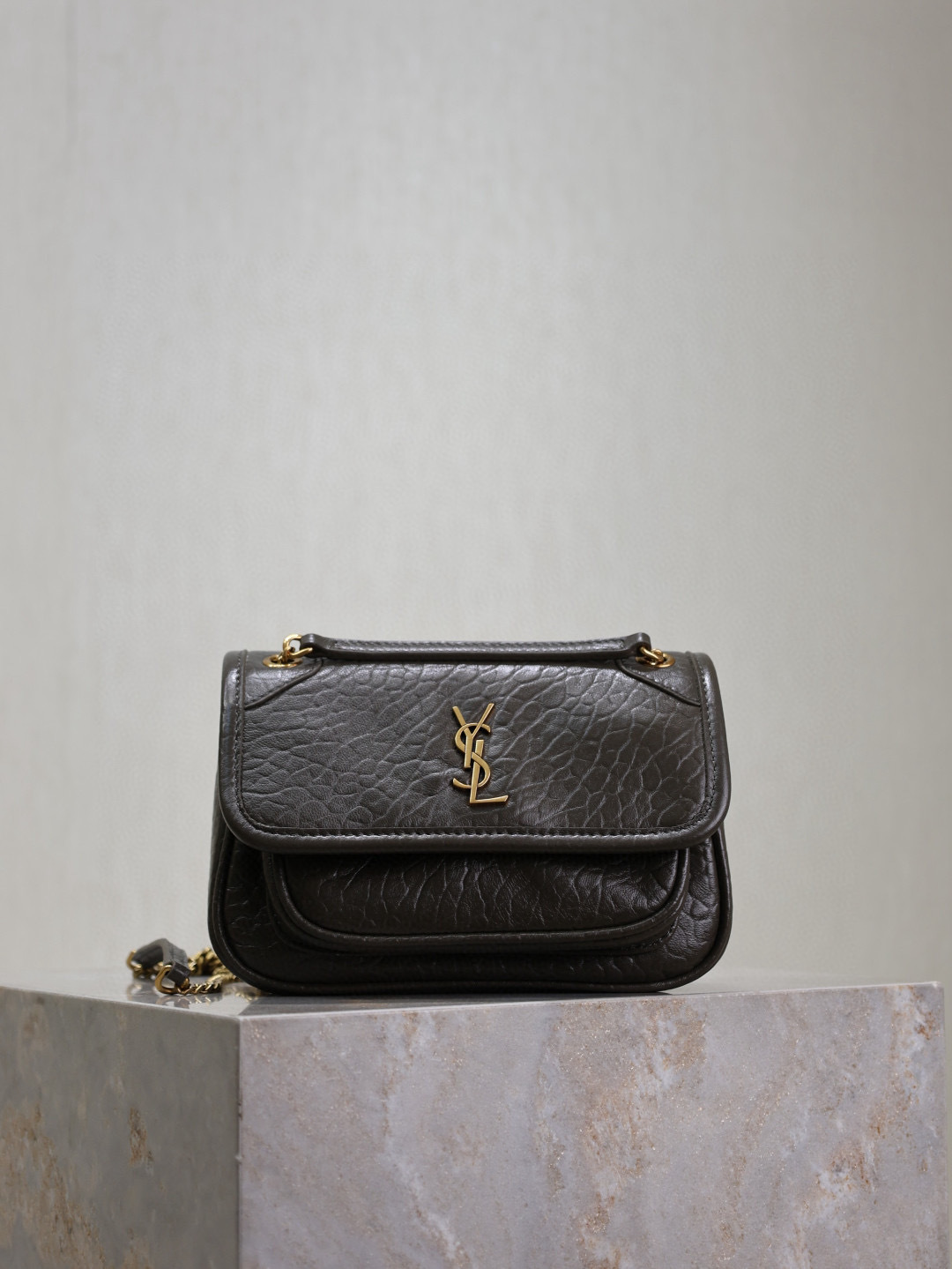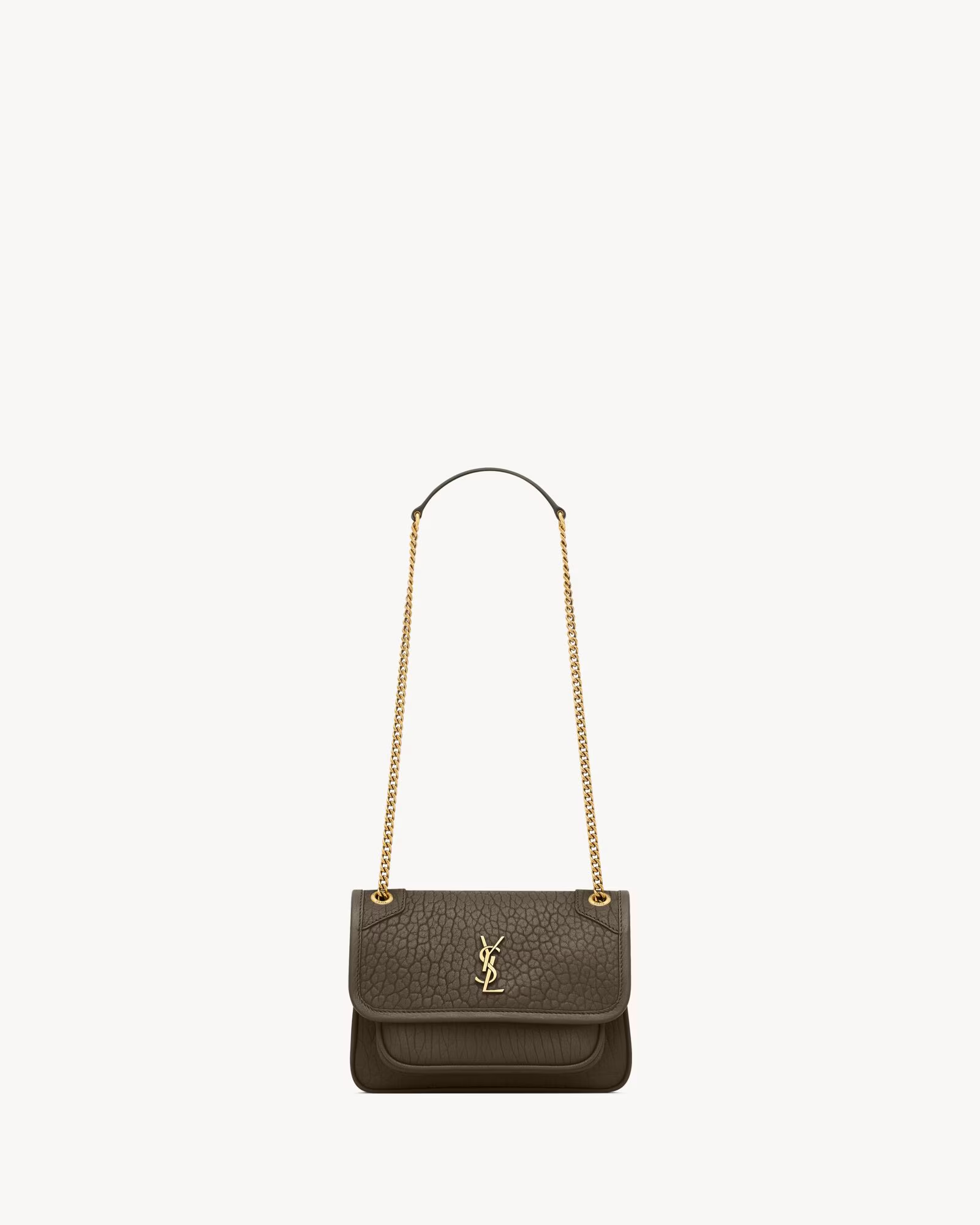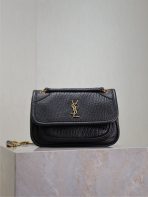 This is an replica SAINT LAURENT NIKI mini in grained lambskin.,This practical, lightweight bag features two main compartments and a back pocket.,A sliding chain strap provides both shoulder and crossbody carry options.,